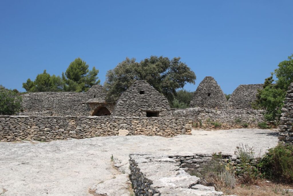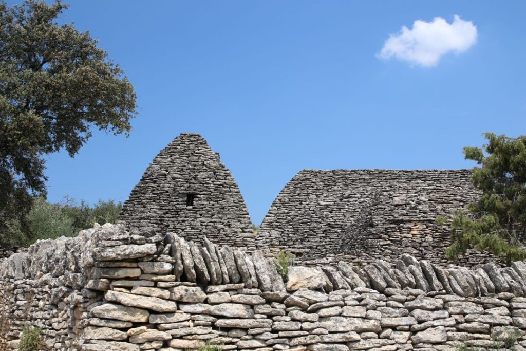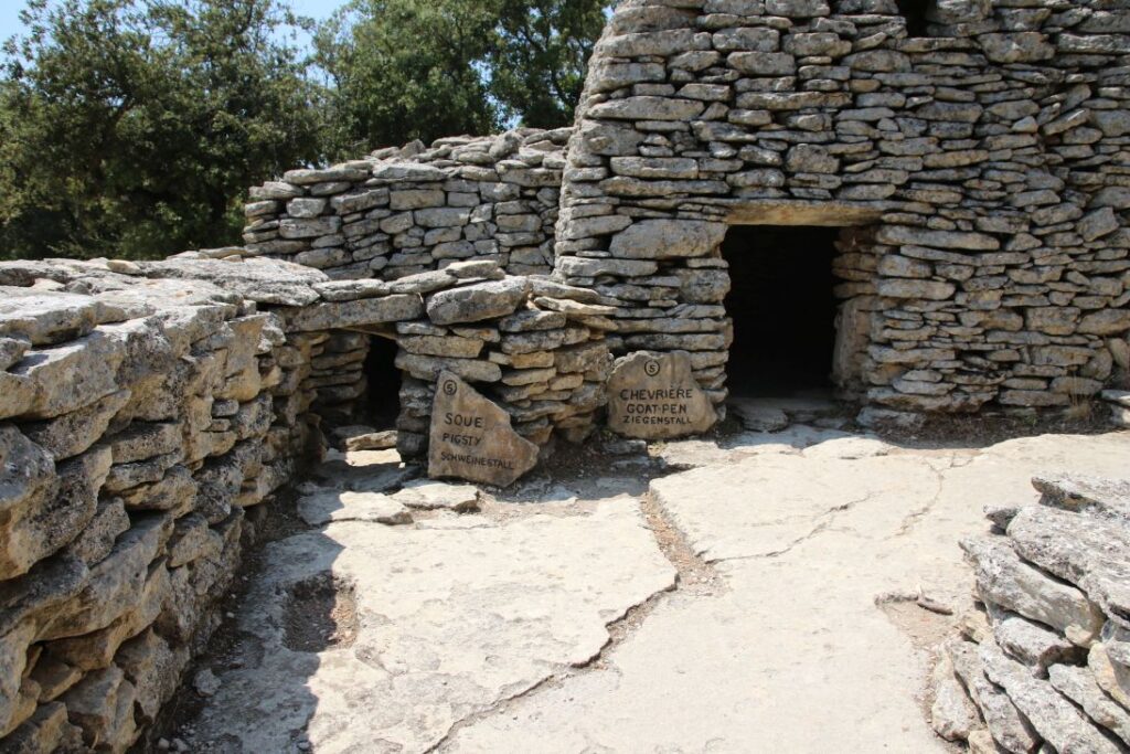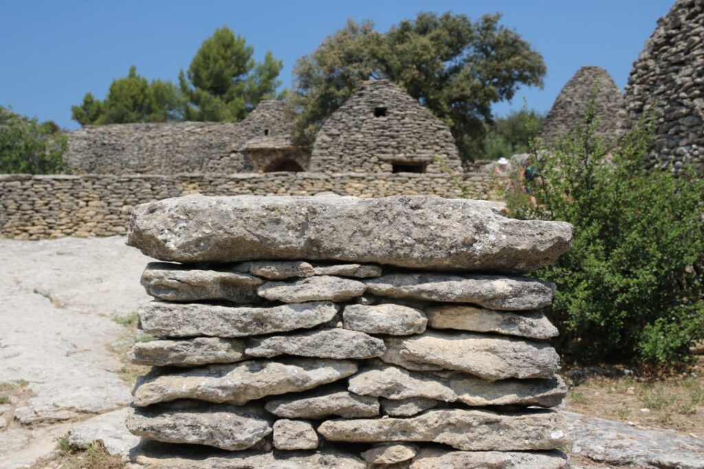 Die „Bories“ sind kleine Häuser, die zur Gänze aus Stein gebaut sind – ohne Lehm, Mörtel oder einem anderen Bindemittel. Eine vergleichbare Architektur gibt es auf der ganzen Welt kein zweites Mal, Historiker und Archäologen sind sich auch nicht sicher, wann genau die Häuser entstanden sind. Es gibt Backöfen, Wohnhäuser, Schweine- und Schafställe. Es ist brütend heiß, wir marschieren relativ rasch durch das Dorf, das aus zehntausenden Steinen besteht.