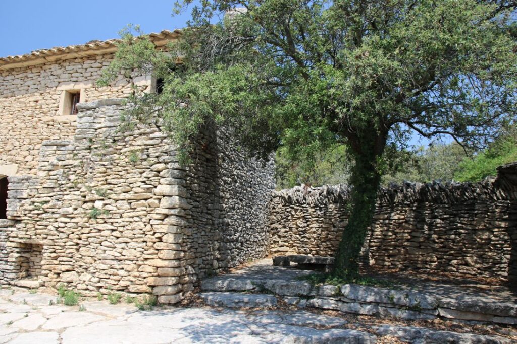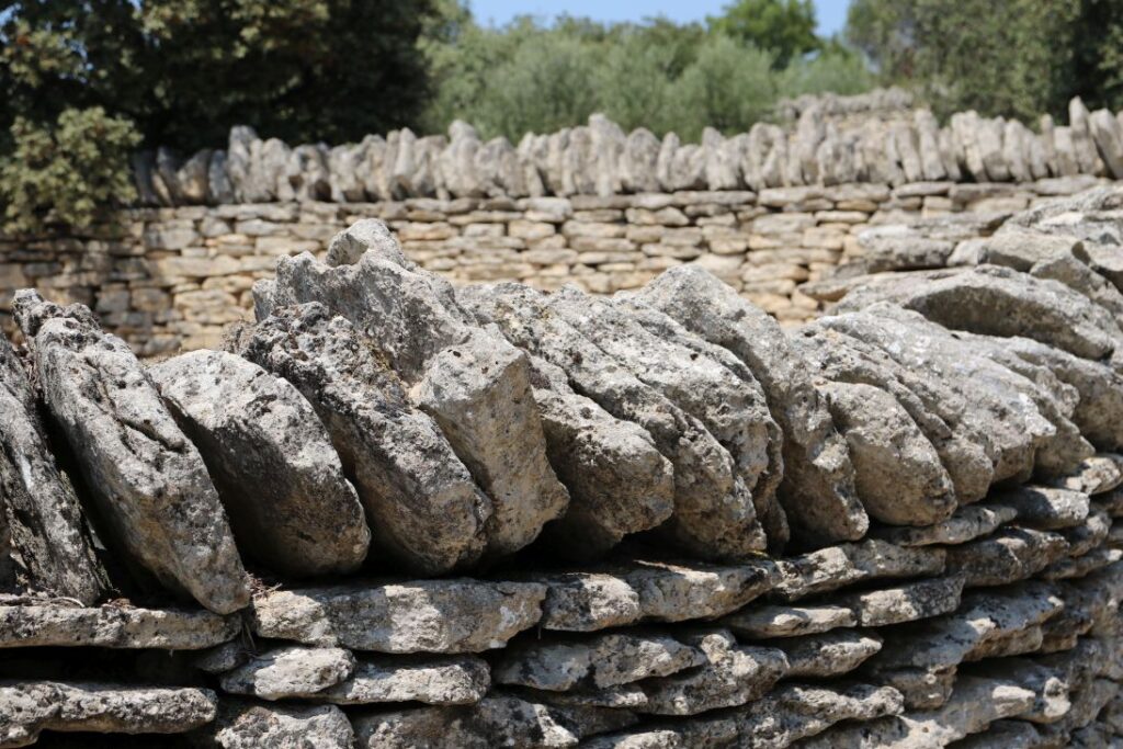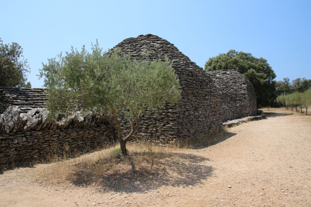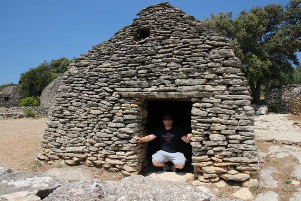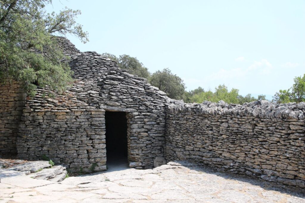 Die „Bories“ sind kleine Häuser, die zur Gänze aus Stein gebaut sind – ohne Lehm, Mörtel oder einem anderen Bindemittel. Eine vergleichbare Architektur gibt es auf der ganzen Welt kein zweites Mal, Historiker und Archäologen sind sich auch nicht sicher, wann genau die Häuser entstanden sind. Es gibt Backöfen, Wohnhäuser, Schweine- und Schafställe. Es ist brütend heiß, wir marschieren relativ rasch durch das Dorf, das aus zehntausenden Steinen besteht.