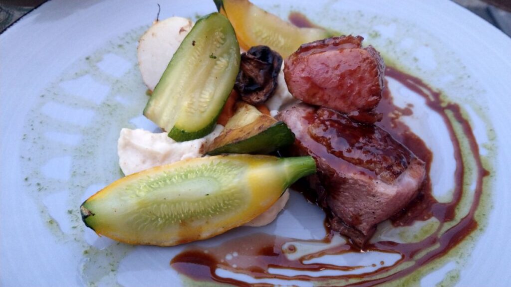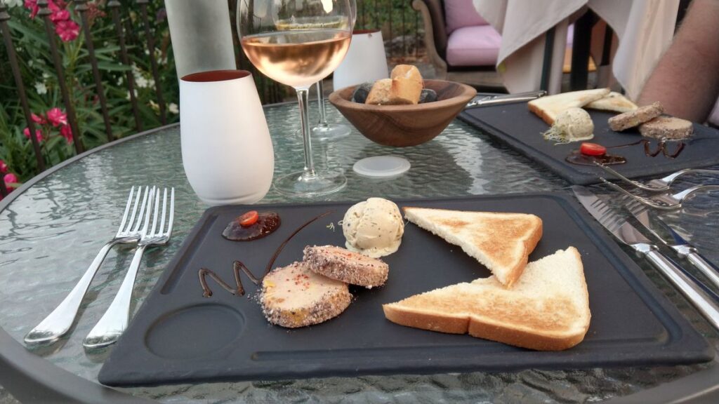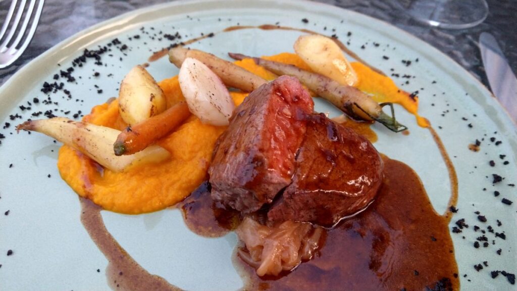 Wir essen im Hotelrestaurant zu Abend und lassen den gemütlichen und entspannenden Tag mit gutem Essen und Wein ausklingen.