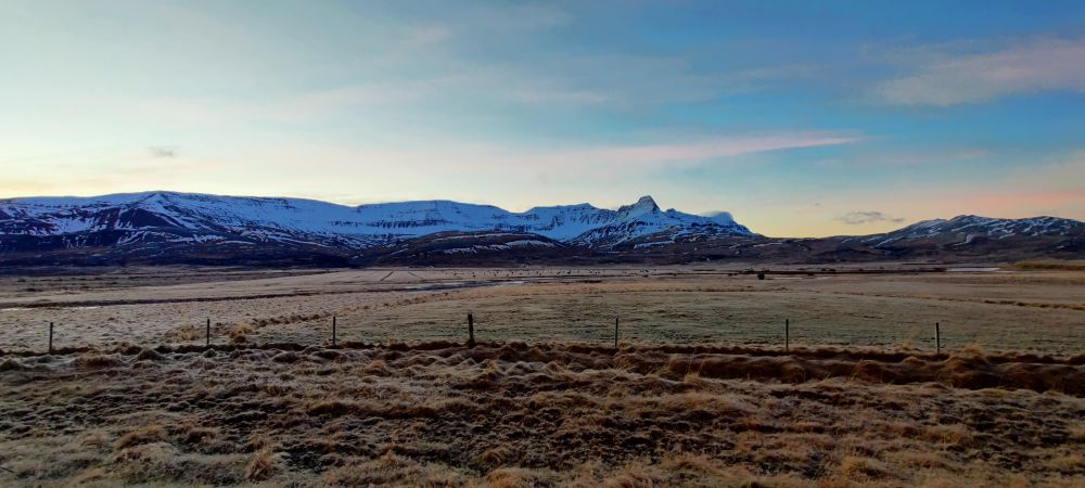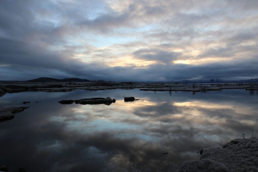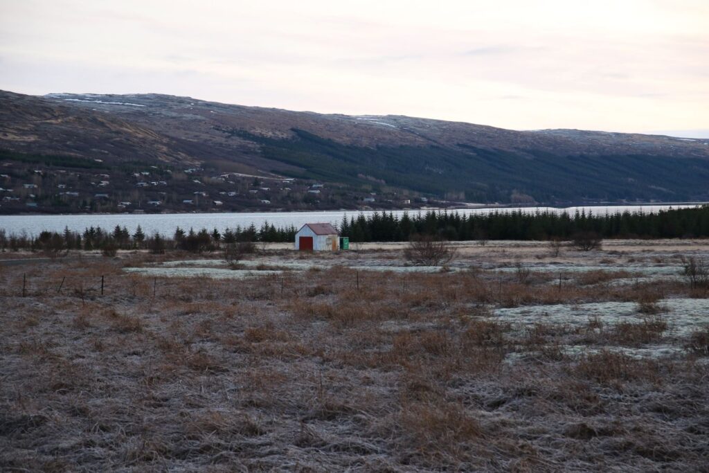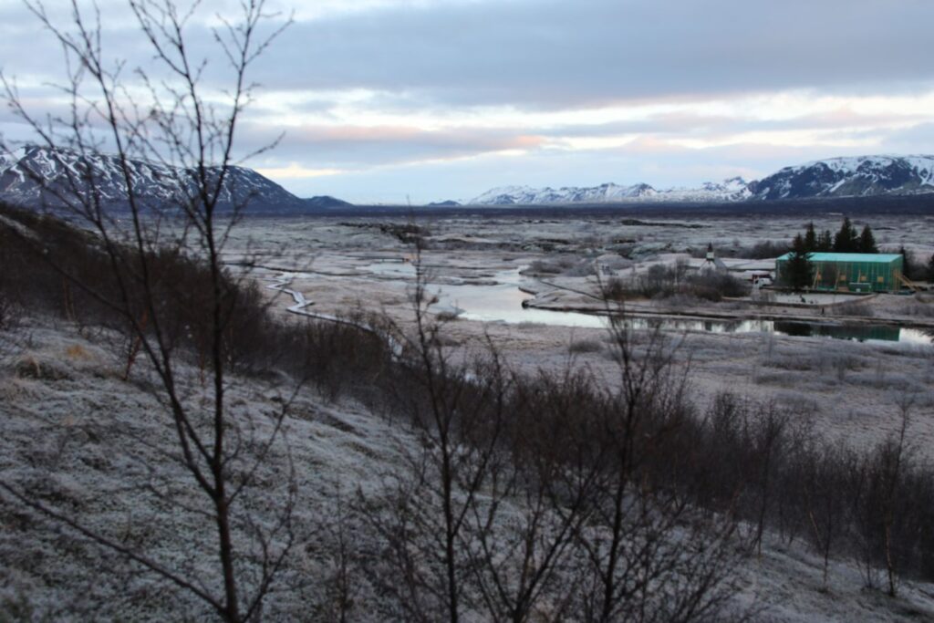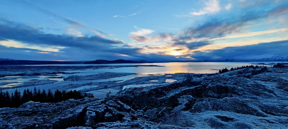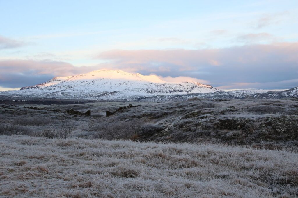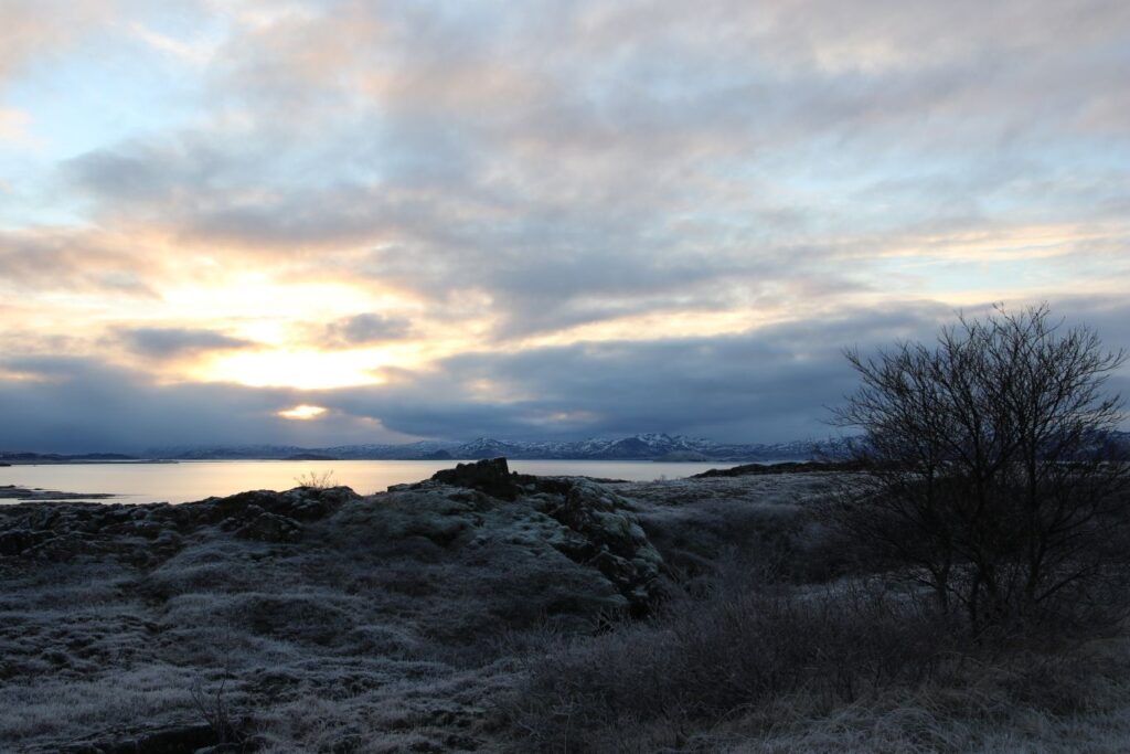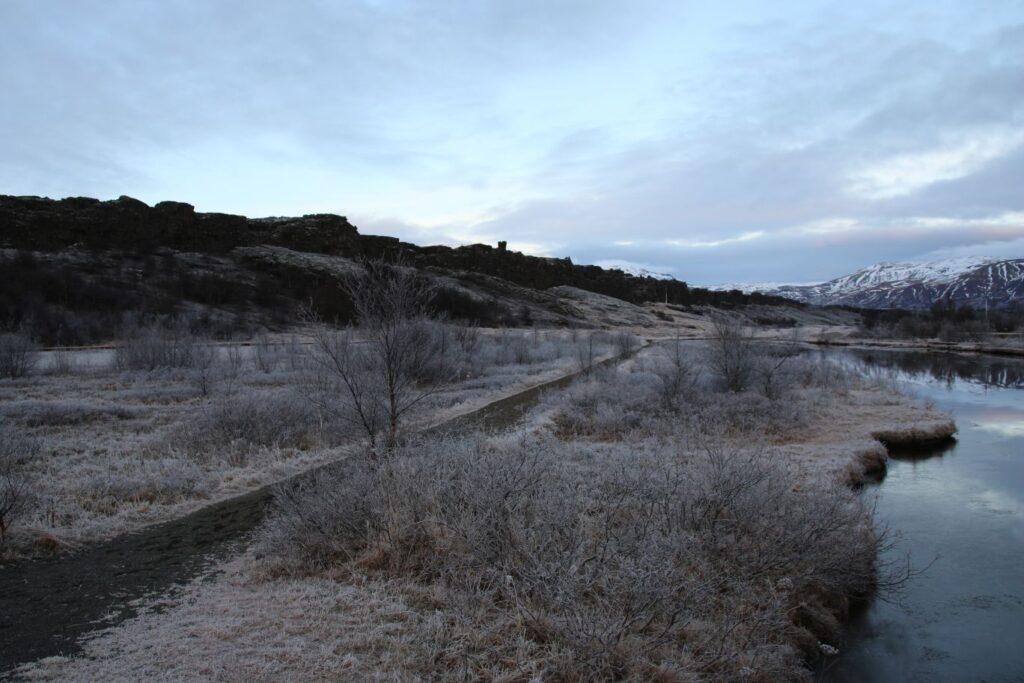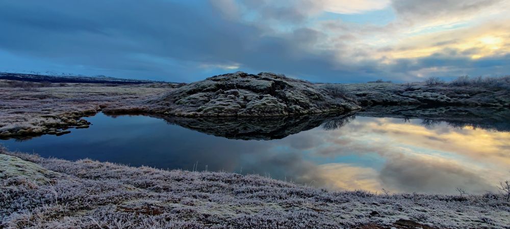Das heutige Frühstück ist großartig. Es gibt verschiedene Brotsorten, von Knäckebrot bis zu selbst gebackenem Ölbrot, rohen Fisch mit scharfer Dill-Senfsauce, Pesto, geräuchertes Lamm, Lamm-Pastete und vieles mehr. Gestärkt starten wir in den Tag. Es ist kurz nach 9:00 Uhr und noch stockfinster. Lediglich im Osten sehen wir die Ahnung eines Sonnenaufganges. Es hat auf -4°C abgekühlt, das Auto ist zur Gänze vereist. Wir checken aus, denn auch heute haben wir viel vor. 280 Kilometer werden uns ins Landesinnere zum „Golden Circle“ mit Þingvellir National Park, Wasserfall Gullfoss, Geysiren und in das älteste Schwimmbad Islands führen. Wir weichen ab Borgarnes von der geplanten Strecke ab, da wir den anderen Weg gestern schon gefahren sind. Die Strecke ist zwar knapp eine halbe Stunde länger, aber landschaftlich einmalig. Wir treffen Islandpferde, umrunden den Hvalfjörður, fahren über Schotterpisten und sehen Vulkane, Berge und viel Raureif.
