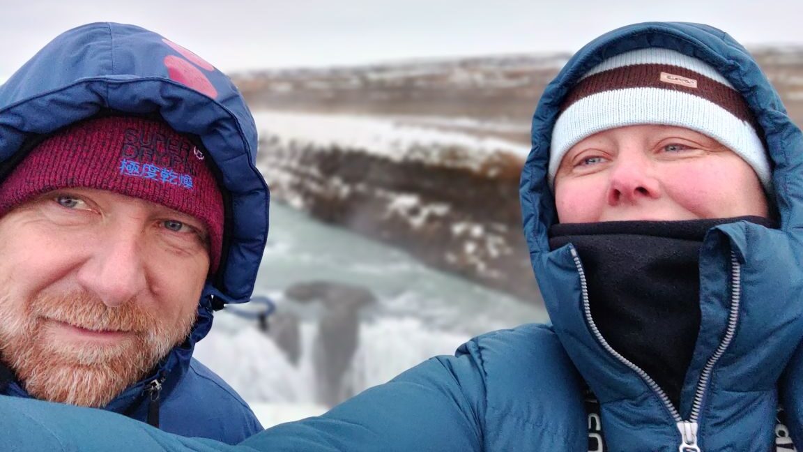 Die Straße führt uns weitere 70 Kilometer ins Landesinnere zu einem der imposantesten Wasserfälle Islands, den Gullfoss. Das Wasser des Hvítá-Flusses entspringt vom Gletscher Langjökull, bevor es 32 Meter tief über die beiden Stufen des Gullfoss hinunterstürzt. Aufgrund der zwei Stufen des Wasserfalls sollte der Gullfoss eigentlich als zwei getrennte Elemente betrachtet werden. Die erste, kürzere Kaskade ist 11 Meter hoch, während der zweite Sturz 21 Meter beträgt. Die Schluchtwände auf beiden Seiten des Wasserfalls erreichen eine Höhe von bis zu 70 Metern und führen in den großen Gullfossgjúfur-Canyon hinab. Geologen glauben, dass dieser Canyon durch Gletscherschmelzen zu Beginn der letzten Eiszeit entstanden ist. Im Sommer strömen jede Sekunde etwa 140 Kubikmeter Wasser den Wasserfall hinunter. Es ist arktisch kalt, der Wind bläst die Gischt meterweit und das Wasser gefriert sofort, wenn es zu Boden fällt. Wir bleiben nur kurz hier, sind aber beeindruckt von diesem mächtigen Wasserfall.