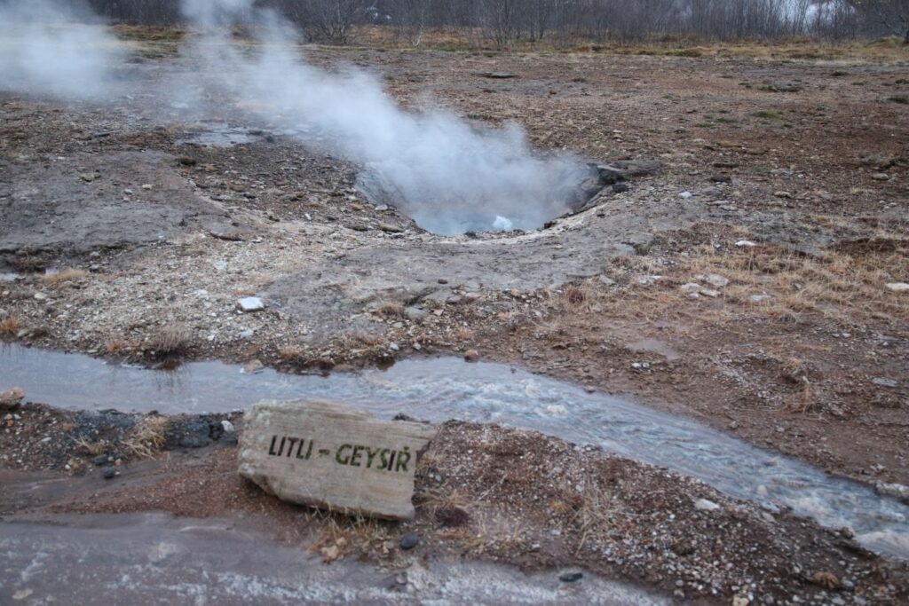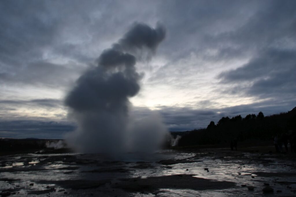 Auf dem Weg zurück machen wir noch einen Zwischenstopp in Haukadalur. Zu finden ist dort der Geysir, der vor allem dafür bekannt ist, dass er Geysiren auf der ganzen Welt seinen Namen verliehen hat. Sein „Nachbar“ Strokkur ist wohl die berühmteste heiße Quelle des Landes und schießt mächtige Strahlen kochenden Wassers in Höhen von 20 bis zu 40 Metern. Strokkur bricht alle fünf bis zehn Minuten aus – beeindruckend.