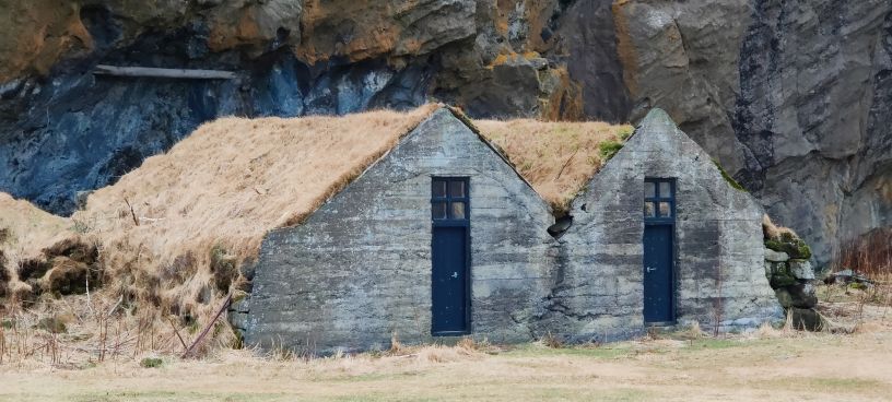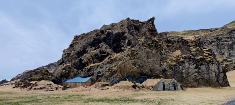 Wir stärken uns mit einem flotten Frühstück und brechen auf. Heute haben wir die längste Strecke unseres Urlaubs vor uns. 380 Kilometer trennen uns von Reykjavík, rund fünf Stunden Fahrtzeit. Unsere beiden Zwischenstopps sind bereits eingerechnet: Der Vulkankrater Kerið und die heißen Quellen von Reykjadalur. Auf der Fahrt kommen wir bei den Drangurinn vorbei, einer natürlichen Formation aus Tuffstein, die allein bei den Bauernhöfen in Drangshlíð unter dem Eyjafjall steht. Unter diesen Felsen befinden sich Höhlen und Durchgänge, zu denen im Laufe der Jahrhunderte zusätzlich Gebäude angelegt wurden. Laut isländischer Folklore wurde dieser riesige Felsbrocken aus den Bergen gerissen und an seinem derzeitigen Standort platziert, wo er die Heimat von Elfen wurde.