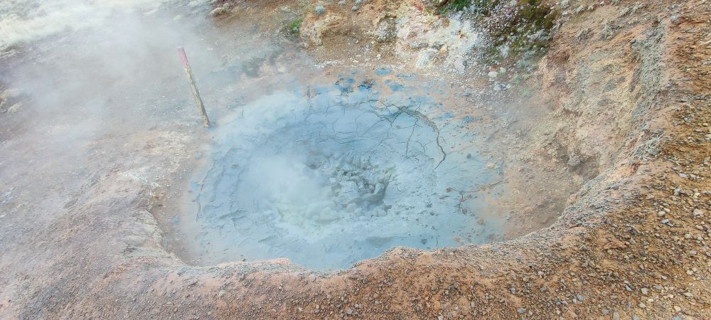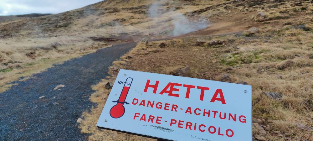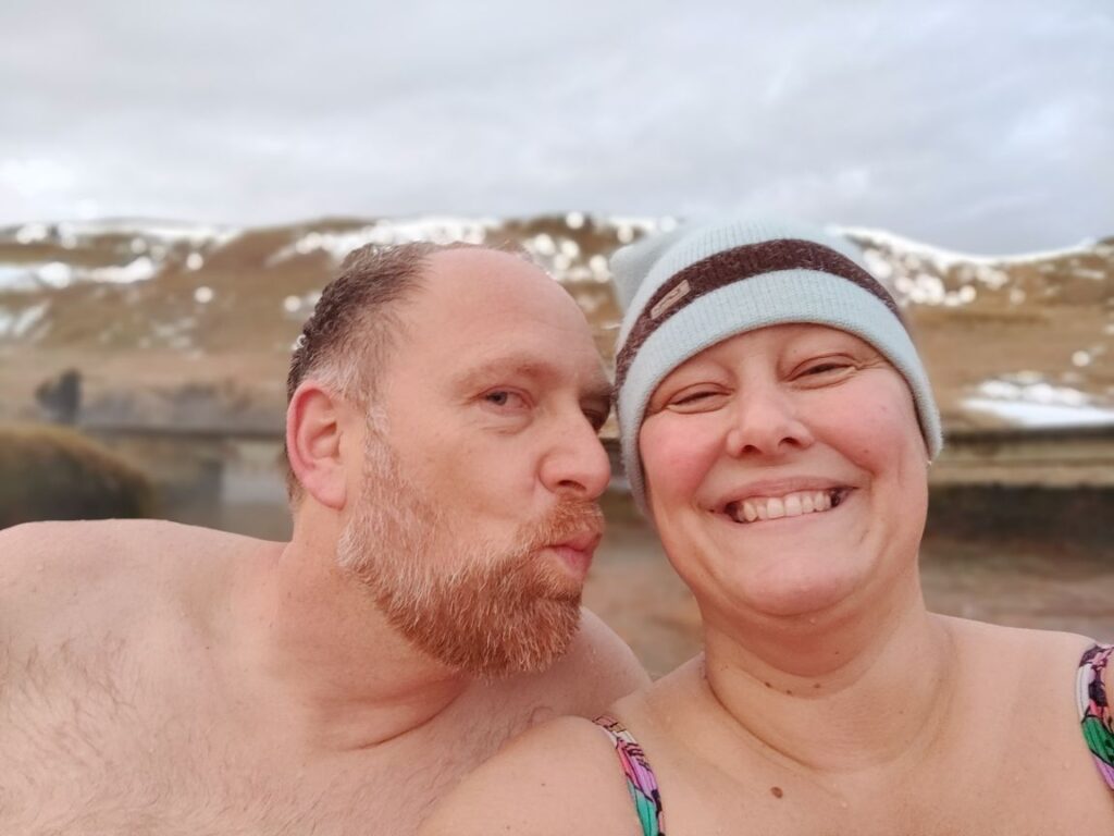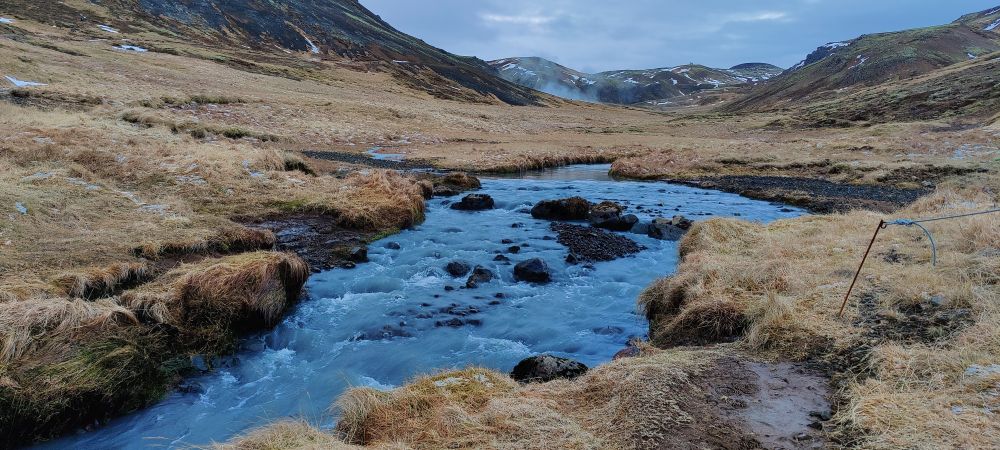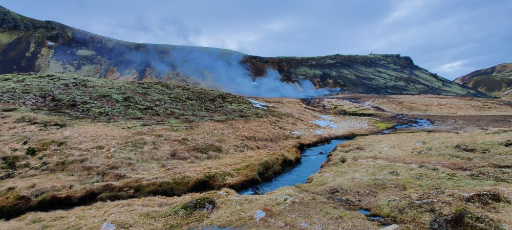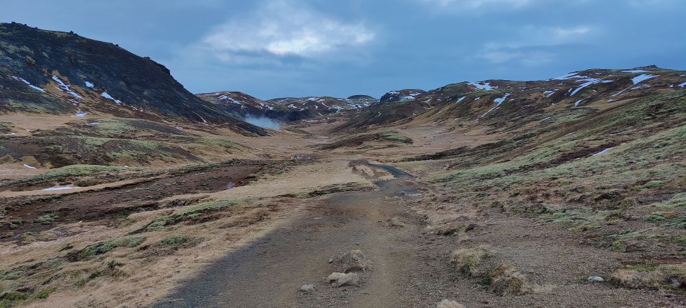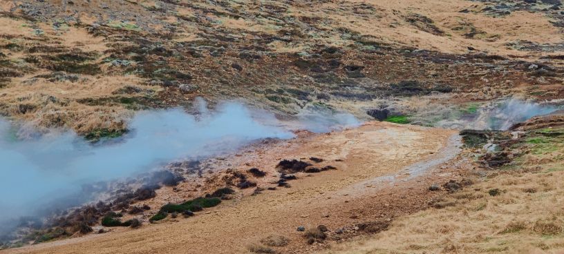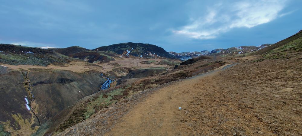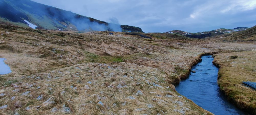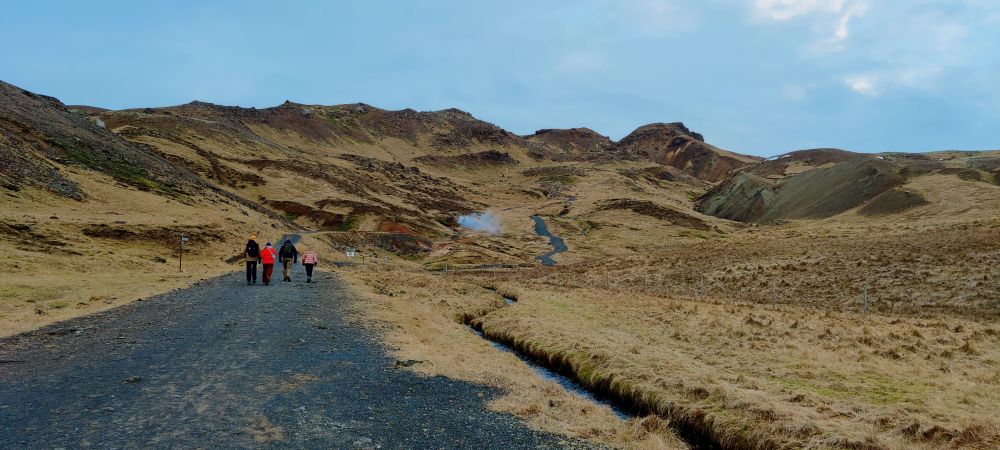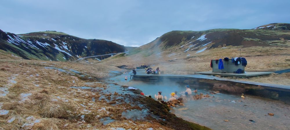 Nach einer weiteren halben Stunde Fahrt erreichen wir das Visitor Center Reykjadalur. Das Tal ist durch seine geothermale Aktivität bekannt. Es dampft überall aus der Erde und die vulkanische Aktivität Islands ist sehr präsent. Aber Reykjadalur heißt ja auch „Dampfendes Tal“. Am Ende des Tals wartet Badevergnügen in einem Fluss mit über 30 Grad Wassertemperatur. Wir packen einen Rucksack mit Badesachen und marschieren flussaufwärts. Nach 3,5 Kilometern und 260 Höhenmetern bergauf sind wir bei den „Hot Pots“ angekommen. Bei null Grad und pfeifendem Wind ziehen wir unsere warmen Sachen aus und die Badesachen an. Hinein gehts in den Fluss, der wirklich erstaunlich warm ist. Wir baden eine halbe Stunde lang, bis die Dämmerung hereinbricht. Dann kommt der schwierigste Teil: Hinaus in die Kälte, abtrocknen und in die warmen Sachen schlüpfen. Es ist kalt, aber aushaltbar. Wir haben es geschafft und fühlen uns pudelwohl. Beim Hinuntergehen wird es schon dunkel, wir haben aber unsere Stirnlampen mit und erreichen nach einer Dreiviertelstunde sicher den Parkplatz. Uneingeschräkter Tipp für alle Island-Reisenden!