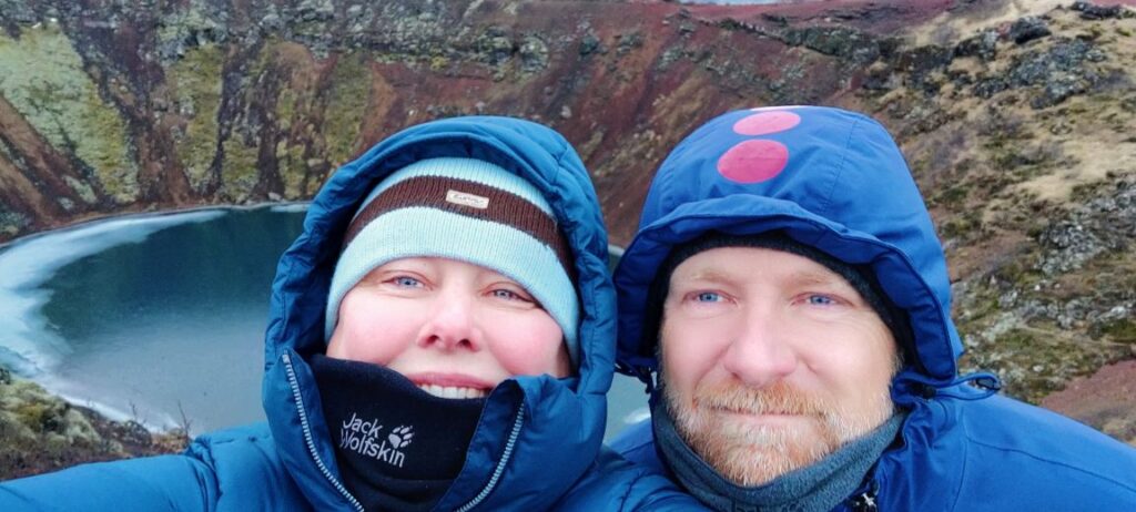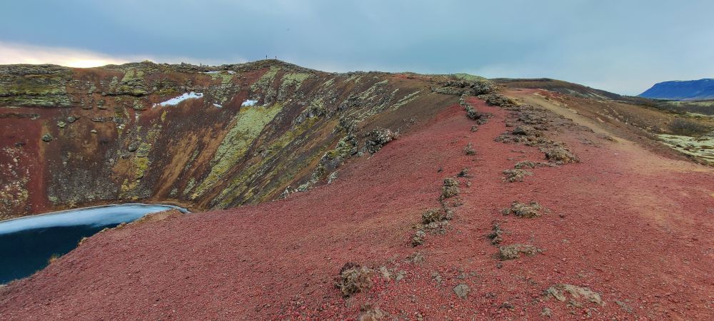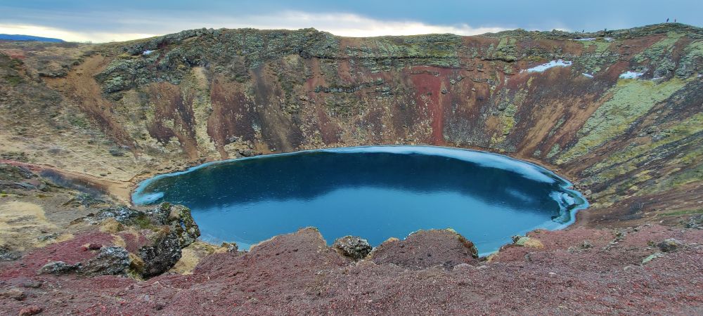 Um 13:00 Uhr erreichen wir unseren ungeplanten ersten Zwischenstopp, Kerið. Der Kratersee leuchtet türkis, der Vulkanrand hat ebenfalls eine erstaunliche Farbenpracht. Wir umrunden den gesamten Krater und steigen auch noch die Stufen zum Kratersee hinunter. Eine halbe Stunde Umweg, die sich gelohnt hat.
