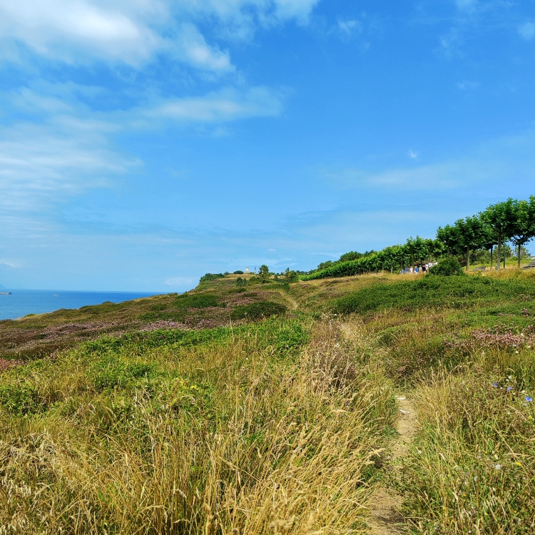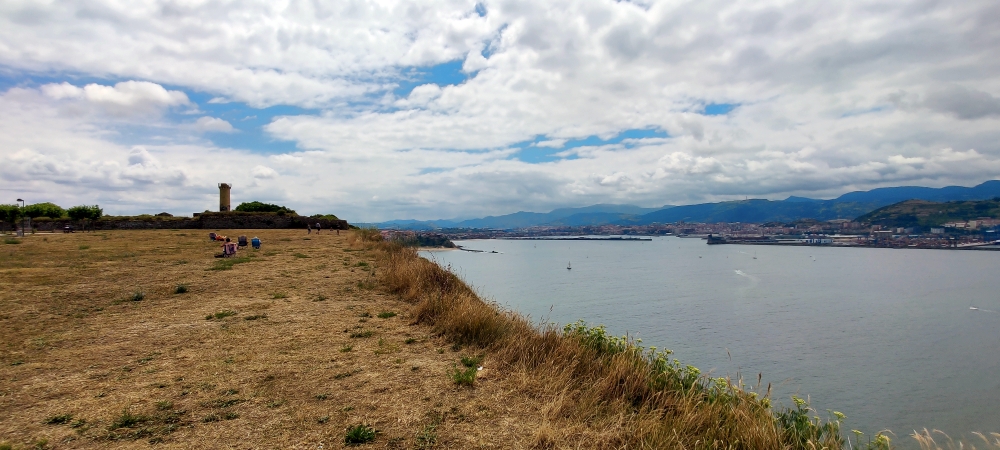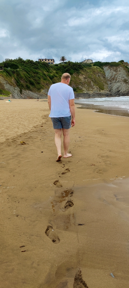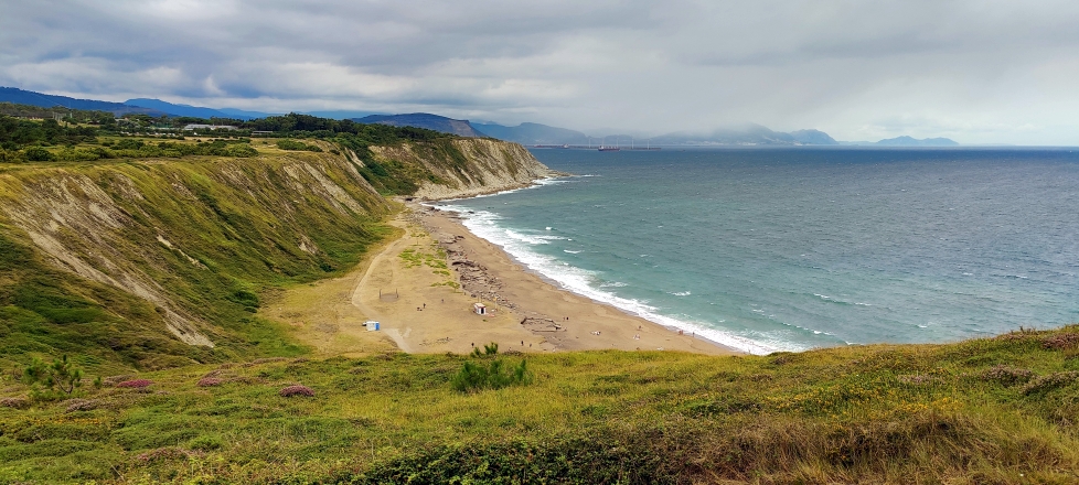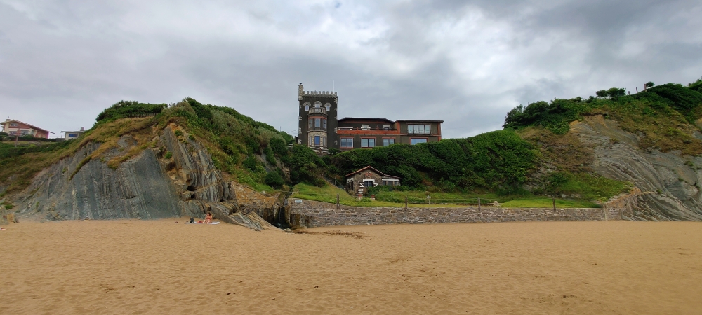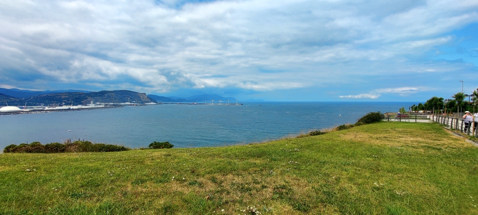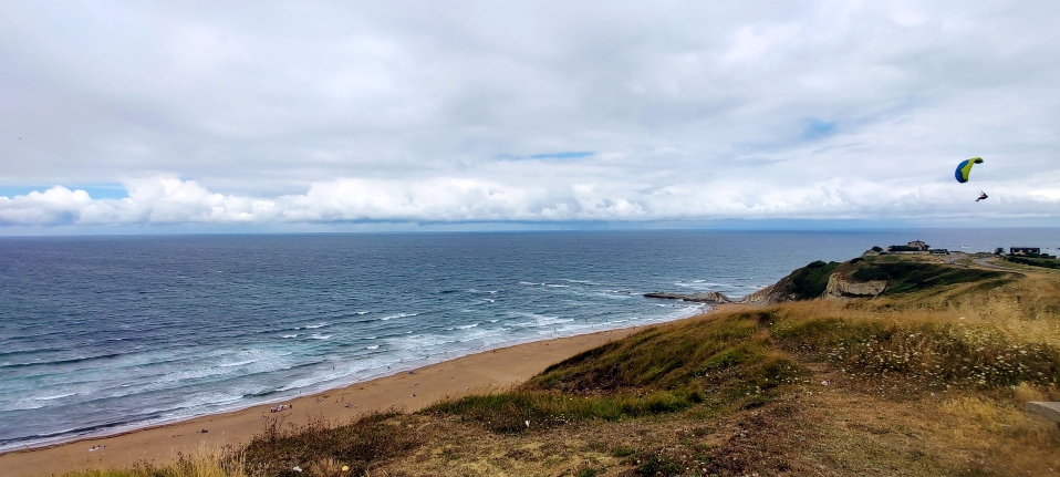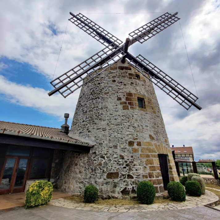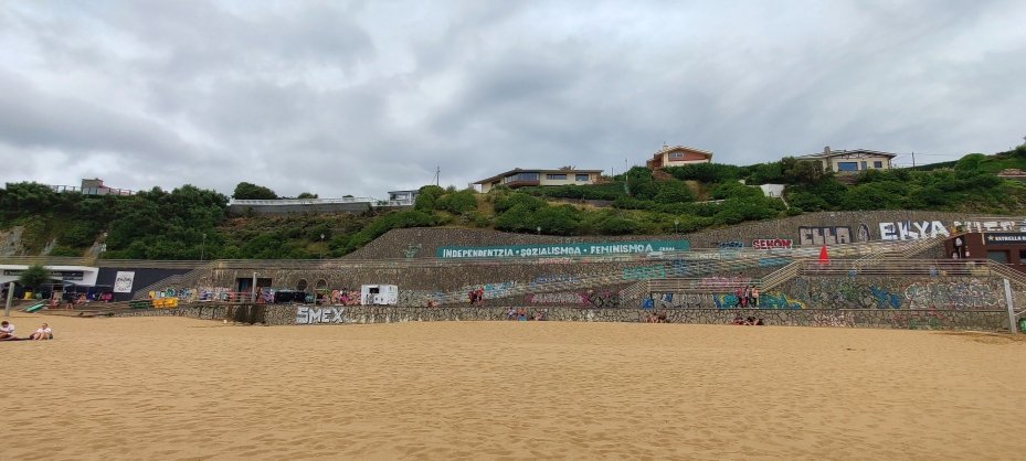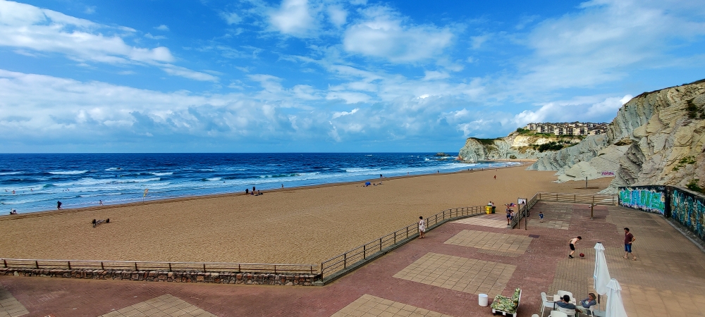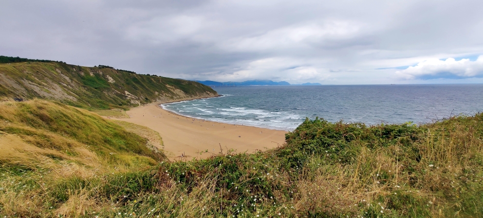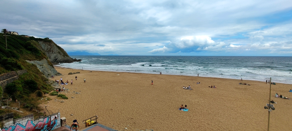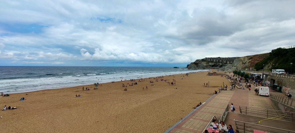 Wir fahren gegen Mittag mit der U-Bahn nach Bideluze und spazieren durch den kleinen Ort zum Ausgangspunkt unserer Wanderung, einer Windmühle. „Aixerrota“ wird sie auf spanisch genannt, von dort hat man einen tollen Ausblick auf Getxo und die Steilküste. Hier startet auch der befestigte Küstenweg „La Galea“, der uns an einem Leuchtturm vorbei zu den schönen Stränden der Küste des Baskenlandes bringt. Der Wind weht kräftig und es ist stark bewölkt bei angenehmen 27 Grad – genau das richtige Wanderwetter. Hier kann man die Route nachverfolgen. Nach etwa sieben Kilometern sind wir beim Atxabiril bzw. Arrietara-Strand anglangt. Der weitläufige Sandstrand liegt zwischen zwei Steilküsten und ist nach Norden ausgerichtet. Zuallererst trinken wir Cerveza im Strandcafé, dazu gibt’s Pintxo Gilda und ein Stück Tortilla mit Schinken.