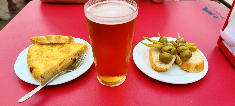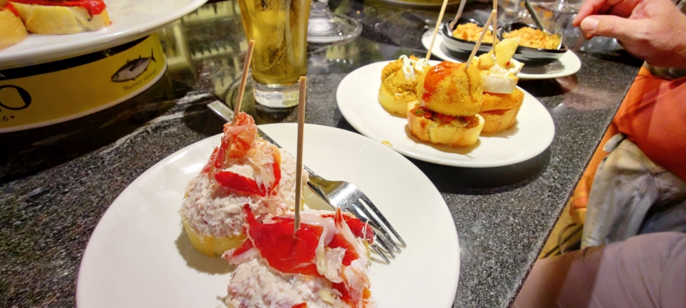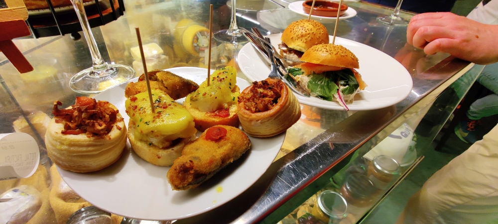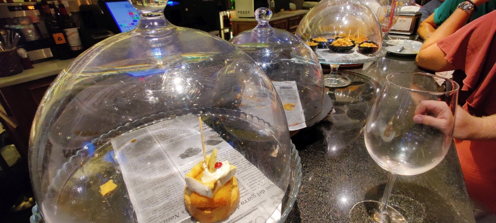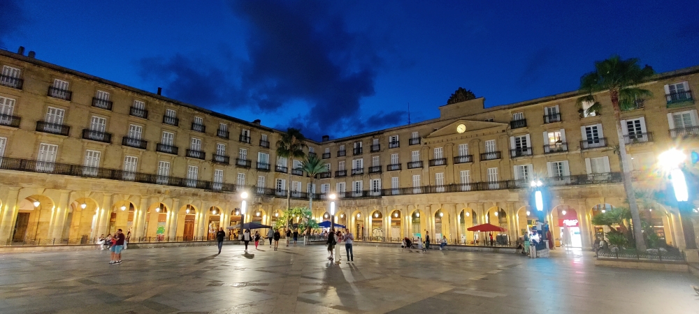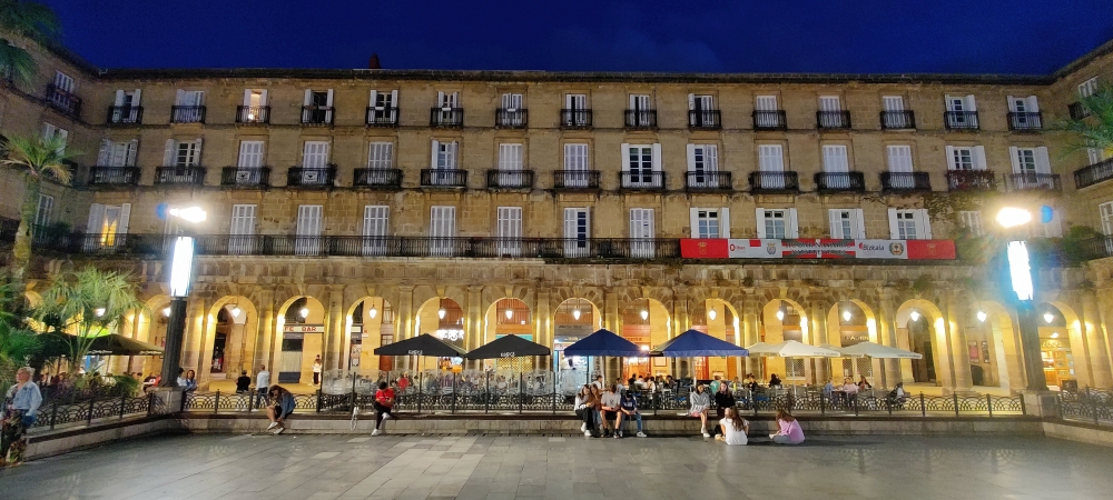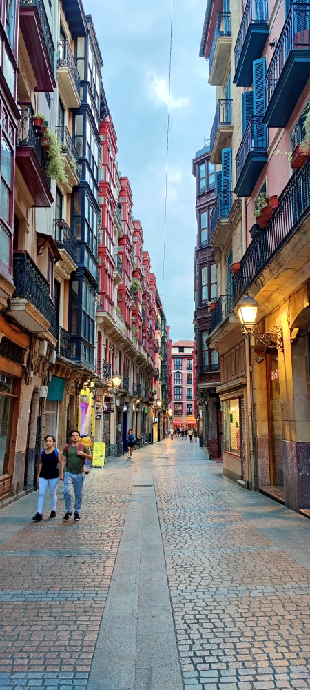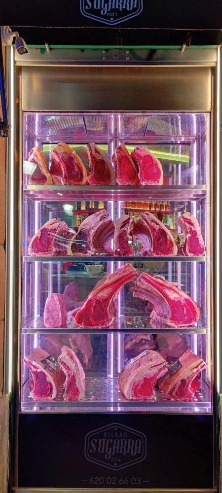 Es dämmert bereits, als wir die Casco Viejo erreichen. In den Gässchen ist einiges los, auf der Plaza Nueva ist das Epizentrum des beginnenden Nachtlebens. Unzählige Tapasbars und Restaurants haben geöffnet, an den Tischen und Theken drängen sich dich Menschen. Wir essen Pitxos und trinken Bier in drei verschiedenen Lokalen – dem „Toma y Daka“, dem „La Olla“ und „Charly’s Taberna“. Auf den kunstvoll angerichteten Brötchen befindet sich hauptsächlich Fisch, aber auch Schinken- und Käsevarianten gibt es. Das Bier kann man im so genannten Hausglas, der „caña“, bestellen. Die Menge ist gering, so kann man von Bar zu Bar ziehen und Bier zu den Pintxos trinken, ohne gleich betrunken zu werden. Um 22:00 Uhr schließen die meisten Bars, wir gehen noch weiter in eine der Siete Calles in der Altstadt und essen noch ein paar Pintxos in einem Restaurant mit Barbereich und trinken Rotwein dazu. Im Restaurant des „Sugarra“ werden dicke Txuletóns serviert. Das zwei Monate gereifte Fleisch kann man in einem gekühlten Außenfenster bewundern. Gegen Mitternacht kommen wir ins Hotel, die Bäuche sind voll und die Füße schmerzen. Heute sind wir immerhin wieder 27.818 Schritte gegangen.