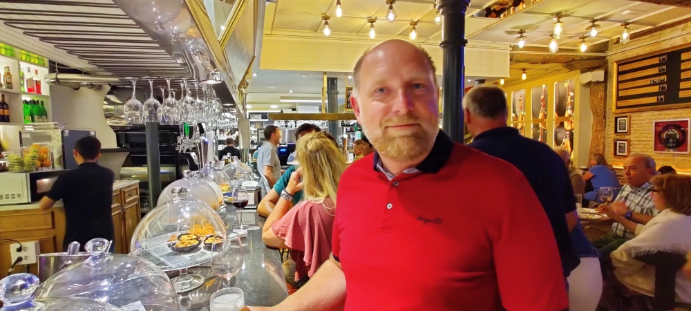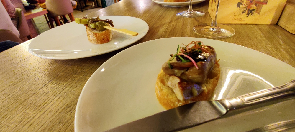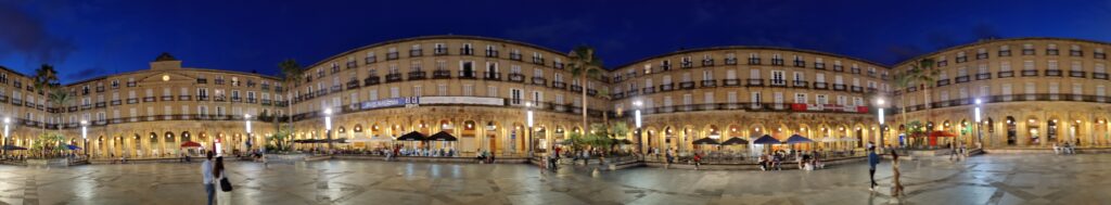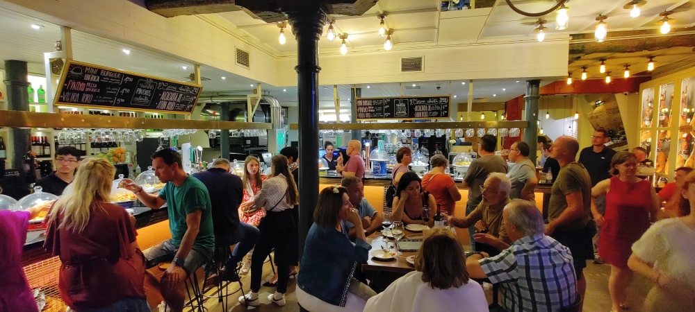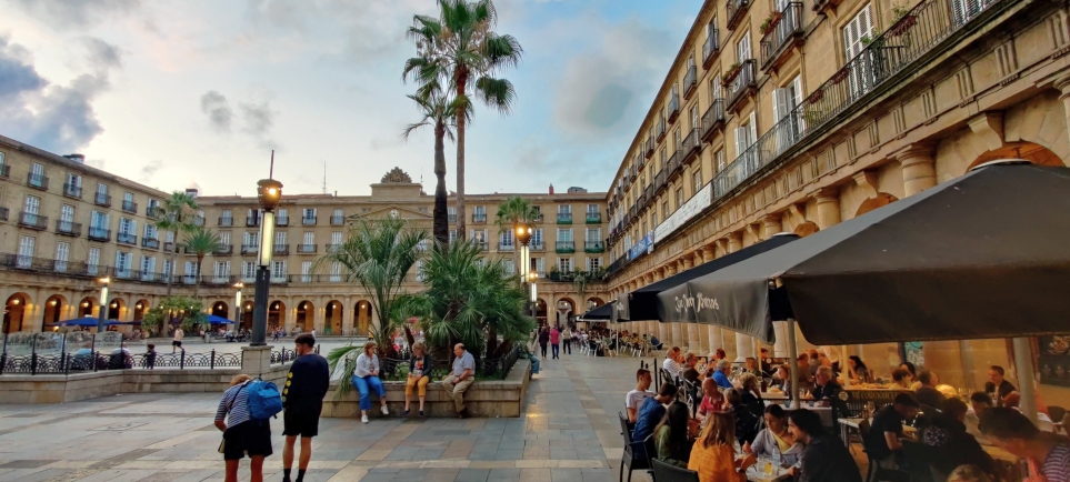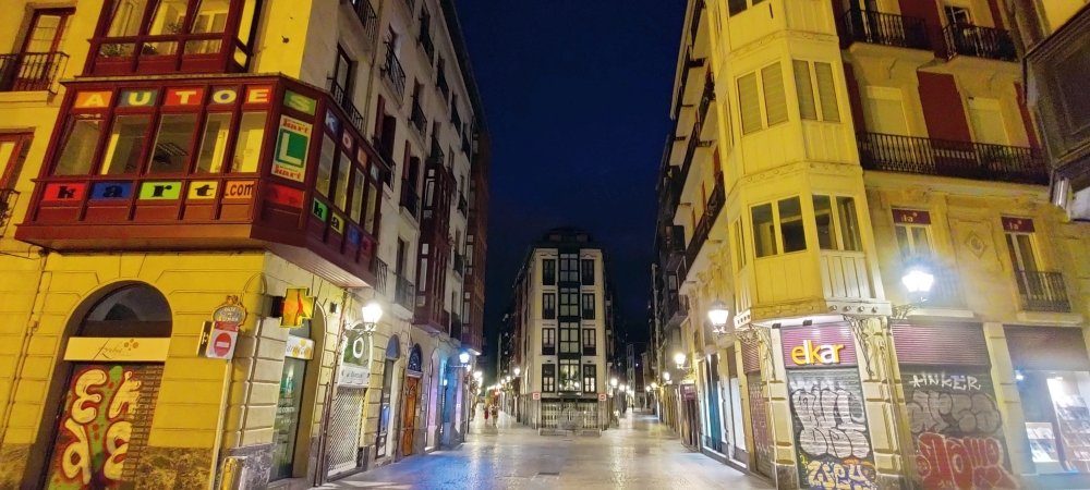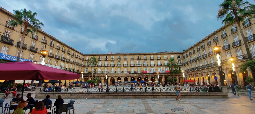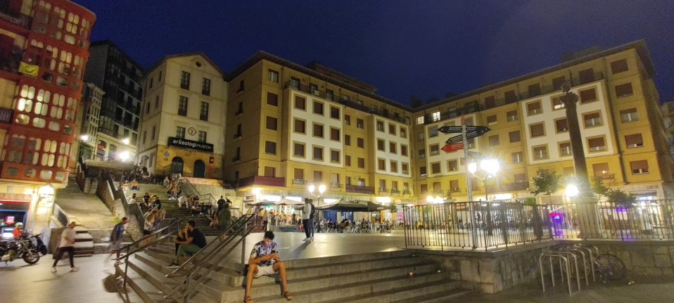 Es dämmert bereits, als wir die Casco Viejo erreichen. In den Gässchen ist einiges los, auf der Plaza Nueva ist das Epizentrum des beginnenden Nachtlebens. Unzählige Tapasbars und Restaurants haben geöffnet, an den Tischen und Theken drängen sich dich Menschen. Wir essen Pitxos und trinken Bier in drei verschiedenen Lokalen – dem „Toma y Daka“, dem „La Olla“ und „Charly’s Taberna“. Auf den kunstvoll angerichteten Brötchen befindet sich hauptsächlich Fisch, aber auch Schinken- und Käsevarianten gibt es. Das Bier kann man im so genannten Hausglas, der „caña“, bestellen. Die Menge ist gering, so kann man von Bar zu Bar ziehen und Bier zu den Pintxos trinken, ohne gleich betrunken zu werden. Um 22:00 Uhr schließen die meisten Bars, wir gehen noch weiter in eine der Siete Calles in der Altstadt und essen noch ein paar Pintxos in einem Restaurant mit Barbereich und trinken Rotwein dazu. Im Restaurant des „Sugarra“ werden dicke Txuletóns serviert. Das zwei Monate gereifte Fleisch kann man in einem gekühlten Außenfenster bewundern. Gegen Mitternacht kommen wir ins Hotel, die Bäuche sind voll und die Füße schmerzen. Heute sind wir immerhin wieder 27.818 Schritte gegangen.
