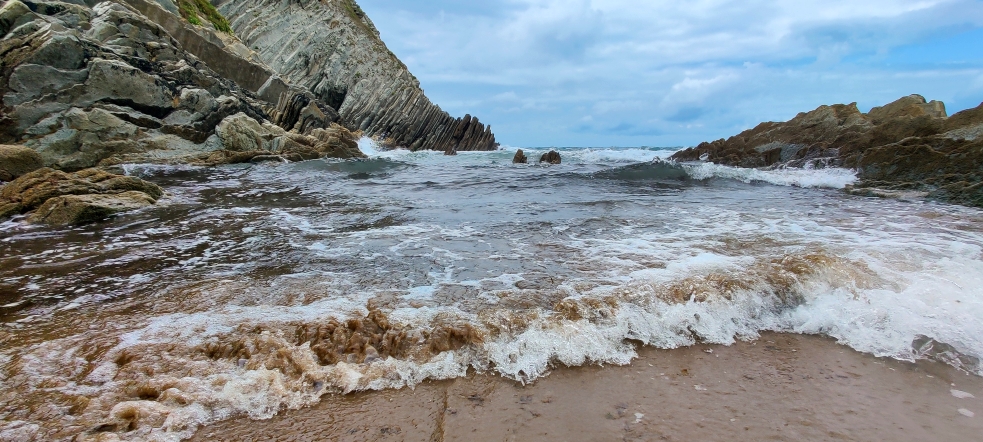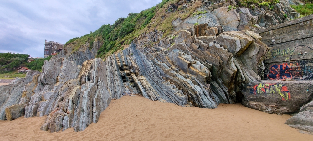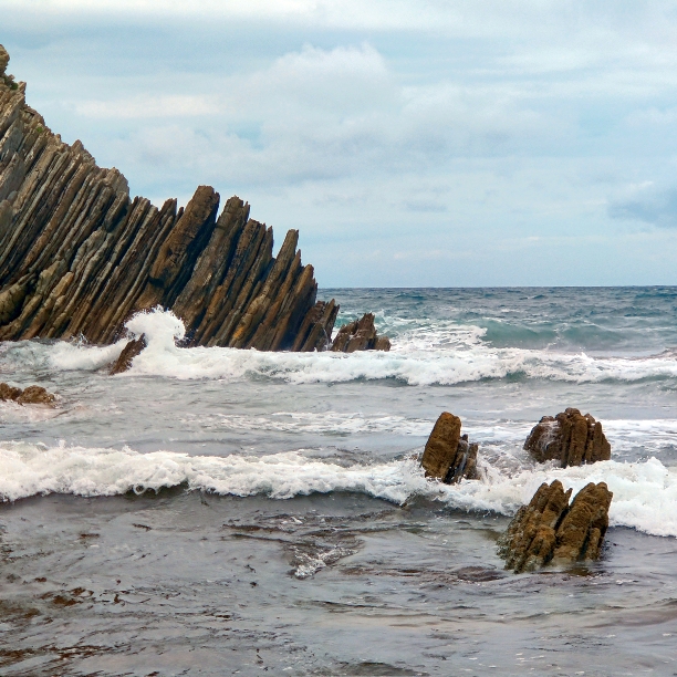 Sehr schön sind auch die Felsen aus Flysch, die den Strand begrenzen – ein tolles Fotomotiv. Nach dem Baden sind wir erschöpft und schlafen ein wenig. Um 17:00 Uhr machen wir uns wieder auf den Rückweg, zur U-Bahn ist es eine halbe Stunde zu Fuß, die Fahrtstrecke ist noch einmal so lange. Als wir im Hotel zurück sind, machen wir uns fertig für den Abend – heute geht es auf Pixto-Tour in die Casco Viejo.