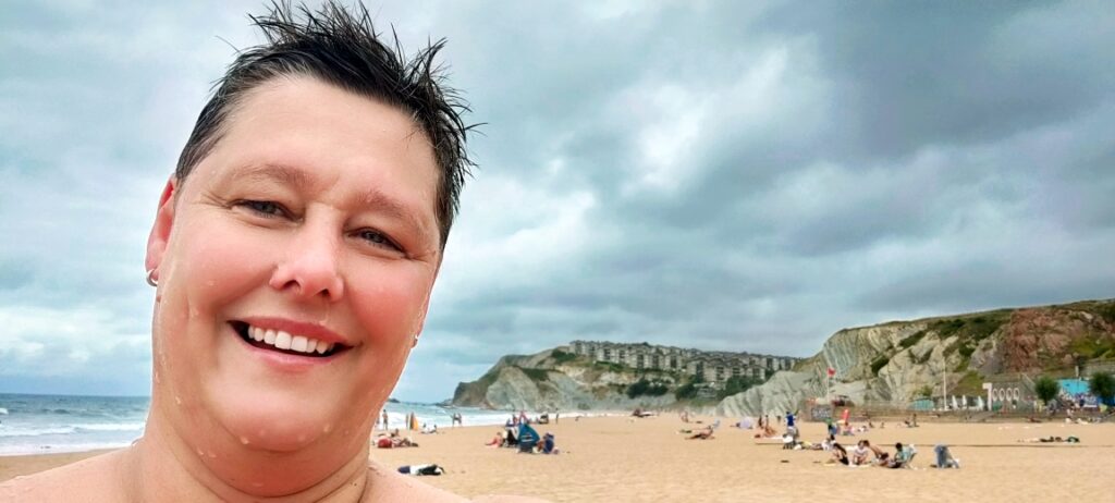 Dann suchen wir uns einen windgeschützten Platz im feinen Sand. Mit den rauen Wellen des Atlantik ist hier ein Paradies für Surfer entstanden. Da das Wetter heute nicht optimal ist, ist die Fahne auf rot, das Baden ist nicht erlaubt. Zwischen zwei Beachflags gibt es aber eine überwachte Zone, in der wir doch ins Wasser dürfen. Wir werfen uns in die hohen Wellen, es sind einige ziemlich starke dabei.