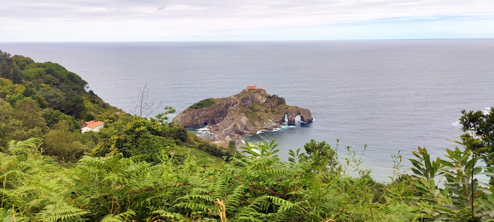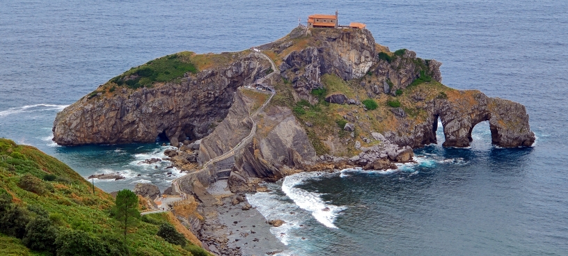 Wir fahren über die La Salve Brücke hinaus aus der Stadt Richtung Norden. Unser Ziel: Der Fels von Gaztelugatxe. Gaztelugatxe ist eine Insel im Golf von Biskaya, die unmittelbar vor der Felsenküste der Costa Vasca zwischen den Orten Bakio und Bermeo liegt. Sie ist etwa 270 Meter lang und maximal 80 Meter breit. Sie ist durch eine Steinbrücke mit dem rund 200 Meter entfernten Festland verbunden. Auf dem höchsten Punkt der Insel – 50 Meter über Meeresniveau – steht das ehemalige Kloster San Juan de Gaztelugatxe. Um zu der Einsiedelei zu gelangen, muss man, nachdem man die heute dammartig unterbaute Brücke überquert hat, 237 Stufen einer in den Fels gehauenen Treppe hinaufsteigen. Die Felsinsel wird von mehreren unterirdischen Gängen durchzogen und besitzt zahlreiche zum Teil ausgebaute Höhlen. Gaztelugatxe hat sich in jüngerer Zeit aufgrund seiner verwunschenen und romantischen Lage zu einem beliebten Ausflugsziel und zur Touristenattraktion entwickelt. Vor allem aber deshalb, weil die Insel einer der Drehorte der Serie Game of Thrones ist. Deshalb bleibt uns der Zugang verwehrt, wir hätten Tickets im Vorfeld online kaufen müssen. Wir wandern ein Stück entlang der Küste und erhaschen einen guten Blick auf die Insel und das Kloster.