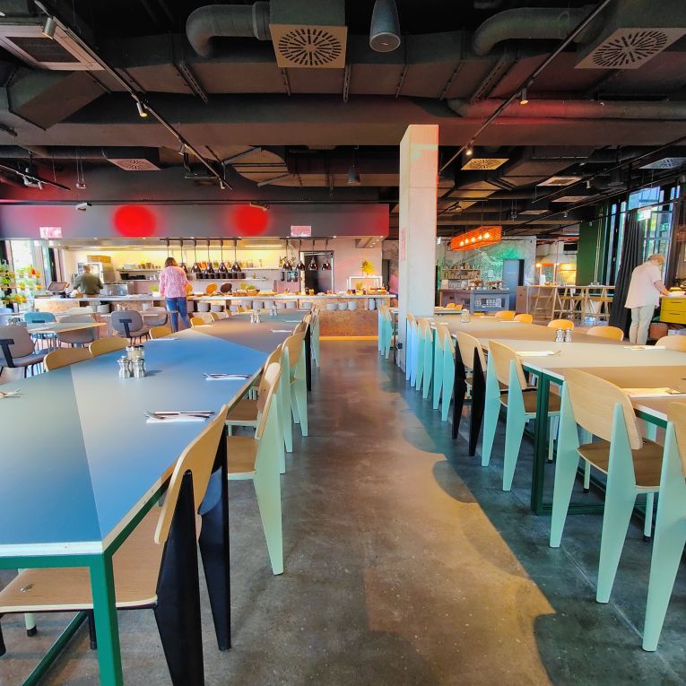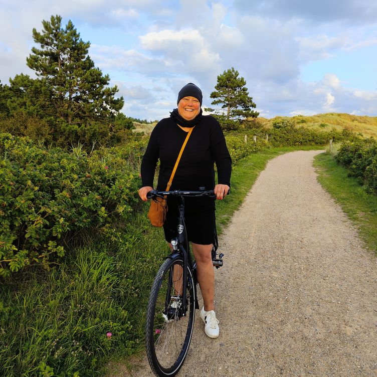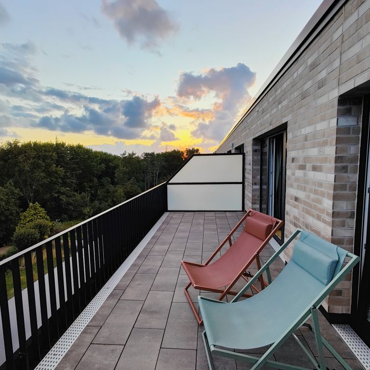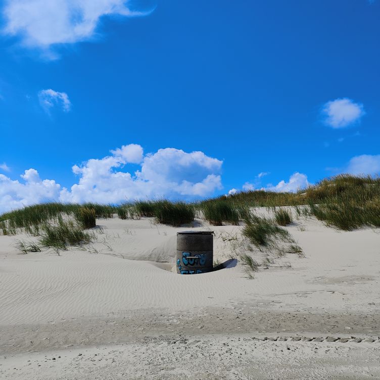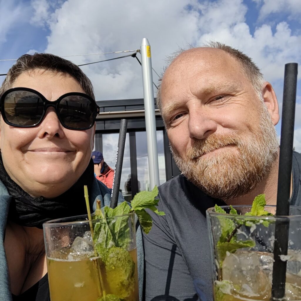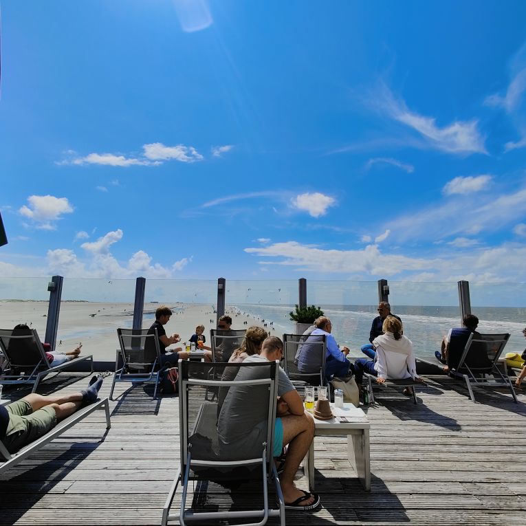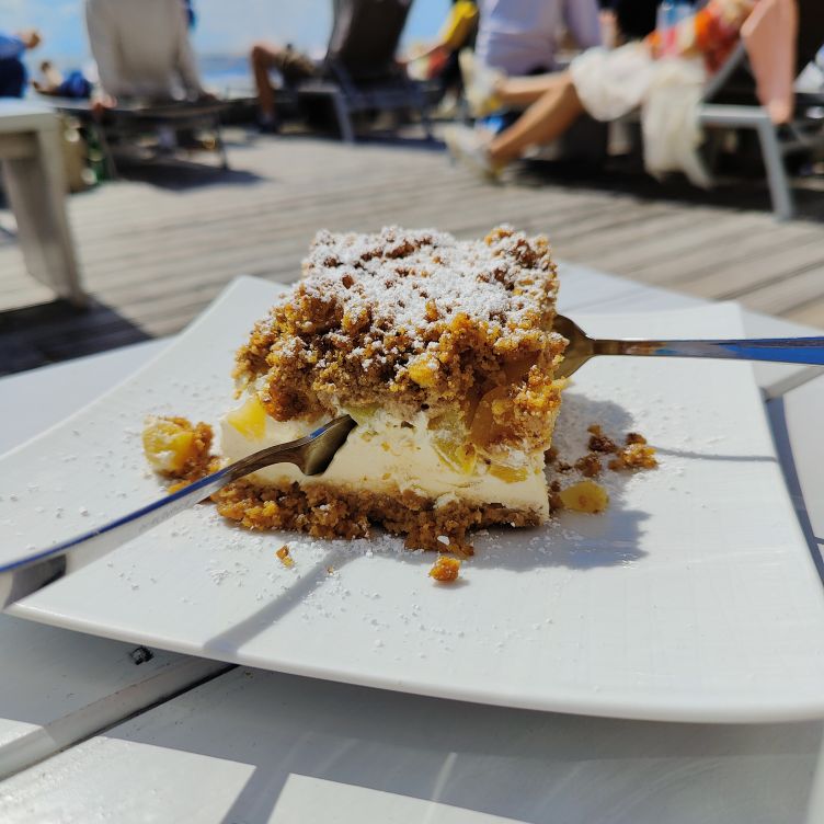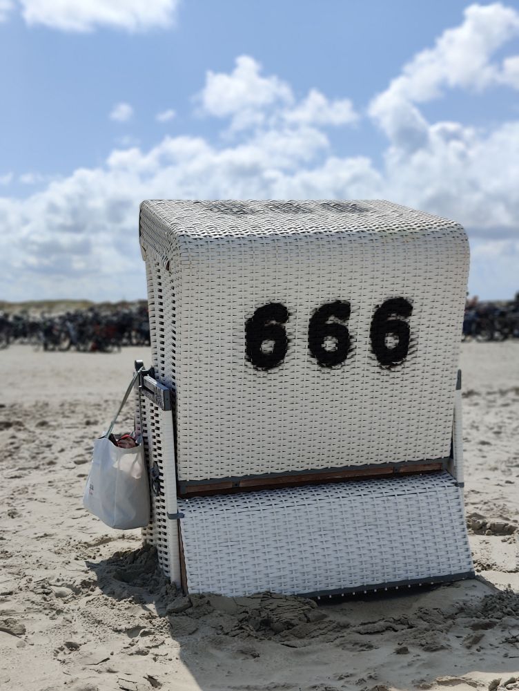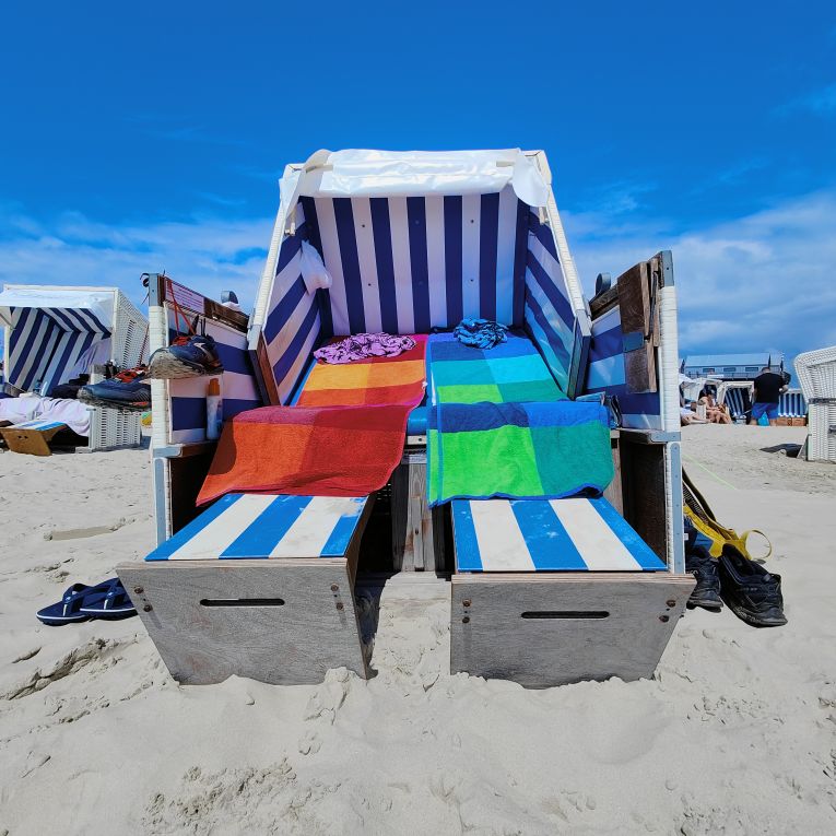 Gegen Mittag brechen wir mit den Fahrrädern nach Norden zum Strandabschnitt Ording auf. Nach etwa zehn Minuten sind wir dort und finden einen belebten Strand vor, auf dem Kinder Sandburgen bauen und Drachen steigen lassen. Die Erwachsenen faulenzen in Strandkörben, gehen spazieren oder machen einen Kitesurfkurs in den Nordseewellen. Wir suchen unseren vorreservierten Strandkorb und machen es uns gemütlich. Sobald man drinliegt, ist der Wind ausgesperrt und die Sonne scheint uns auf die Nase. Unseren Durst löschen wir zwischendurch in der Strandbar 54° Nord. Wir haben Glück und erwischen einen Sitzplatz auf der Sonnenterrasse. Mittagessen lassen wir heute bleiben, aber den Apple-Crumble-Cheesecake lassen wir uns nicht entgehen. Wir verbringen den restlichen Nachmittag am Strand, bis es uns zu kühl wird. Retour geht’s zum Hotel. In der Rooftop-Bar darfs wieder ein Ginger-Mojito sein, bevor wir duschen gegen und uns für den Abend frisch machen.