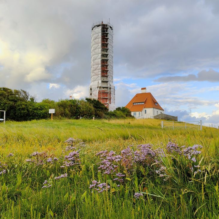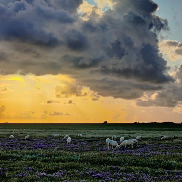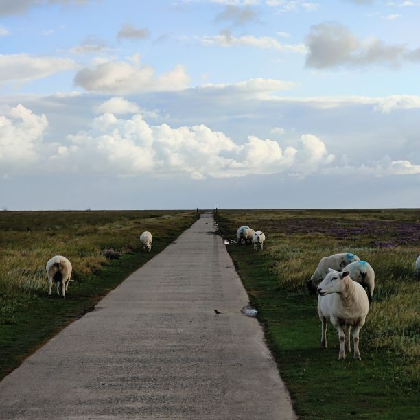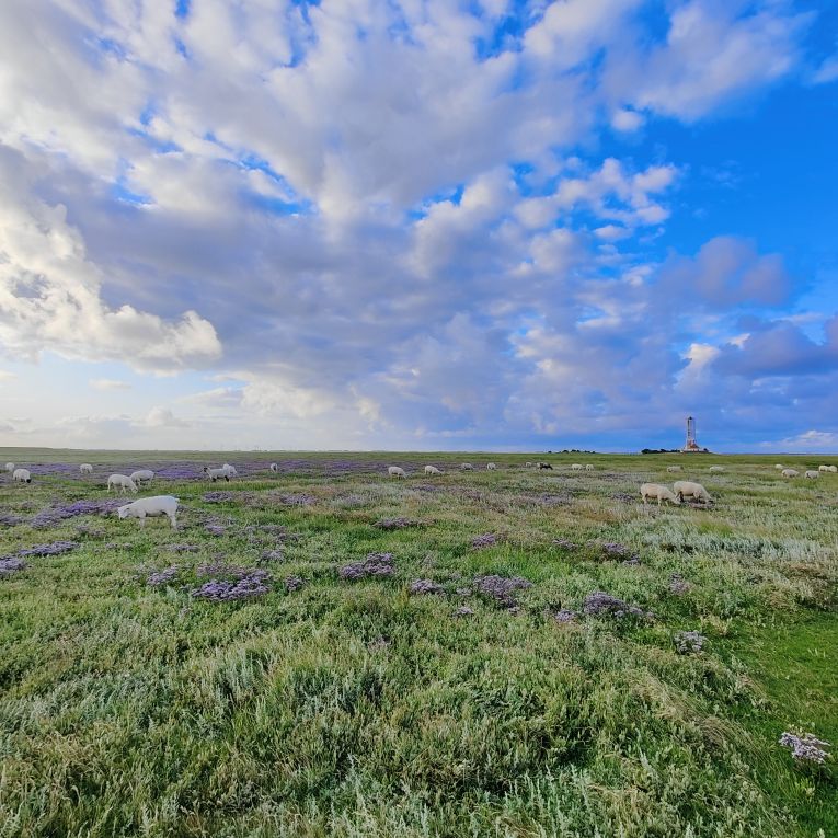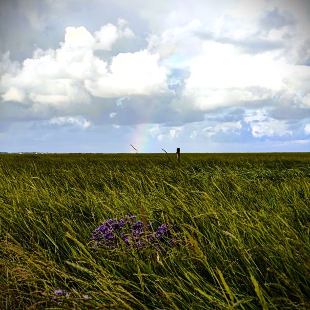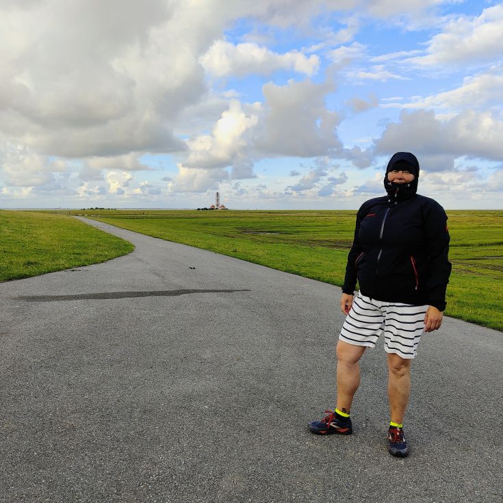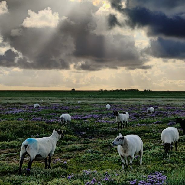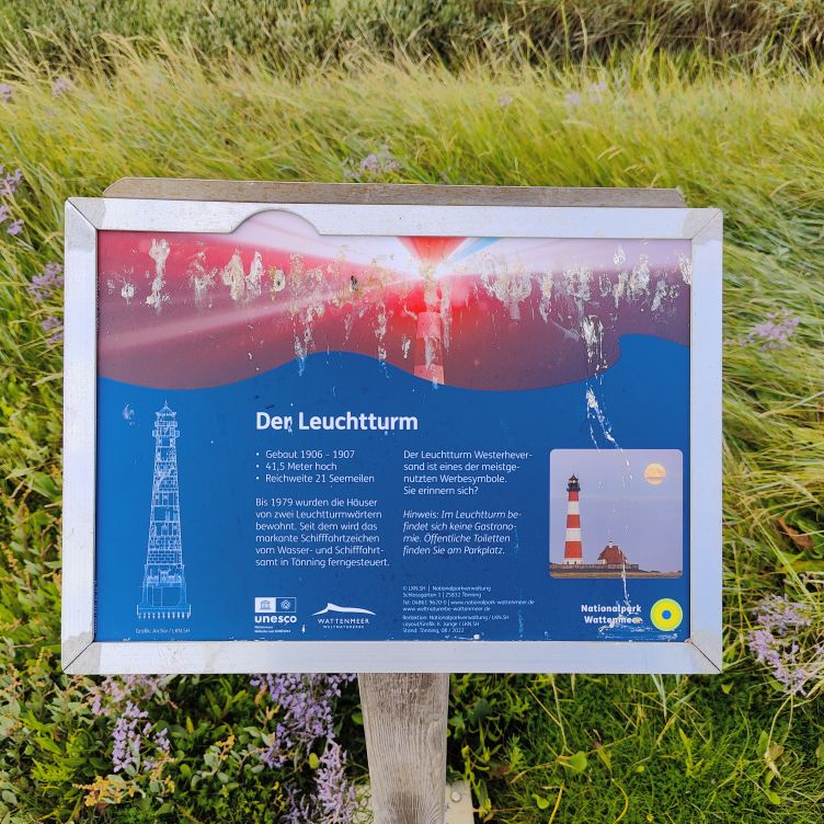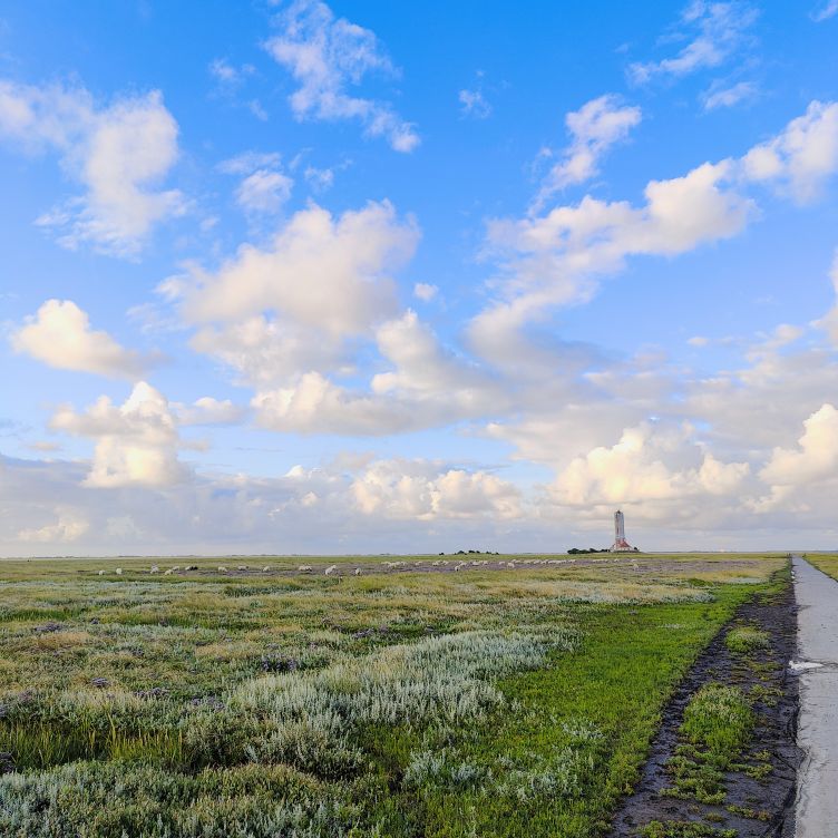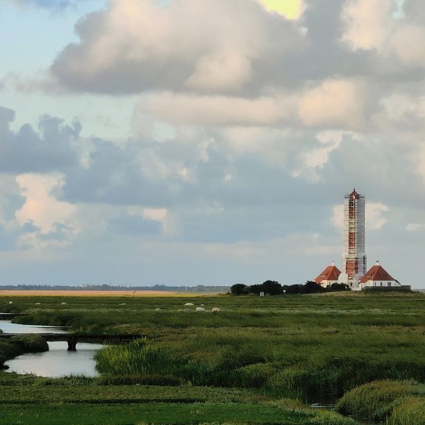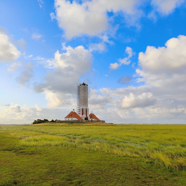 Um 5:30 läutet der Wecker – wir fahren zum wohl bekanntesten Leuchtturm Deutschlands, den Westerhever. Nach rund 20 Minuten Fahrt sind wir am Parkplatz angelangt – und wir sind die einzigen. Tagsüber ist der riesengroße Parkplatz stets bis zur letzten Lücke gefüllt. Wir wollen die Touristenmassen umgehen und den Turm außerdem im sanften Morgenlicht erwandern. Es ist aufgelockert bewölkt, die Sonne zeigt sich immer wieder und taucht die Landschaft in goldenes Licht. Es weht eine steife Brise, ohne Windjacke wäre die Wanderung nicht möglich. Wir gehen den drei Kilometer langen befestigten Weg durch die Salzwiesen und genießen die jodige Luft. Leider sehen wir schon von der Ferne, dass der Leuchtturm mit einem Gerüst eingekleidet ist – er wird über den Sommer renoviert. Schade, aber auch die Salzwiesen und die darin weidenden Schafe sind ein großartiger Ausblick. In der Ferne erscheint für ein paar Minuten ein schwacher Regenbogen, eine atemberaubende Stimmung so früh am Morgen, ganz für uns allein. Als wir beim Westerhever angekommen sind, lesen wir, dass wir aufgrund der Renovierungsarbeiten auch die Plattform nicht betreten können. Der Turm wurde im Jahre 1906 auf einer vier Meter hoch aufgeschütteten Warft mit Pfahlgründung und Betonsockel errichtet. Darauf wurde der 41,5 Meter hohe Turm 608 miteinander verschraubten, 130 Tonnen schweren, gußeisernen Platten montiert. Innerhalb des Turmes befinden sich neun Stockwerke. Im Jahre 1908 wurde das Leuchtfeuer in Betrieb genommen. Die Reichweite der Lichtbogenlampe beträgt 22 Nautische Seemeilen, das sind nachts bei guter Sicht an die 50 km. Durch die Automatisierung ging der Leuchtturmwärter im Jahre 1979 vom Turm. Auch der Rückweg, den wir eigentlich nehmen wollten, ist gesperrt. Der gepflasterte „Stockenstieg“ war ursprünglich der einzige befestigte Zugang zum Leuchtturm und steht im Denkmalbuch des Landes Schleswig-Holstein als Bestandteil des Nationalparks Wattenmeer.