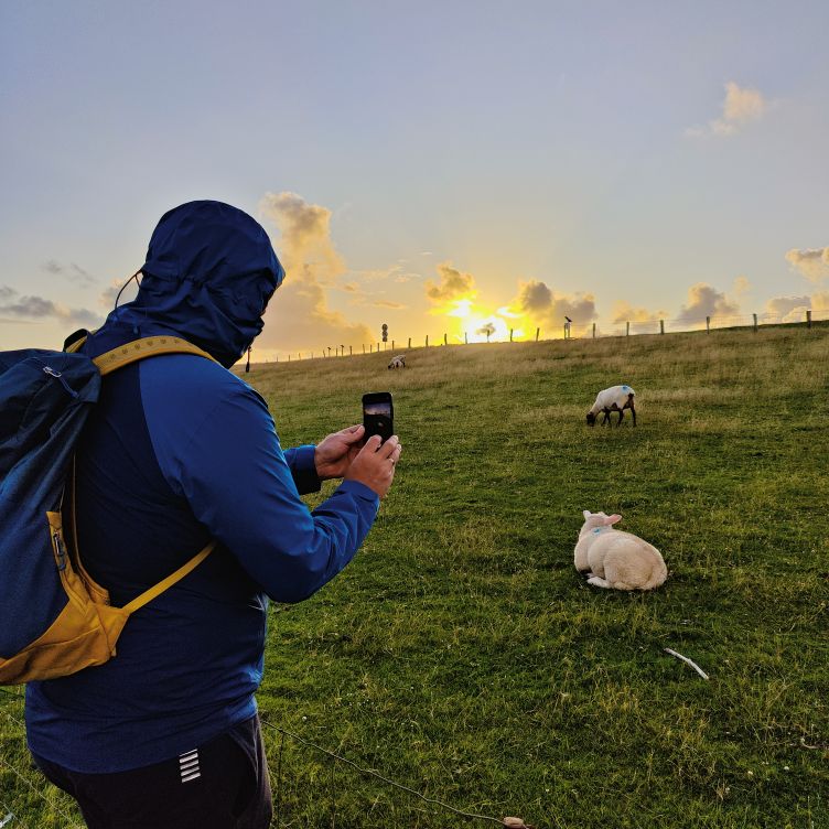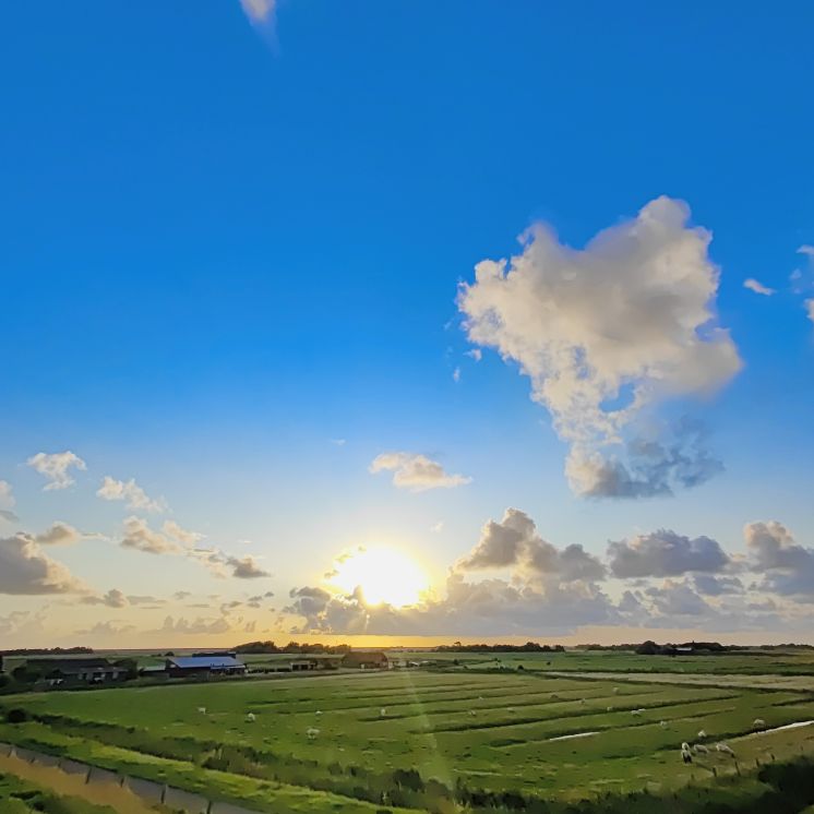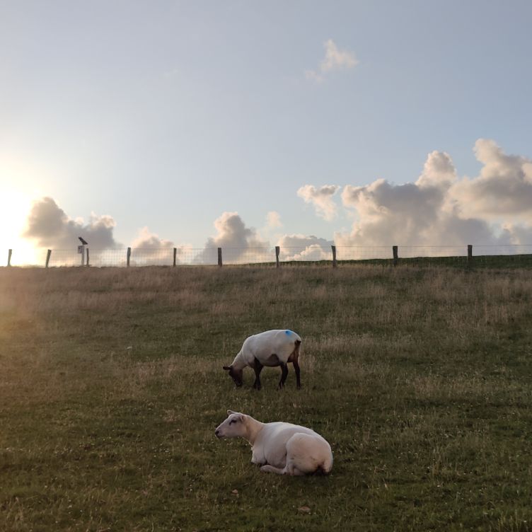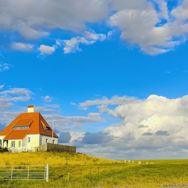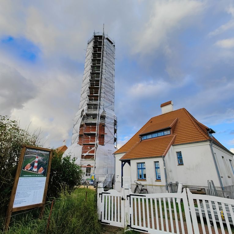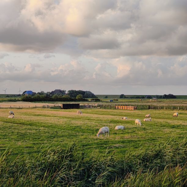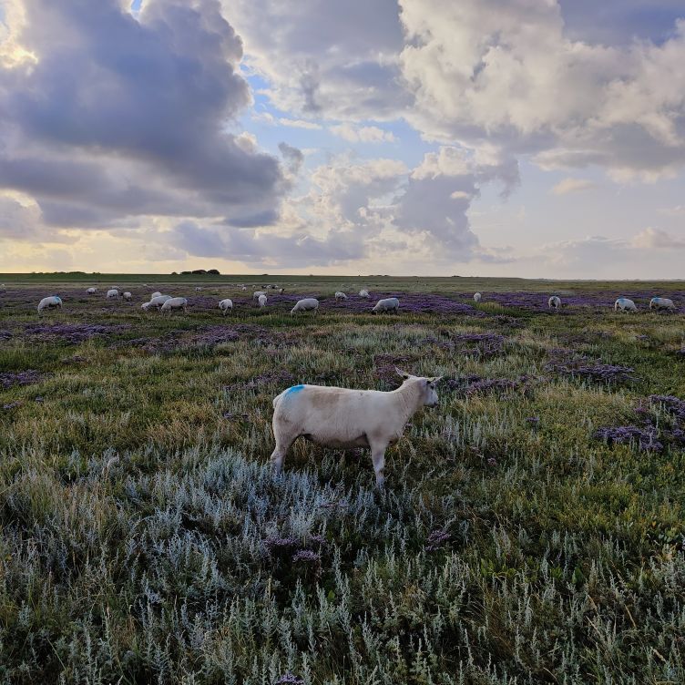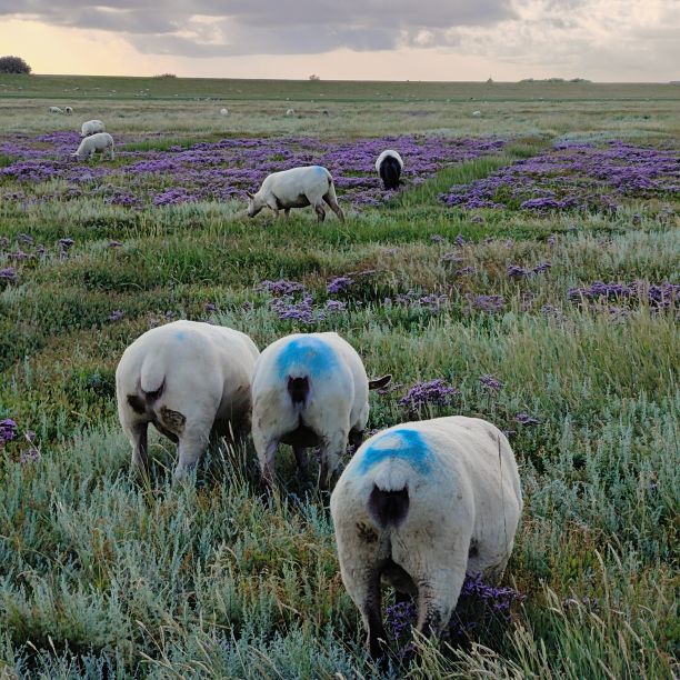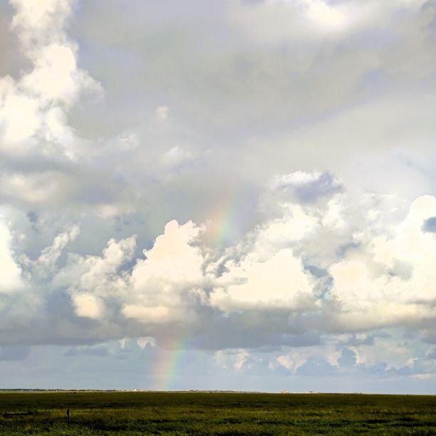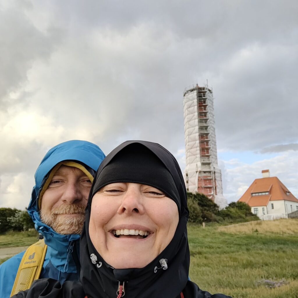 Um 5:30 läutet der Wecker – wir fahren zum wohl bekanntesten Leuchtturm Deutschlands, den Westerhever. Nach rund 20 Minuten Fahrt sind wir am Parkplatz angelangt – und wir sind die einzigen. Tagsüber ist der riesengroße Parkplatz stets bis zur letzten Lücke gefüllt. Wir wollen die Touristenmassen umgehen und den Turm außerdem im sanften Morgenlicht erwandern. Es ist aufgelockert bewölkt, die Sonne zeigt sich immer wieder und taucht die Landschaft in goldenes Licht. Es weht eine steife Brise, ohne Windjacke wäre die Wanderung nicht möglich. Wir gehen den drei Kilometer langen befestigten Weg durch die Salzwiesen und genießen die jodige Luft. Leider sehen wir schon von der Ferne, dass der Leuchtturm mit einem Gerüst eingekleidet ist – er wird über den Sommer renoviert. Schade, aber auch die Salzwiesen und die darin weidenden Schafe sind ein großartiger Ausblick. In der Ferne erscheint für ein paar Minuten ein schwacher Regenbogen, eine atemberaubende Stimmung so früh am Morgen, ganz für uns allein. Als wir beim Westerhever angekommen sind, lesen wir, dass wir aufgrund der Renovierungsarbeiten auch die Plattform nicht betreten können. Der Turm wurde im Jahre 1906 auf einer vier Meter hoch aufgeschütteten Warft mit Pfahlgründung und Betonsockel errichtet. Darauf wurde der 41,5 Meter hohe Turm 608 miteinander verschraubten, 130 Tonnen schweren, gußeisernen Platten montiert. Innerhalb des Turmes befinden sich neun Stockwerke. Im Jahre 1908 wurde das Leuchtfeuer in Betrieb genommen. Die Reichweite der Lichtbogenlampe beträgt 22 Nautische Seemeilen, das sind nachts bei guter Sicht an die 50 km. Durch die Automatisierung ging der Leuchtturmwärter im Jahre 1979 vom Turm. Auch der Rückweg, den wir eigentlich nehmen wollten, ist gesperrt. Der gepflasterte „Stockenstieg“ war ursprünglich der einzige befestigte Zugang zum Leuchtturm und steht im Denkmalbuch des Landes Schleswig-Holstein als Bestandteil des Nationalparks Wattenmeer.