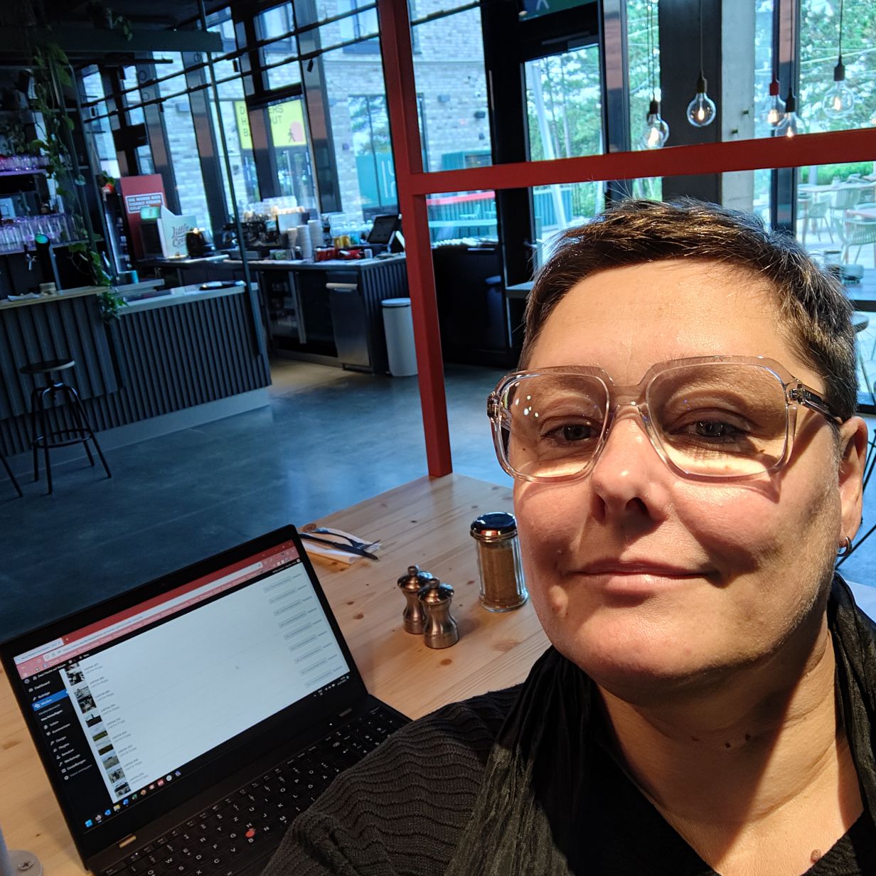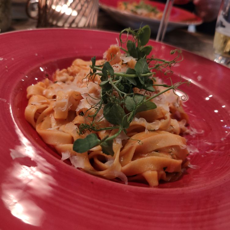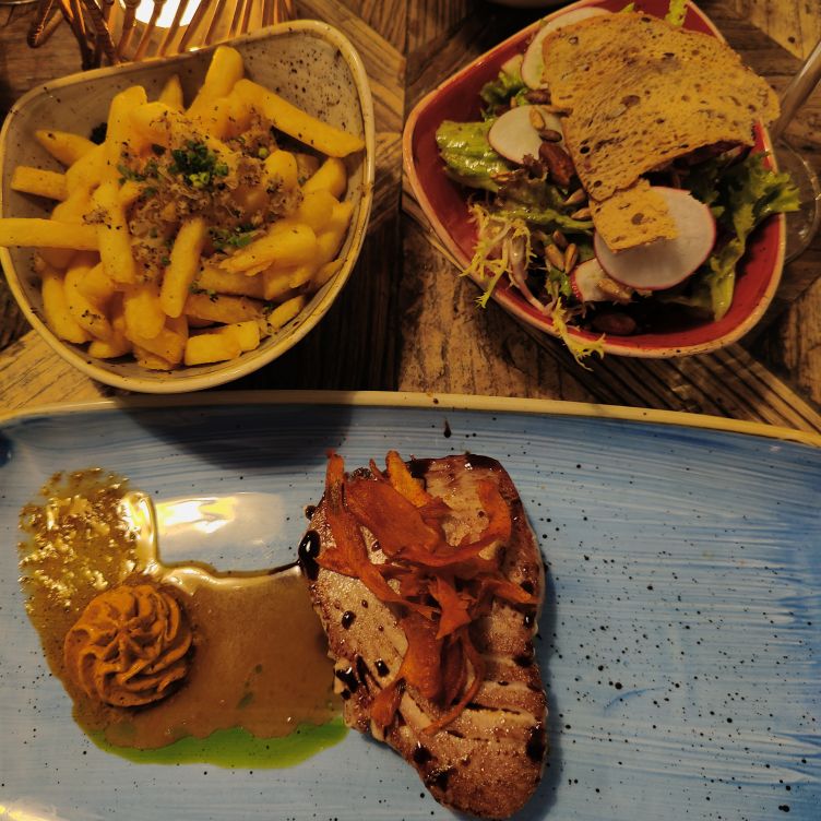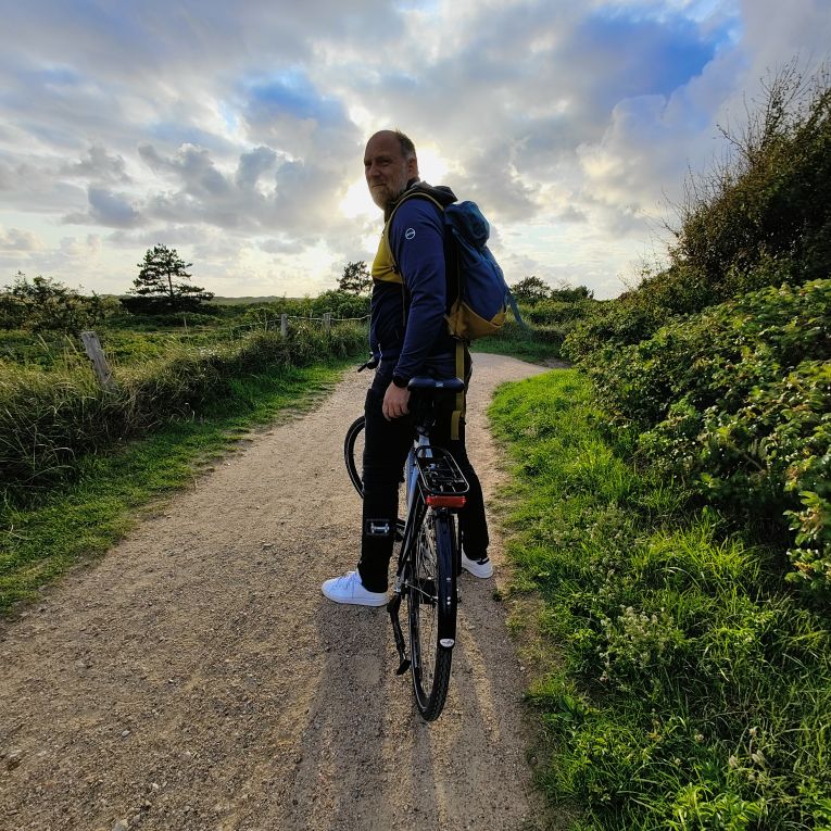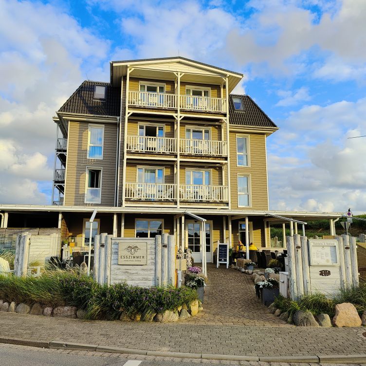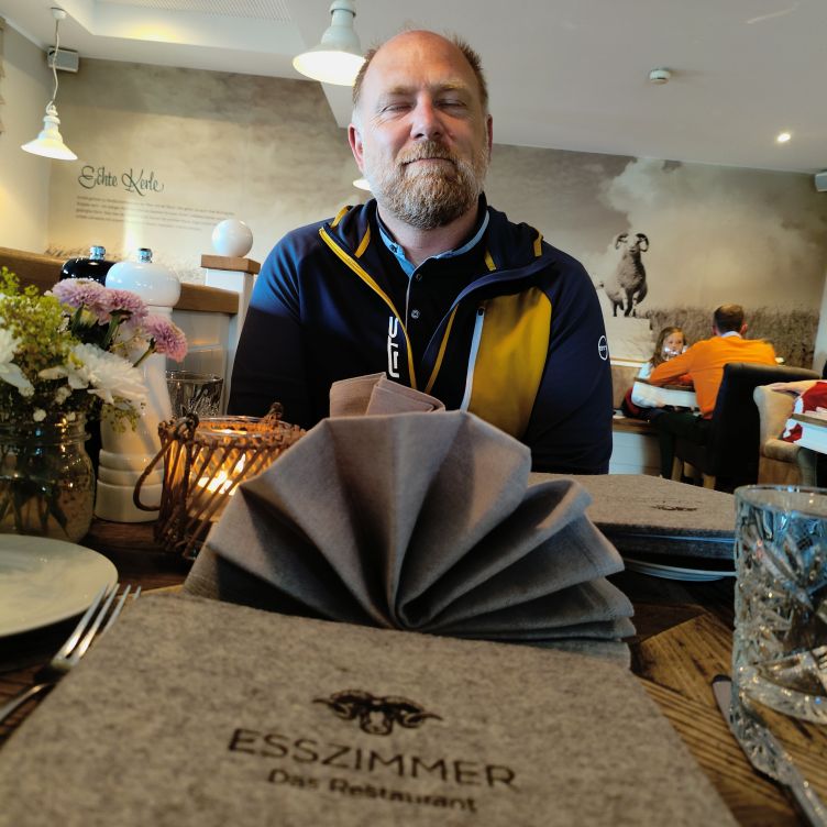 Frisch geduscht schwingen wir uns wieder aufs Rad und fahren etwa zwanzig Minuten durch ein kleines Wäldchen und Heidelandschaft ganz in den Norden Sankt Peter-Ordings. Dort befindet sich das Hotel Zweite Heimat mit dem Restaurant Esszimmer, in dem wir für heute Abend einen Tisch reserviert haben. Das nordische Design gefällt uns und wir essen Nudeln mit Garnelen und ein Thunfischsteak mit Trüffelpommes. Dazu trinken wir eine ausgezeichnete Burgunder-Cuvée vom Nahe-Weingut Korrell. In der Abenddämmerung fahren wir wieder zurück ins Hotel. 13.457 Schritte haben wir heute gemacht – dazu kommen nochmal ca. 20 Fahrradkilometer.