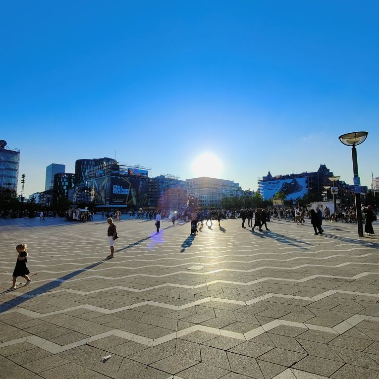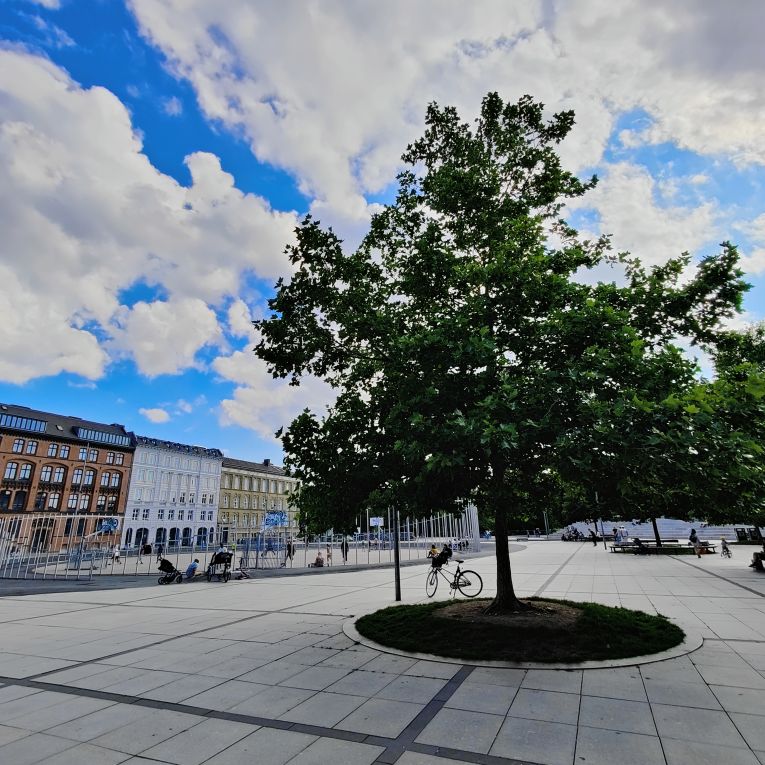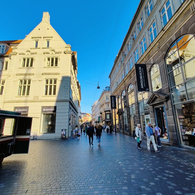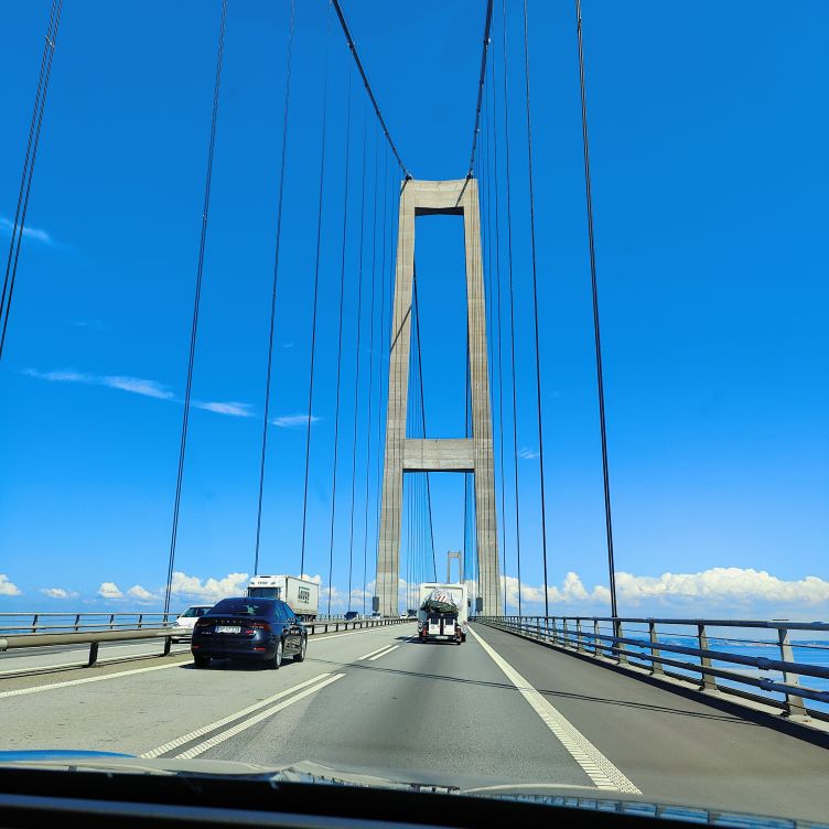 Heute wird noch einmal ausgedehnt gefrühstückt, dann packen wir unsere Koffer und checken aus. Um Punkt 10:00 bringen wir unsre Fahrräder wohlbehalten zurück und machen uns auf den Weg ins etwas mehr als 400 Kilometer entfernte Kopenhagen. Wir durchqueren ganz Deutschland von West nach Ost und kommen bei Flensburg an die Ostsee. Wir passieren die Dänische Grenze und steuern bei Fredericia den nächsten E-Ladepark an. Die Ionity-Stationen sind leider alle belegt, bei E.ON haben wir Glück und kommen nach ein paar Minuten Wartezeit dran. Wir vertreten uns die Beine und trinken einen Kaffee-Shake, dann ist das Auto schon wieder vollgeladen für die Weiterfahrt. Beeindruckend ist die 18 Kilometer lange Storebæltsbroen, sie quert die Meerenge Großer Belt zwischen den Inseln Fünen (dänisch Fyn) und Seeland (dänisch Sjælland). Wir kommen am frühen Abend exakt zur geplanten Zeit in Kopenhagen an und parken im Parkhaus Q-Park Nørreport. Dort gibt es jede Menge freie Ladestationen, von denen wir gleich eine nutzen.