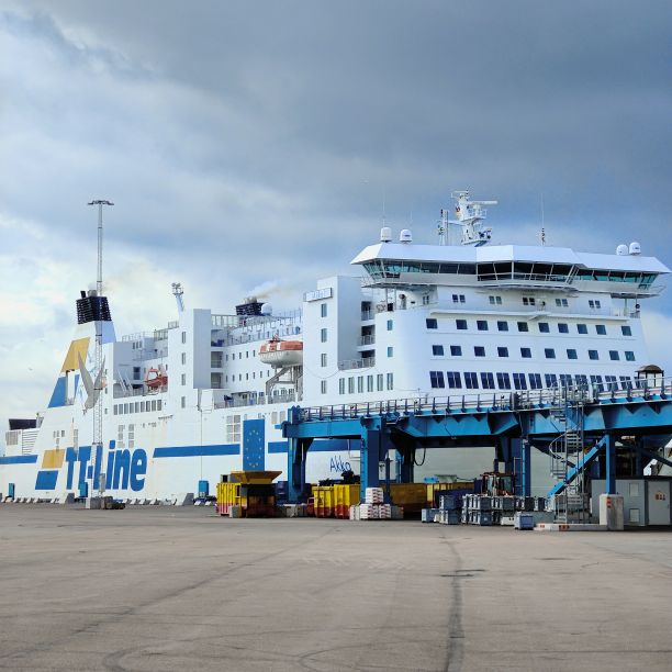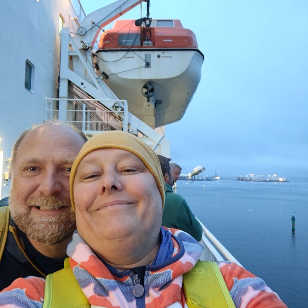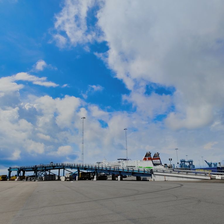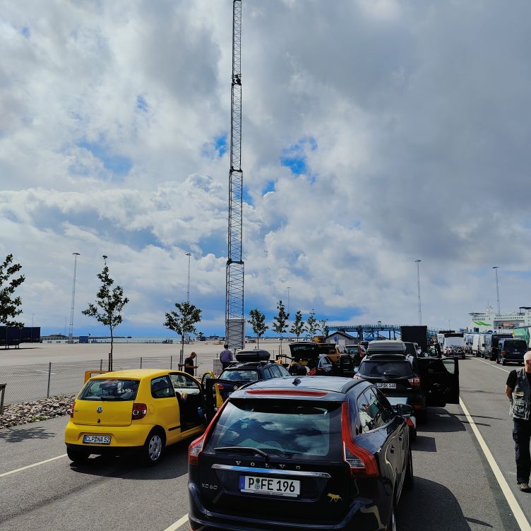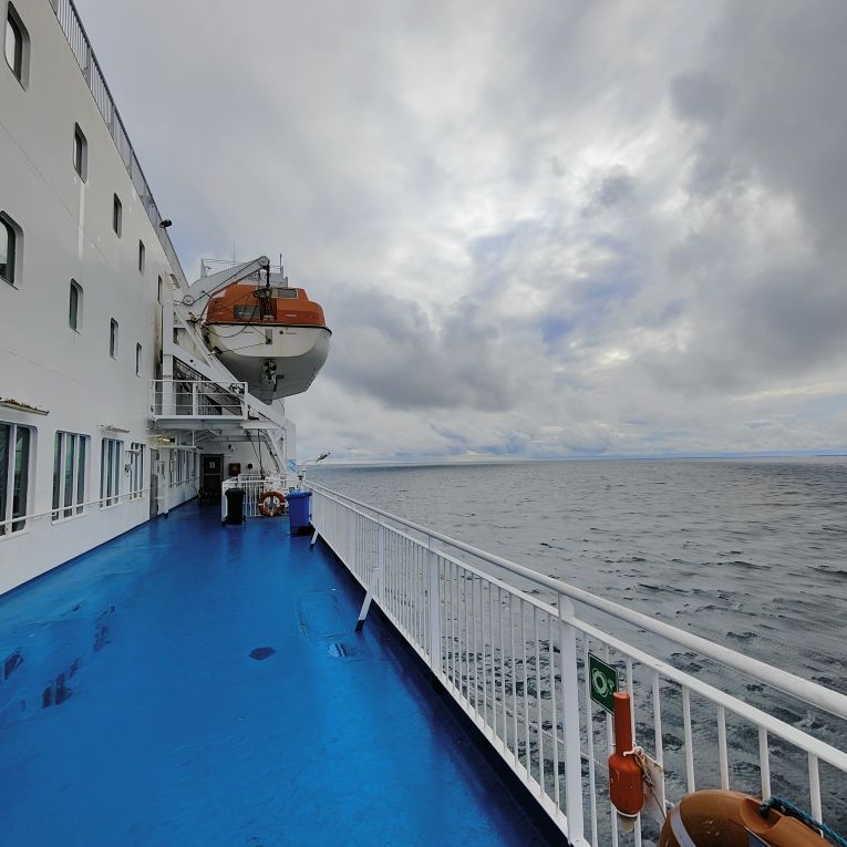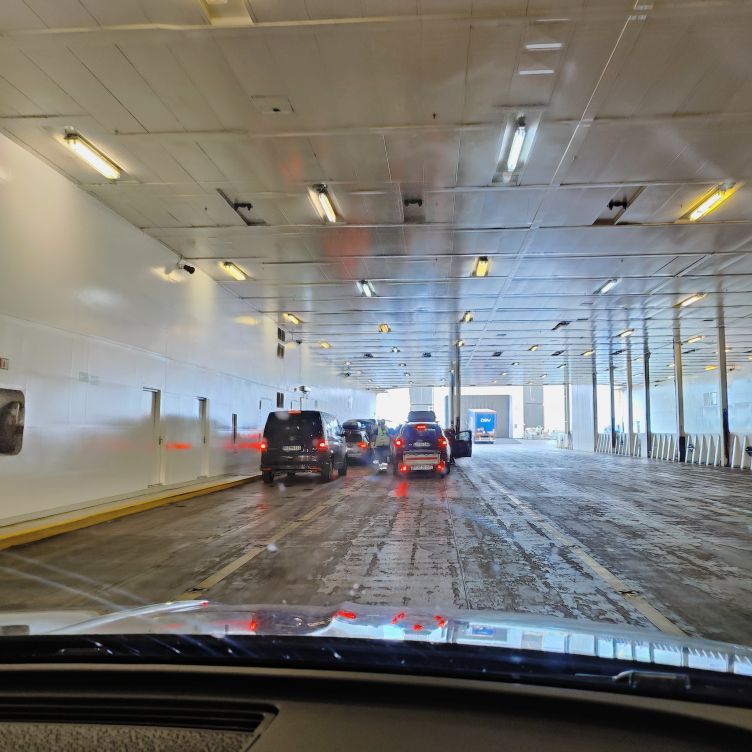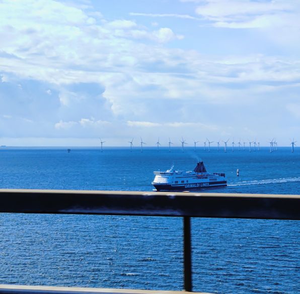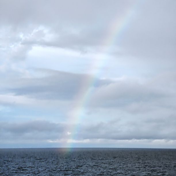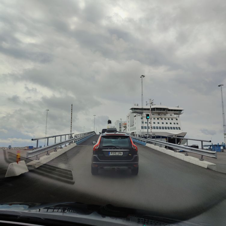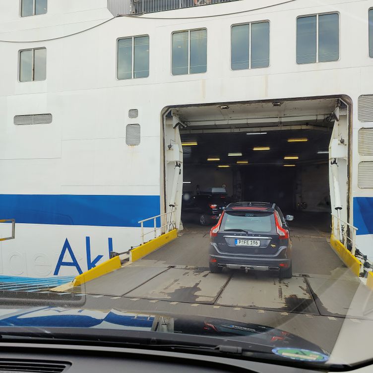 Dann geht es auch schon weiter nach Trelleborg, das an der Südspitze Schwedens liegt. Von dort startet unsere Fähre zurück nach Deutschland. Durch die Fahrt mit dem Schiff ersparen wir uns rund 400 Autokilometer und einen Ladestopp. Der Check-In verläuft reibungslos, wir reihen uns etwa 90 Minuten vor Abfahrt in die Warteschlange ein. Sechseinhalb Stunden sind wir mit der „Akka“ der TT-Lines durch die Ostsee unterwegs. Wir verbringen die Zeit mit Netflixfilmen. An Deck ist es windig, das hindert uns aber nicht daran, die Kreidefelsen der dänischen Insel Møn zu bewundern. Auch einen Regenbogen sehen wir kurz vor einem aufziehenden Sturm. Kulinarisch ist heute der dürftigste Tag unseres Urlaubes: wir essen einen mittelmäßig schmeckenden Burger mit weichen Pommes im Schiffsrestaurant. Gut, dass wir Schnaps mithaben, der uns beim Verdauen und der Überwindung der Seekrankheit hilft 😊.