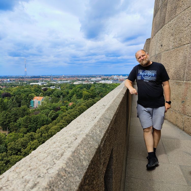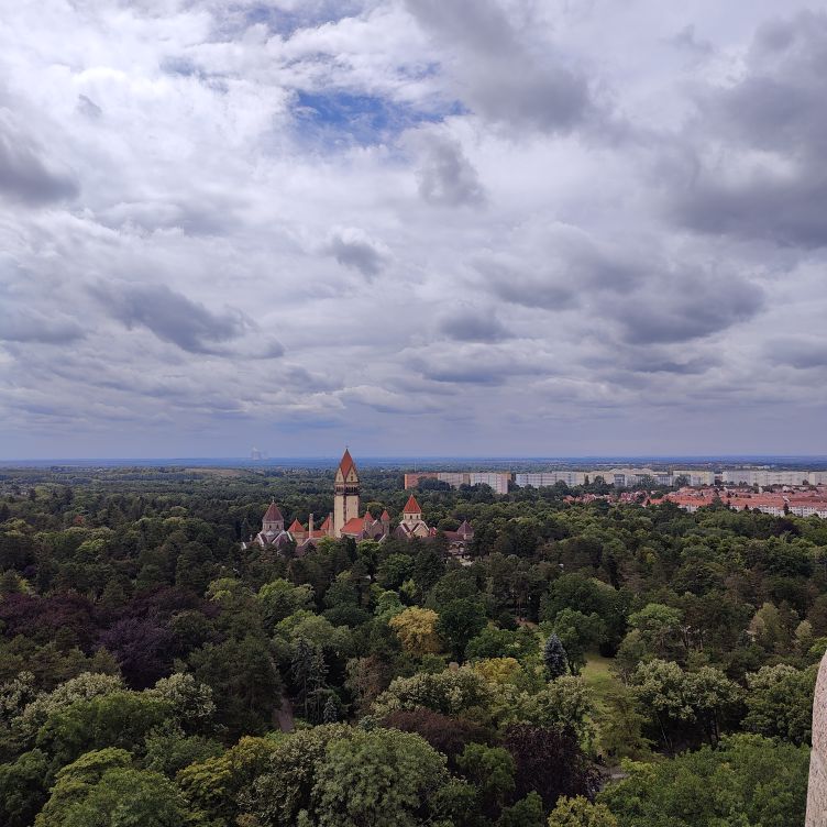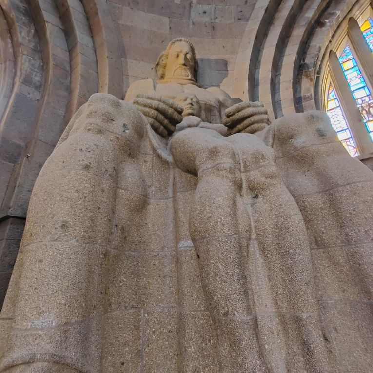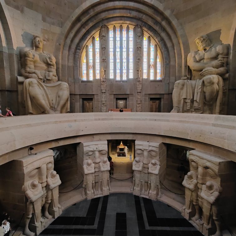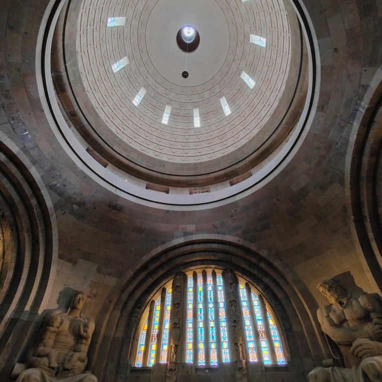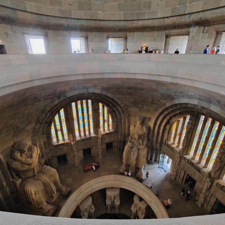 Bis zur oberen Plattform sind 500 Stufen zu überwinden, der größte Teil ist aber mit Personenaufzügen erschlossen. Wir beginnen in der Krypta und arbeiten uns zur Ruhmeshalle mit zehn Meter hohen Figuren hinauf. Über die Sängergalerie gelangen wir zur mittleren Außengalerie. Über enge Treppen geht es zur Stifterkuppel und schließlich nach oben auf die Aussichtplattform. Wir genießen den Blick von hoch oben auf die Stadt und sehen zu, dass wir wieder nach unten kommen, denn es hat zu regnen begonnen.