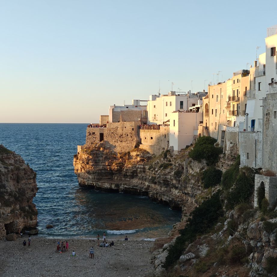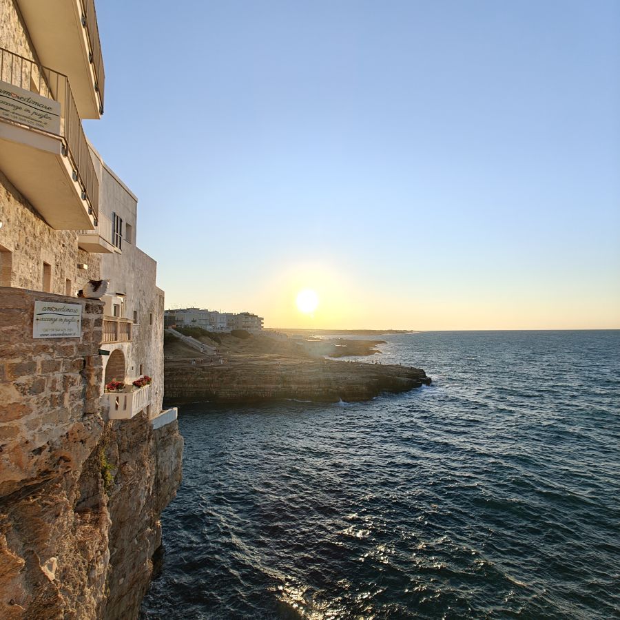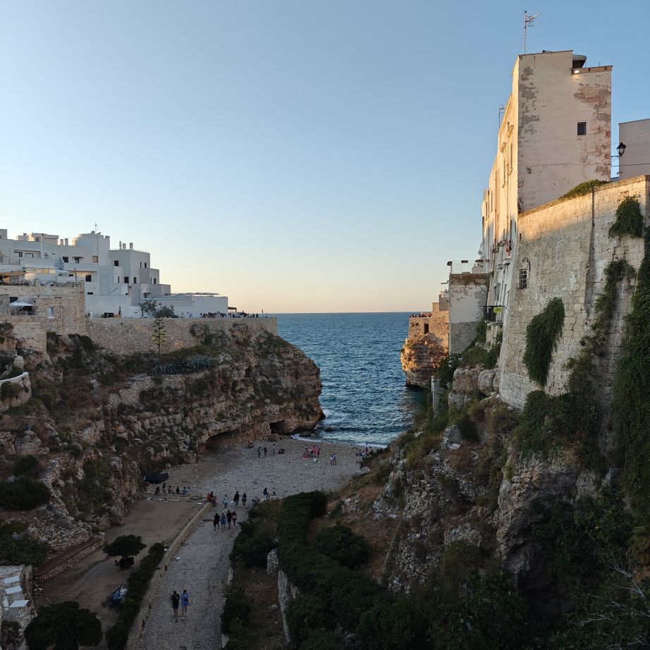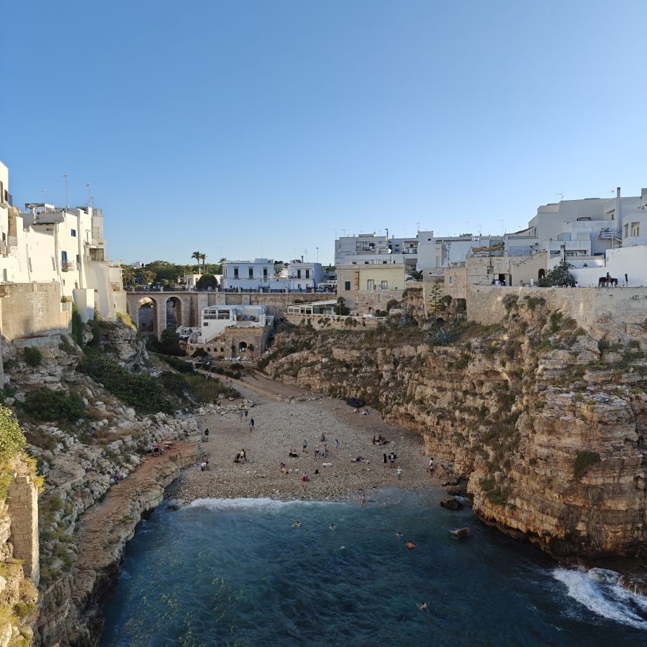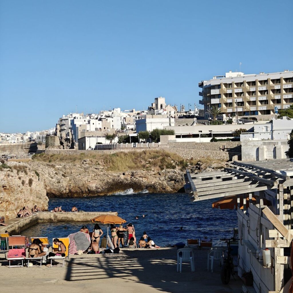 Das touristische Küstenörtchen Polignano a Mare ist nur 15 Kilometer entfernt, wir benötigen knapp eine halbe Stunde, bis wir in unsere Unterkunft Dimora Santa Caterina kommen. Das Zimmer ist geräumig, der Pool riesig. Das Beste: er gehört ganz allein uns! Wir verbringen die nächsten zwei Stunden im Wasser und auf der Liege und und genießen den Nachmittag in vollen Zügen. In der Abendsonne machen wir uns auf den Weg ins Zentrum von Polignano a Mare.
