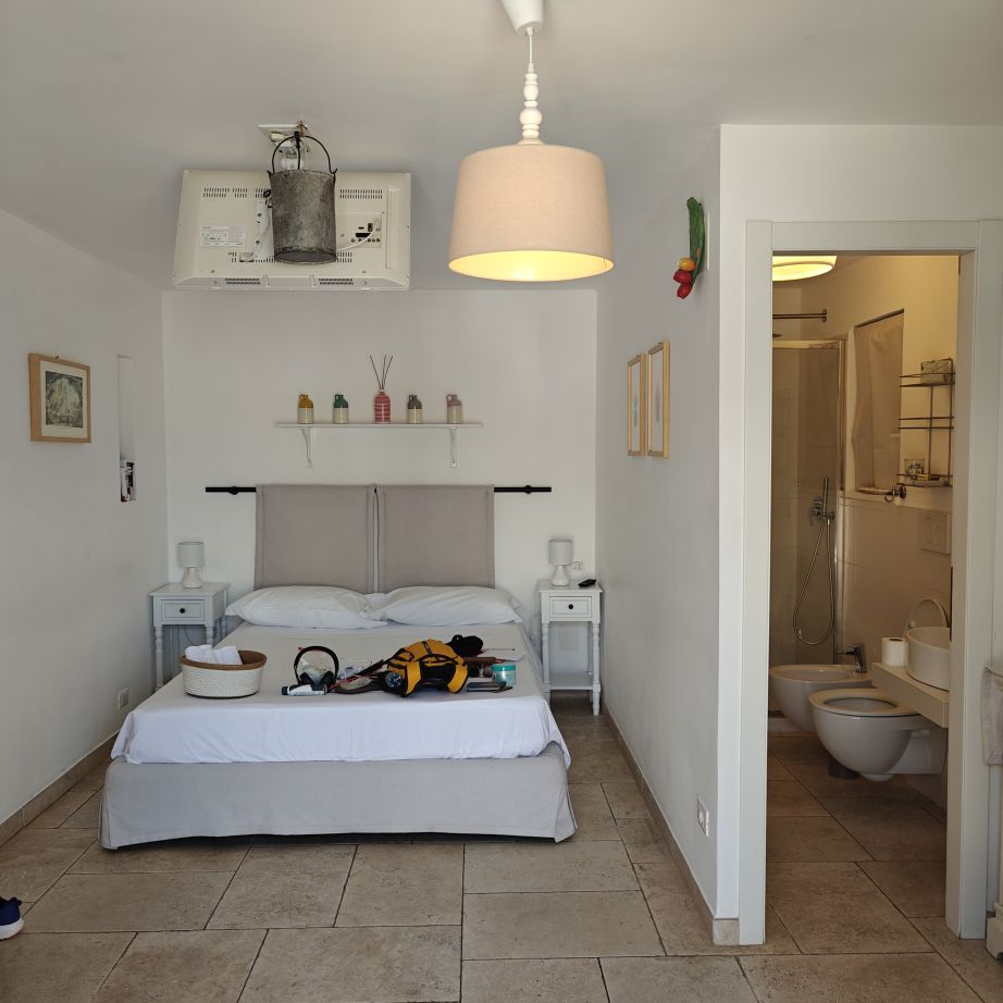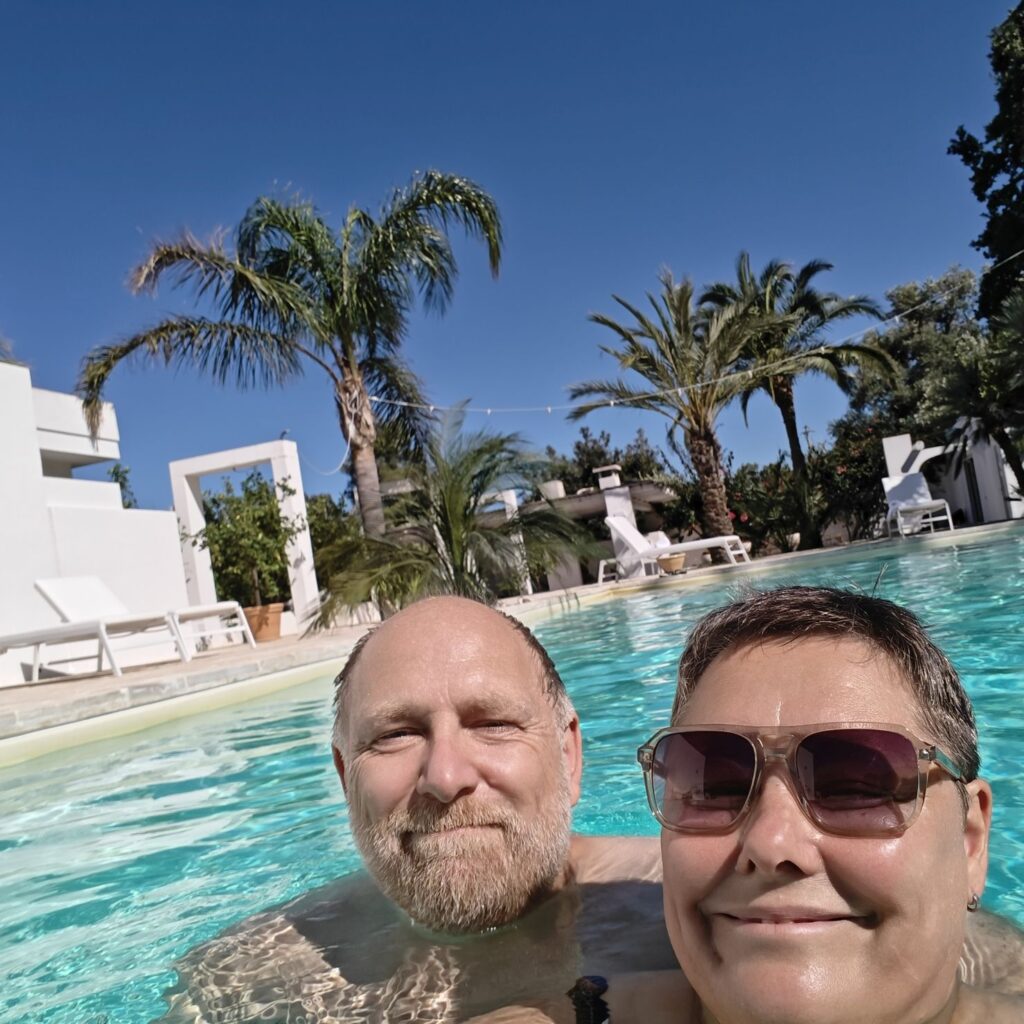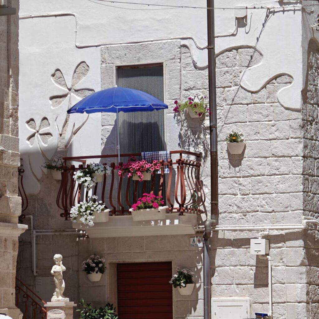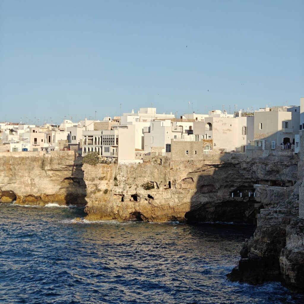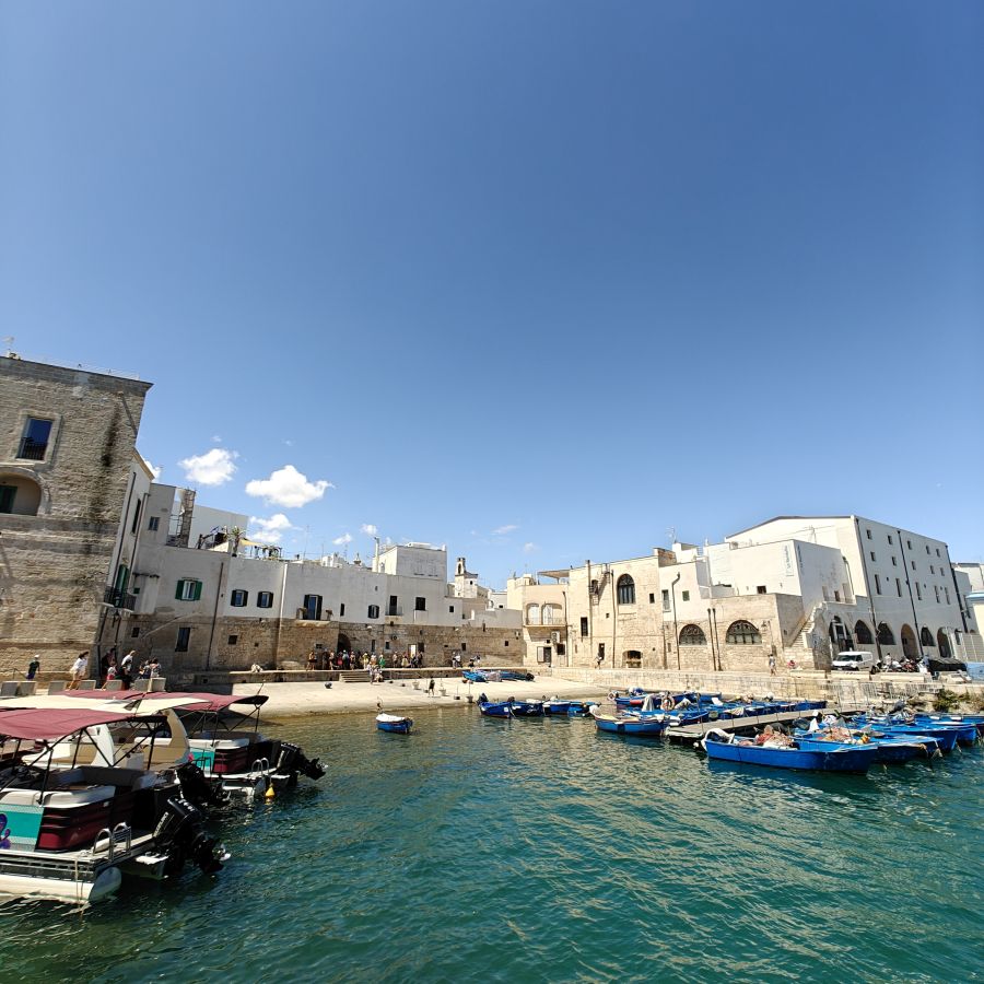 Das touristische Küstenörtchen Polignano a Mare ist nur 15 Kilometer entfernt, wir benötigen knapp eine halbe Stunde, bis wir in unsere Unterkunft Dimora Santa Caterina kommen. Das Zimmer ist geräumig, der Pool riesig. Das Beste: er gehört ganz allein uns! Wir verbringen die nächsten zwei Stunden im Wasser und auf der Liege und und genießen den Nachmittag in vollen Zügen. In der Abendsonne machen wir uns auf den Weg ins Zentrum von Polignano a Mare.