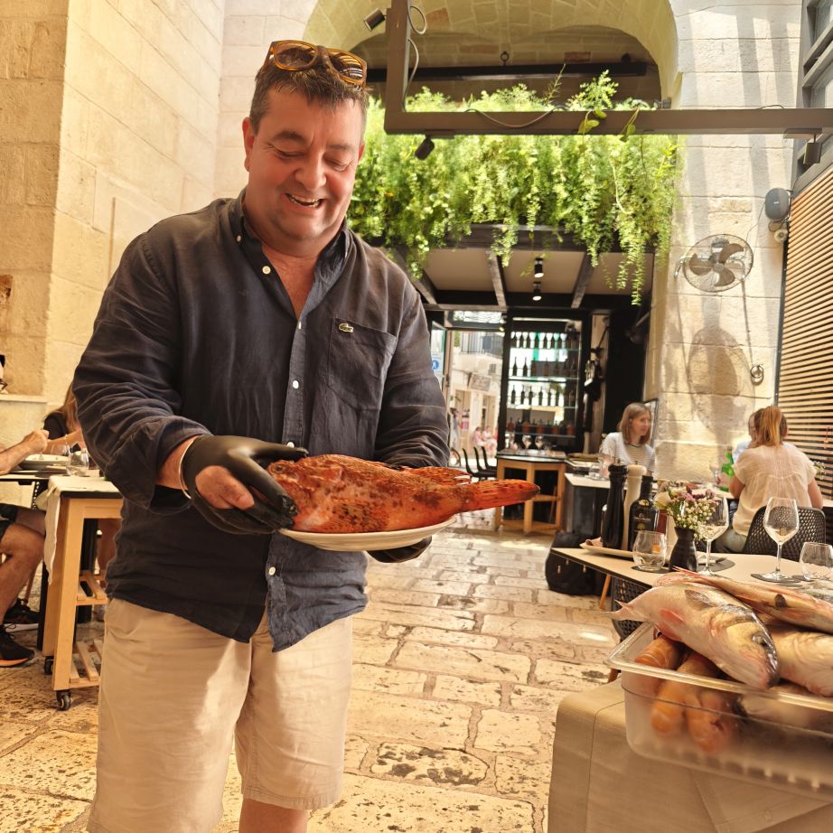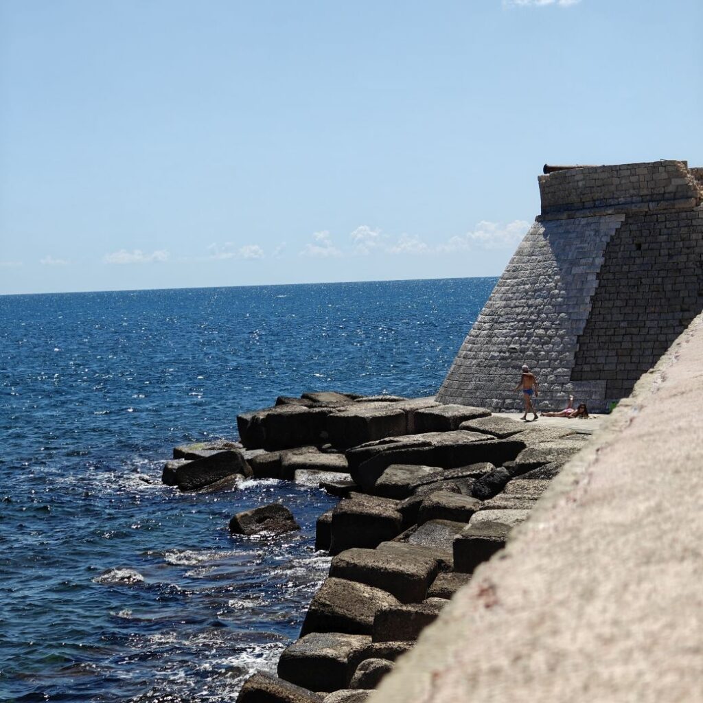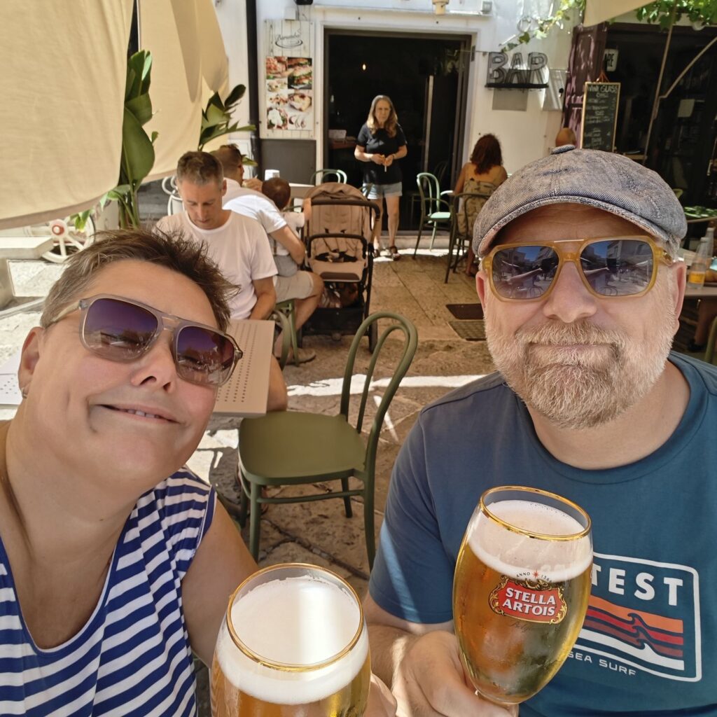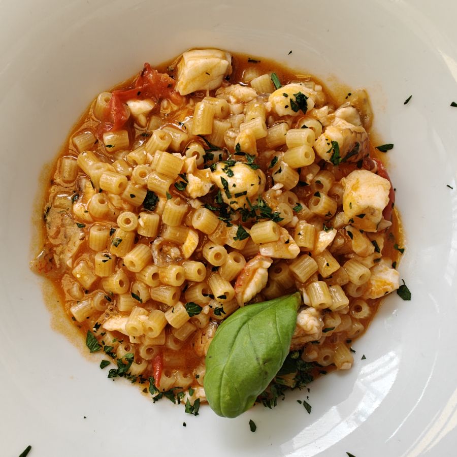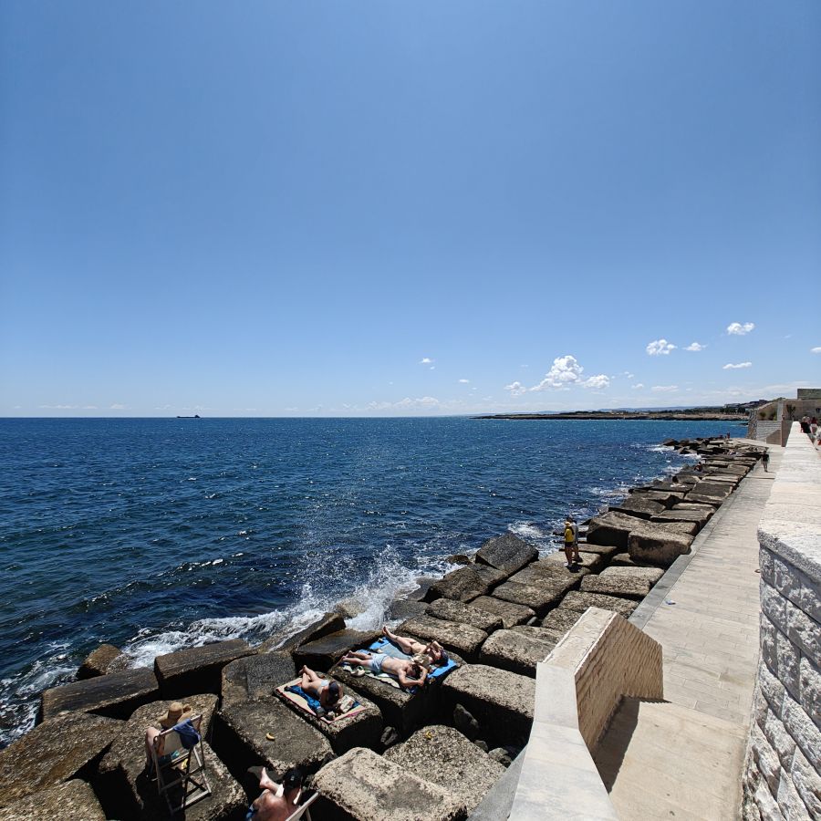 Wir parken etwas außerhalb und gehen über den Porto Antico, den alten Hafen, Richtung Altstadt. Die viele schöne Bars und typische Trattorien sorgen für einen besonderen Flair. In einer davon trinken wir zum Start ein kühles Bier. Für 12.30 Uhr haben wir einen Tisch in einem Restaurant im Innenhof eines Palazzos in der Altstadt reserviert, in dem es angeblich die besten Fischgerichte der Stadt gibt. Komera – Cucina Nostra heißt es und wird seinem Ruf mehr als gerecht. Wir sind hungrig und schlagen uns unsere Bäuche mit Crudo die Mare und Pasta mit frisch gefangenem Drachenkopf voll – dazu trinken wir eine wunderbare Flasche Fiano. Jetzt sind wir so richtig in Bella Italia angekommen!