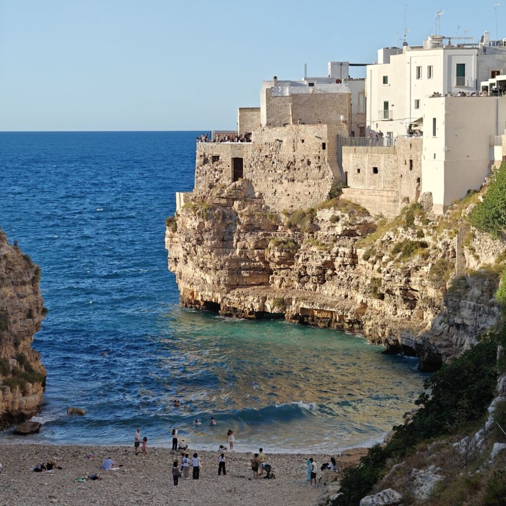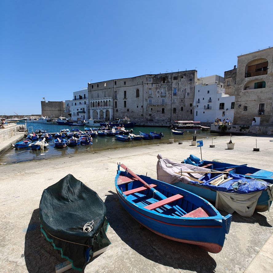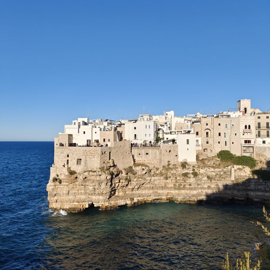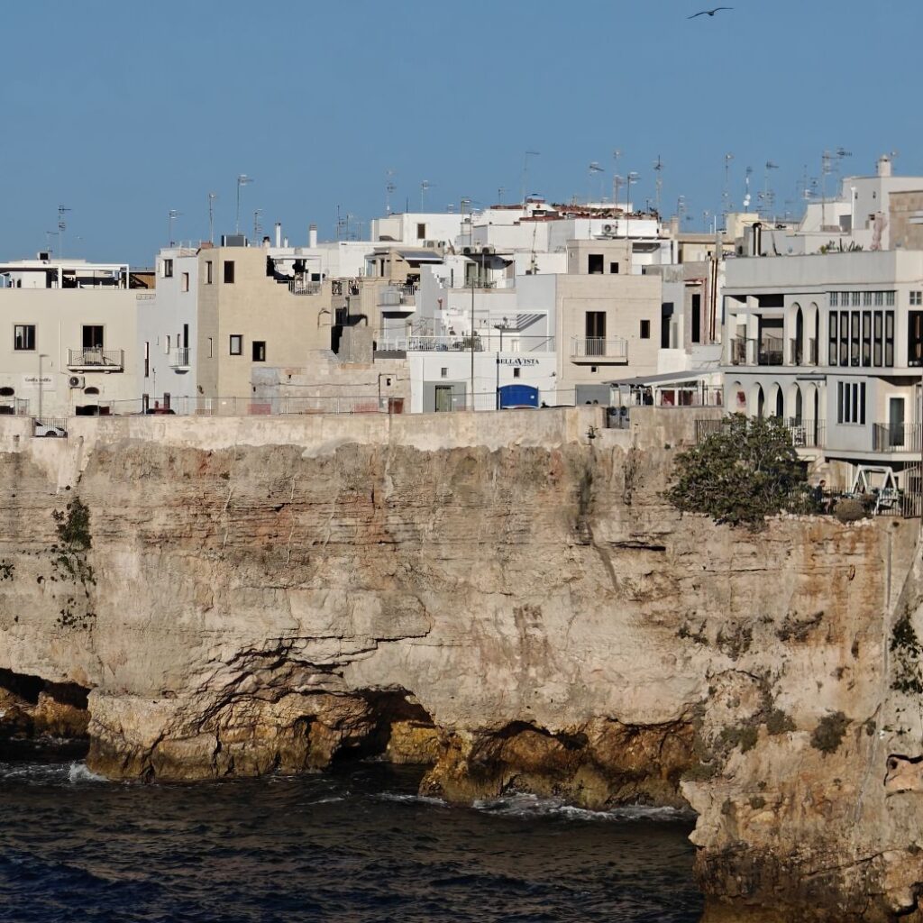 Als erste Sehenswürdigkeit kommen wir am Lama Monachile vorbei, einem idyllischen Kiesstrand zwischen schroffen Felswänden. Wir betreten die Altstadt über die Ponta Borbonico und durch ein Tor an der Piazza Giuseppe Garibaldi. Langsam schlendern wir durch enge Gässchen zu verschiedenen Aussichtspunkten. Wir erhaschen auch einen Blick auf das berühmte Höhlenrestaurant Grotta Palazzese. Ein Abend für zwei Personen kostet dort mindestens 2.000 Euro – nicht unsere Liga. Wir verlassen die Altstadt wieder und gehen direkt zum Restaurant, das wir für heute Abend gebucht haben. Im Jamanté – Experience Restaurant geht es ums Detail – auf Dekoration, Privatsphäre und gute Atmosphäre wird großen Wert gelegt. Das kulinarische Erlebnis sucht seinesgleichen. Wir essen Thunfisch mit Honig und Calvadossauce (Christoph), gegrillten Oktopus auf einem Tomatenspiegel (Claudia), als Zwischengang die berühmten Orrechiette mit Cime di Rapa Creme, Mandeln und Burrate. Der Hauptgang ist köstlich und besteht für Christoph aus einem perfekt gegarten Rib-Eye Steak und für Claudia aus einem schönen Stück Rombo (Steinbutt) mit Karottencreme. Der Koch Gianluca Torres ist einer der Vereinigung „Ambasciatori del Gusto“, ein Botschafter des Geschmacks. Wir trinken nur apulische Weine – eine Flasche Falanghina und eine Flasche Negroamaro. Nachdem bei Christoph tatsächlich noch ein Tiramisu hinunterbekommt, zahlen wir und gehen rund eine halbe Stunde zu Fuß zurück in die Unterkunft.