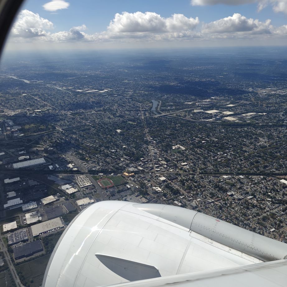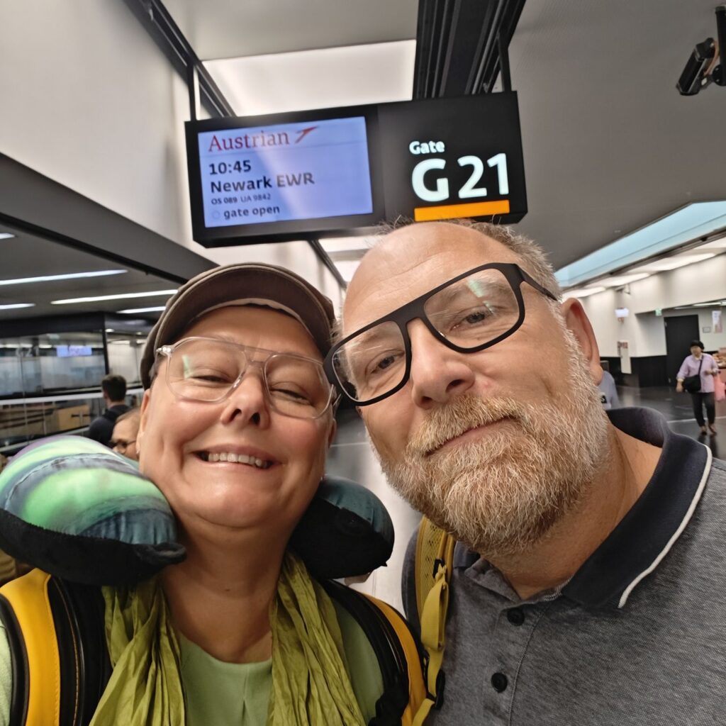 Wie immer wird bei McDonald’s gefrühstückt. Dann geht’s mit dem Zug zum Flughafen Wien, dort haben wir ausreichend, Zeit, um einzuchecken. Pünktlich um 10:45 Uhr hebt die Boeing 777-200/200ER der Austrian Airlines ab. Wir haben sehr früh gebucht und Sitze mit extra Beinfreiheit ergattert. So halten wir den neunstündigen Flug über den Atlantik gut aus. Wir sehen Filme und landen – dank der sechsstündigen Zeitverschiebung – kurz vor 14 Uhr am Flughafen Newark.