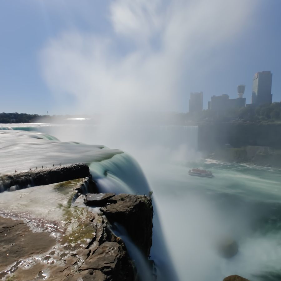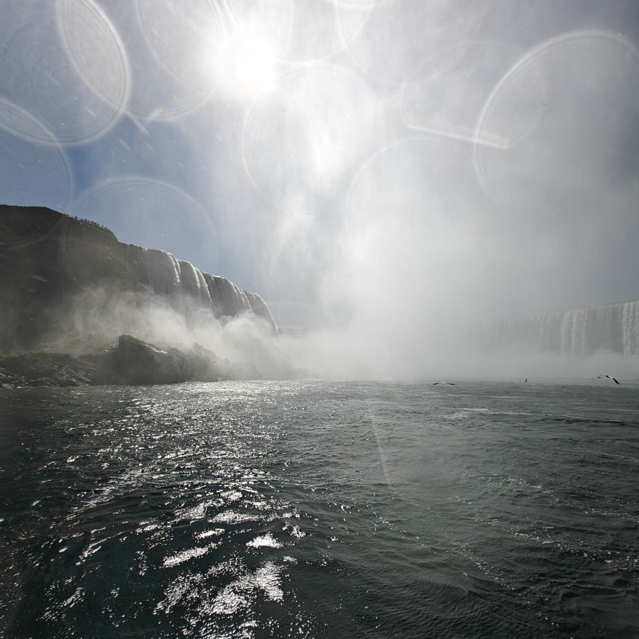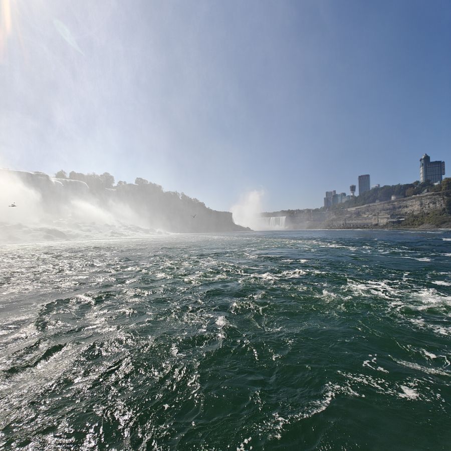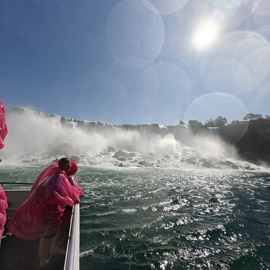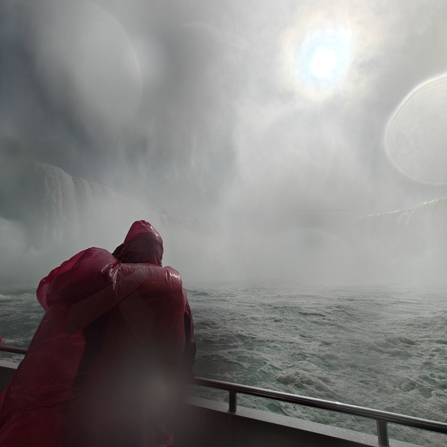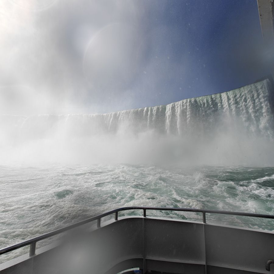 Um 11:30 Uhr haben wir eine Verabredung beim Hard Rock Cafe. Wir haben eine Tour zu den wesentlichen Attraktionen des Niagara Falls State Park gebucht. Wir treffen Mike, unseren Tourguide. Der einstige Journalist erzählt uns und den anderen Tourteilnehmern aus England, Indien und Mexiko Wissenswertes über den Park und führt uns zu unserem ersten Abenteuer: Maid of the Mist. Wir bekommen Regenpelerinen und werden auf ein Boot geschickt, das in den nächsten 15 Minuten sehr nahe an die Wasserfälle fahren wird. Für das allerbeste aber auch allernasseste Erlebnis stellen wir uns ganz vorne auf das Lower Deck. Das Boot legt ab und führt uns direkt unter den American Fall. Es ist atemberaubend und nass zugleich. Der Wasserfall hebt sich weiß leuchtend vor dem ungetrübt blauen Himmel ab. Der Sprühnebel ist dicht und vor allem nass. Es geht weiter zum Horseshoe Fall. Der hufeisenförmige Wasserfall verursacht durch seine Form eine gigantische Gischtsäule, auf die wir zielsicher zusteuern. Wir fühlen uns wie in einem Hurricane und haben Mühe, unsere Augen offenzuhalten. Es ist ein fantastisches und unvergleichliches Erlebnis. Tropfnass kommen wir zurück, die Pelerine hat das Wasser zumindest zwischen Schultern und Knien abgehalten.