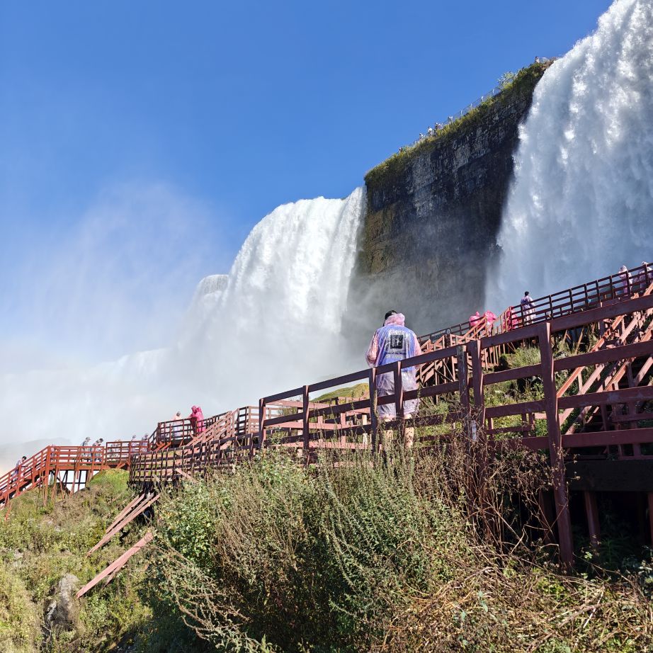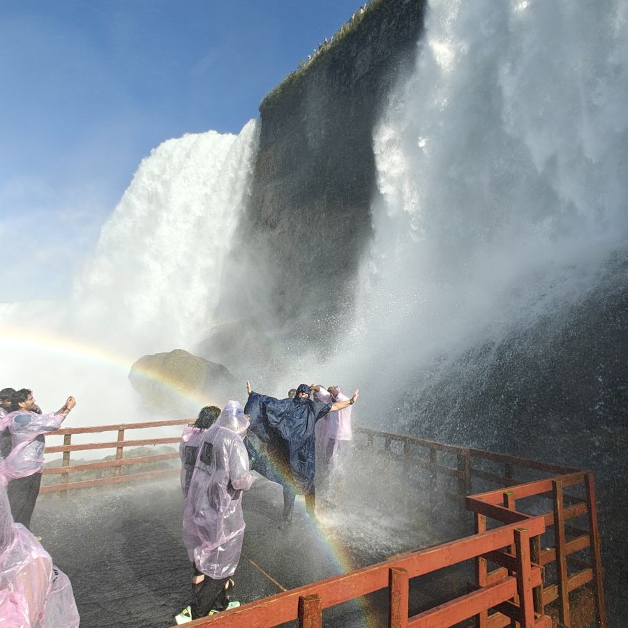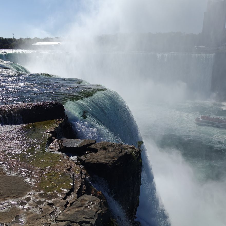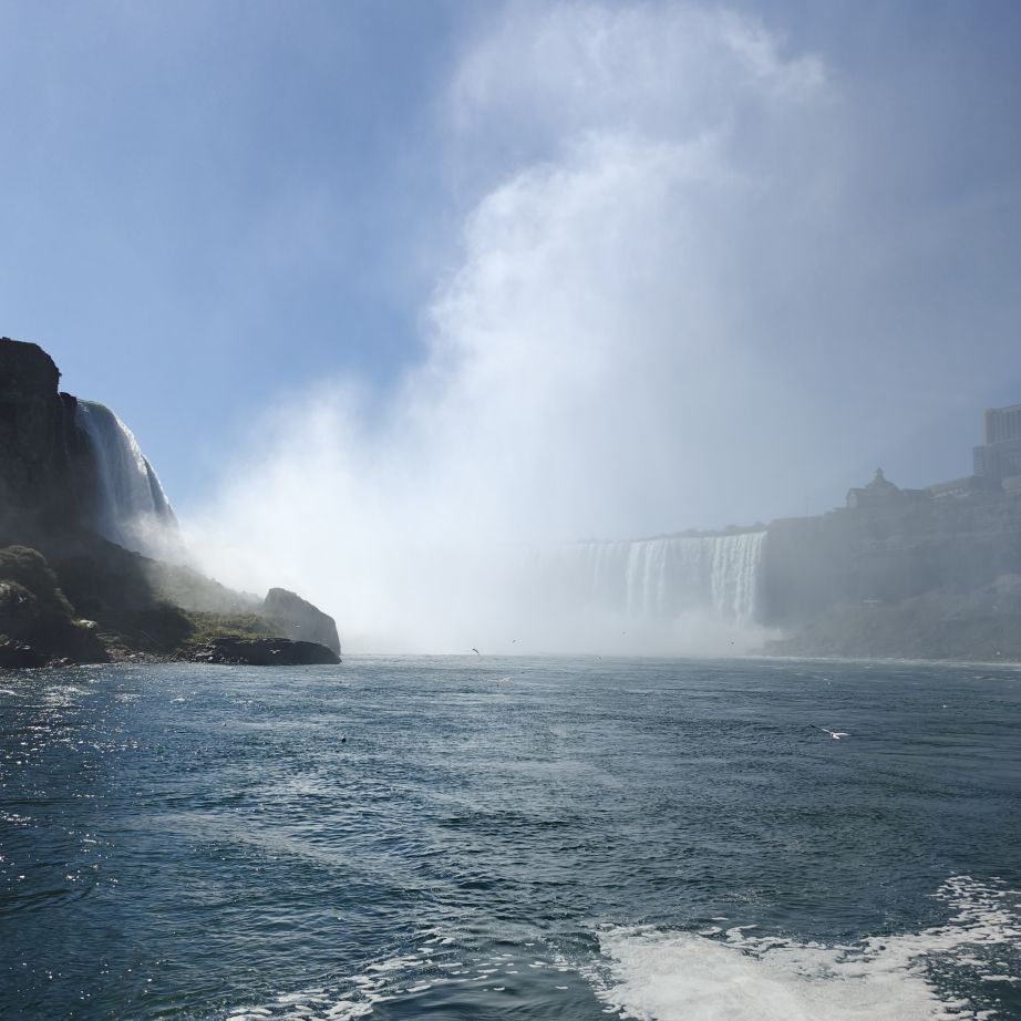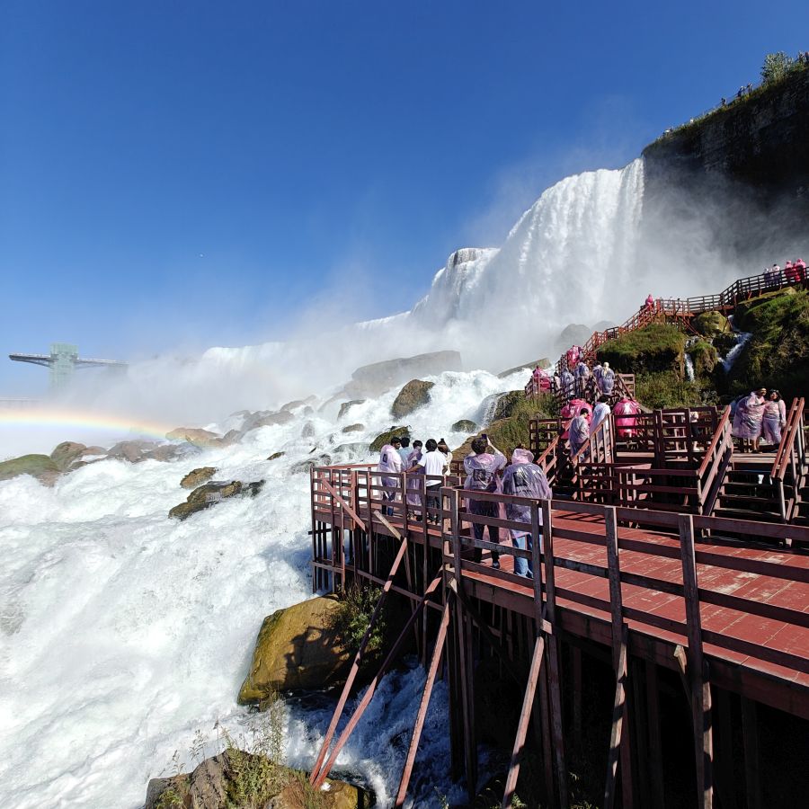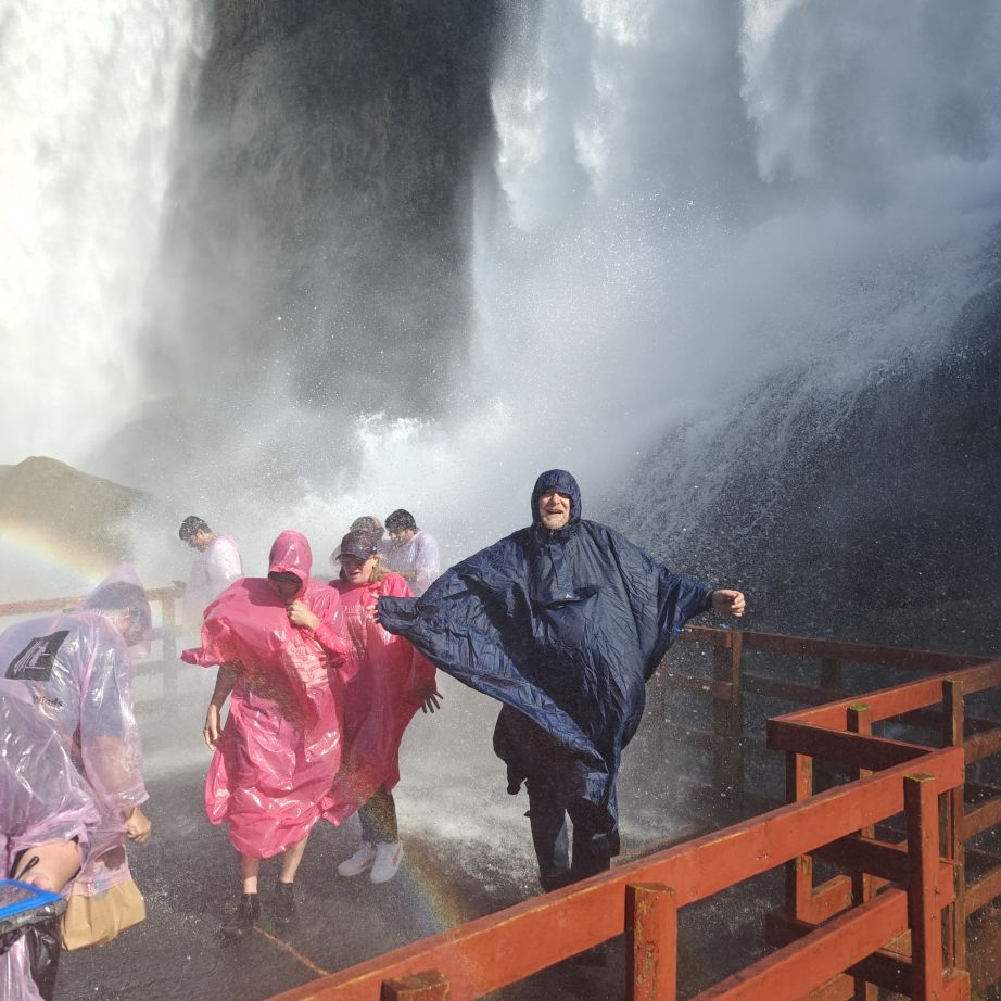 Um 11:30 Uhr haben wir eine Verabredung beim Hard Rock Cafe. Wir haben eine Tour zu den wesentlichen Attraktionen des Niagara Falls State Park gebucht. Wir treffen Mike, unseren Tourguide. Der einstige Journalist erzählt uns und den anderen Tourteilnehmern aus England, Indien und Mexiko Wissenswertes über den Park und führt uns zu unserem ersten Abenteuer: Maid of the Mist. Wir bekommen Regenpelerinen und werden auf ein Boot geschickt, das in den nächsten 15 Minuten sehr nahe an die Wasserfälle fahren wird. Für das allerbeste aber auch allernasseste Erlebnis stellen wir uns ganz vorne auf das Lower Deck. Das Boot legt ab und führt uns direkt unter den American Fall. Es ist atemberaubend und nass zugleich. Der Wasserfall hebt sich weiß leuchtend vor dem ungetrübt blauen Himmel ab. Der Sprühnebel ist dicht und vor allem nass. Es geht weiter zum Horseshoe Fall. Der hufeisenförmige Wasserfall verursacht durch seine Form eine gigantische Gischtsäule, auf die wir zielsicher zusteuern. Wir fühlen uns wie in einem Hurricane und haben Mühe, unsere Augen offenzuhalten. Es ist ein fantastisches und unvergleichliches Erlebnis. Tropfnass kommen wir zurück, die Pelerine hat das Wasser zumindest zwischen Schultern und Knien abgehalten.