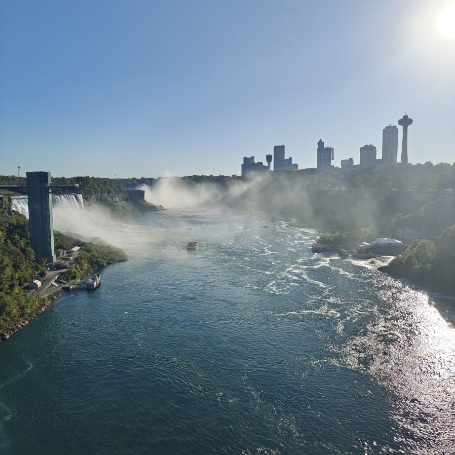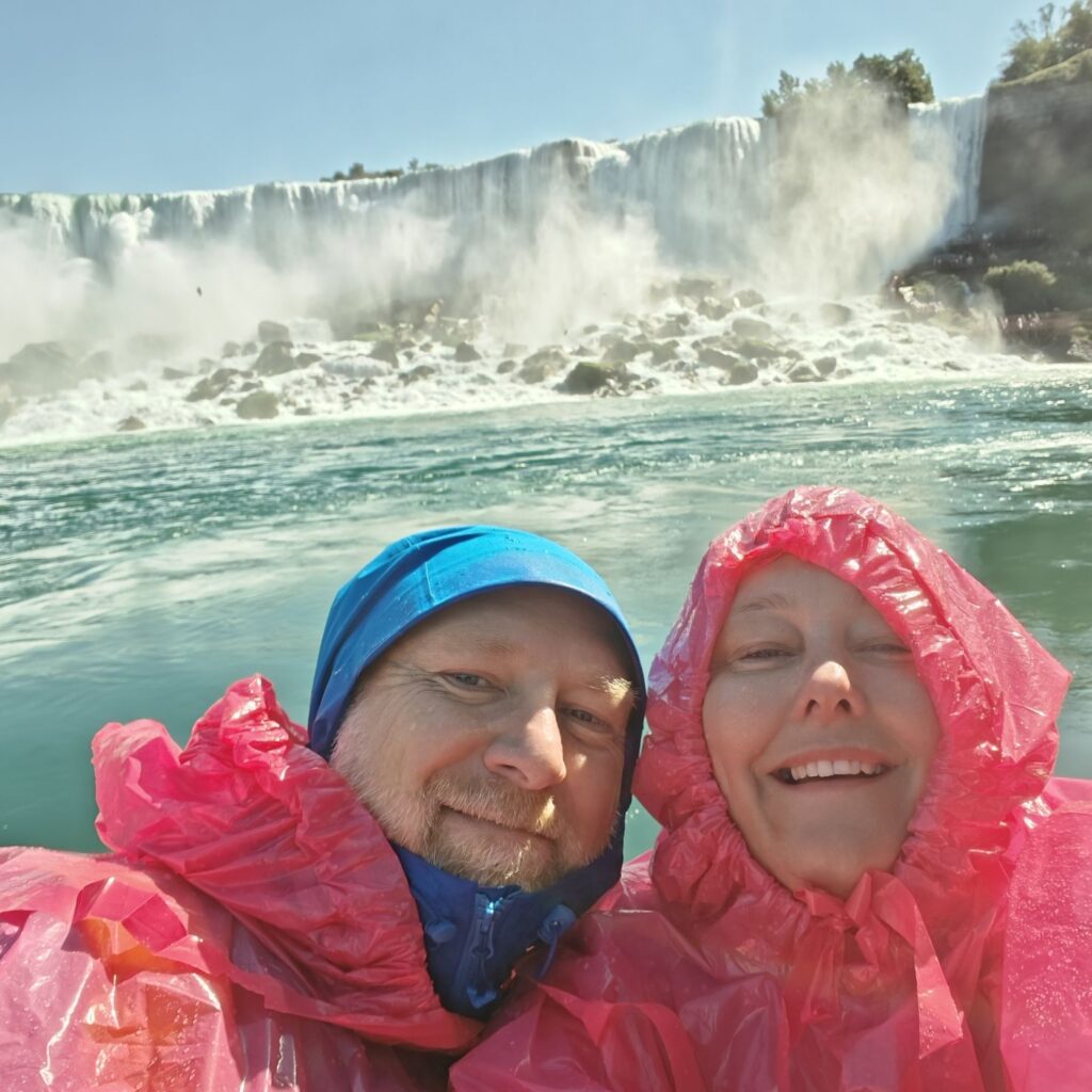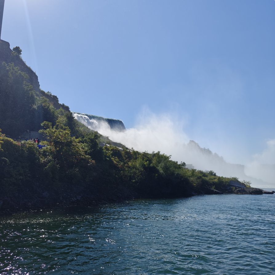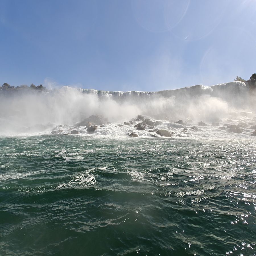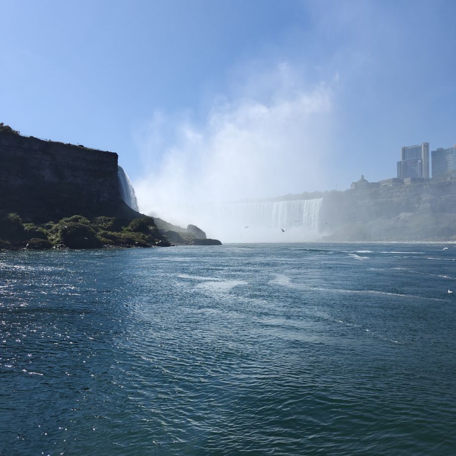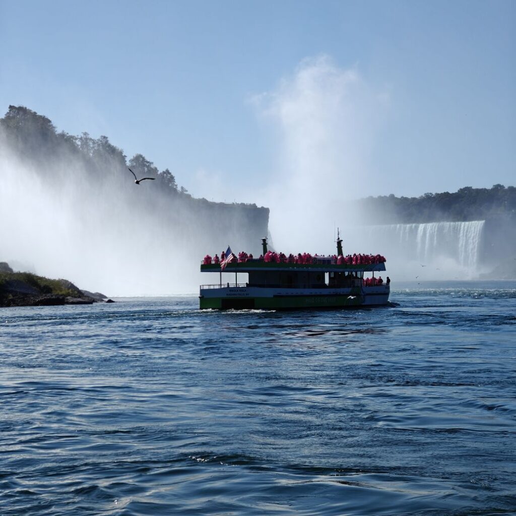 Um 11:30 Uhr haben wir eine Verabredung beim Hard Rock Cafe. Wir haben eine Tour zu den wesentlichen Attraktionen des Niagara Falls State Park gebucht. Wir treffen Mike, unseren Tourguide. Der einstige Journalist erzählt uns und den anderen Tourteilnehmern aus England, Indien und Mexiko Wissenswertes über den Park und führt uns zu unserem ersten Abenteuer: Maid of the Mist. Wir bekommen Regenpelerinen und werden auf ein Boot geschickt, das in den nächsten 15 Minuten sehr nahe an die Wasserfälle fahren wird. Für das allerbeste aber auch allernasseste Erlebnis stellen wir uns ganz vorne auf das Lower Deck. Das Boot legt ab und führt uns direkt unter den American Fall. Es ist atemberaubend und nass zugleich. Der Wasserfall hebt sich weiß leuchtend vor dem ungetrübt blauen Himmel ab. Der Sprühnebel ist dicht und vor allem nass. Es geht weiter zum Horseshoe Fall. Der hufeisenförmige Wasserfall verursacht durch seine Form eine gigantische Gischtsäule, auf die wir zielsicher zusteuern. Wir fühlen uns wie in einem Hurricane und haben Mühe, unsere Augen offenzuhalten. Es ist ein fantastisches und unvergleichliches Erlebnis. Tropfnass kommen wir zurück, die Pelerine hat das Wasser zumindest zwischen Schultern und Knien abgehalten.