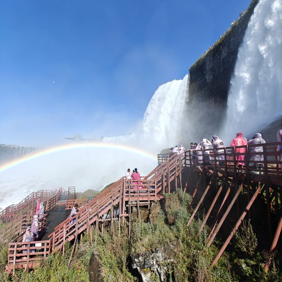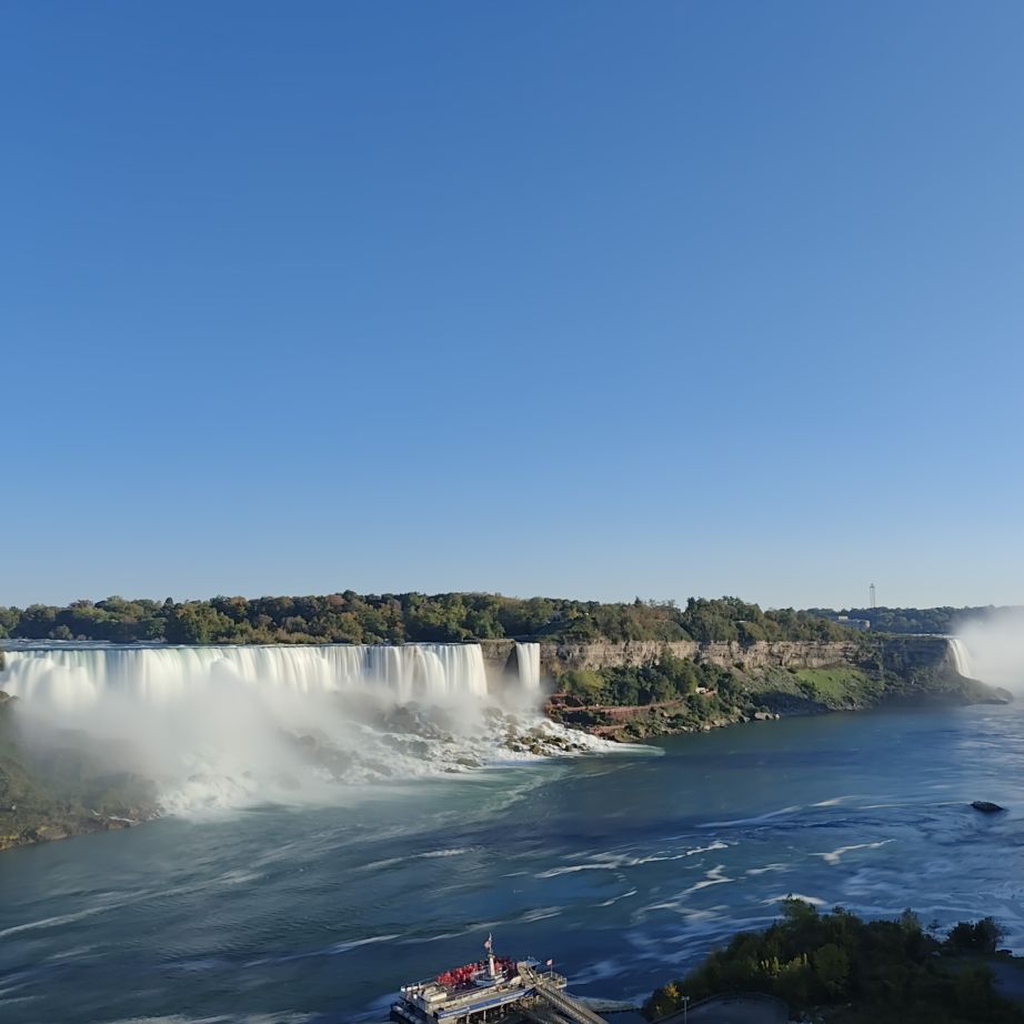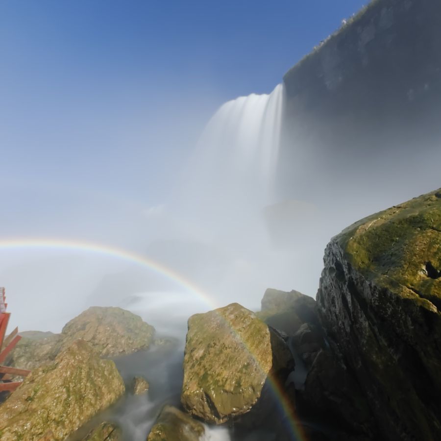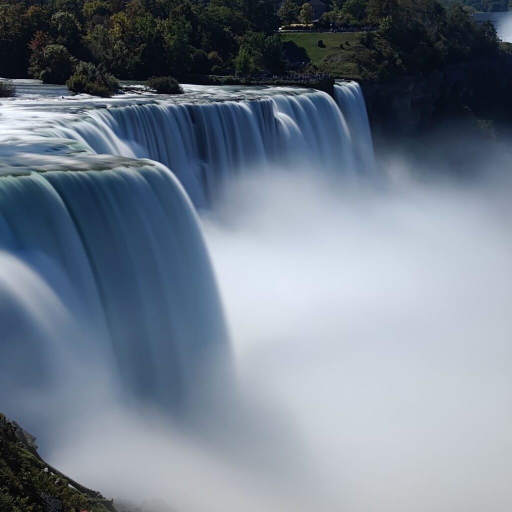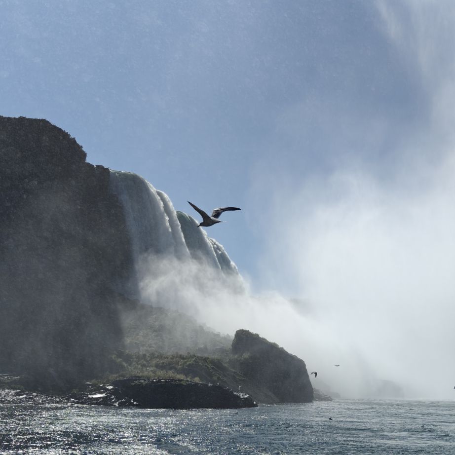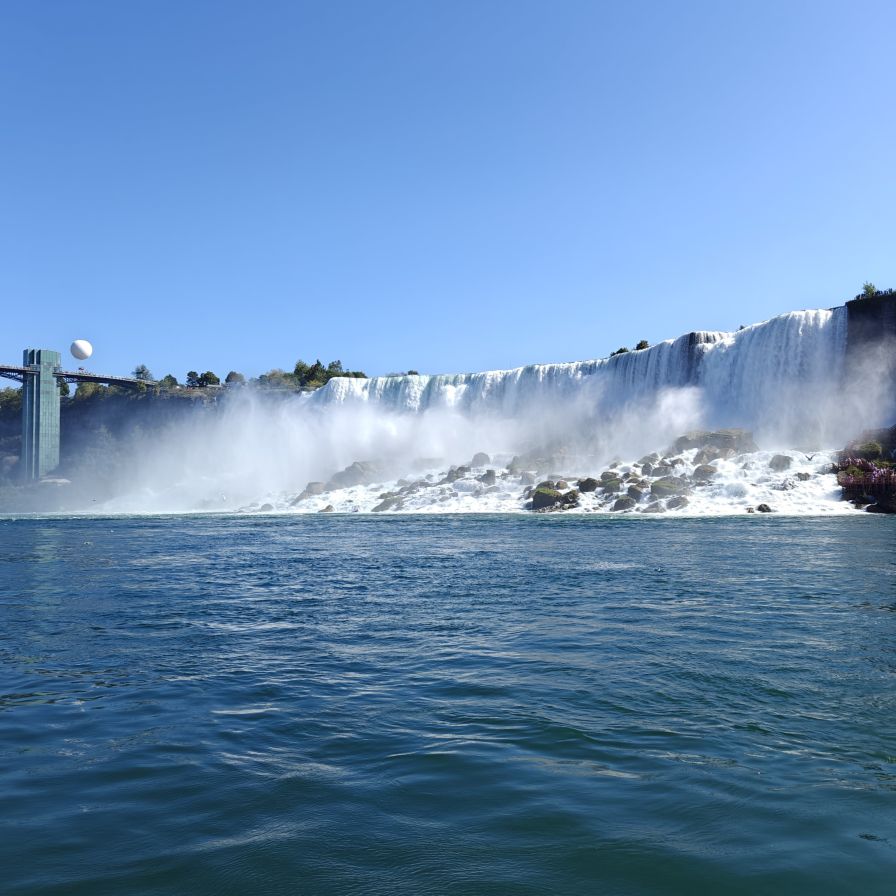 Um 11:30 Uhr haben wir eine Verabredung beim Hard Rock Cafe. Wir haben eine Tour zu den wesentlichen Attraktionen des Niagara Falls State Park gebucht. Wir treffen Mike, unseren Tourguide. Der einstige Journalist erzählt uns und den anderen Tourteilnehmern aus England, Indien und Mexiko Wissenswertes über den Park und führt uns zu unserem ersten Abenteuer: Maid of the Mist. Wir bekommen Regenpelerinen und werden auf ein Boot geschickt, das in den nächsten 15 Minuten sehr nahe an die Wasserfälle fahren wird. Für das allerbeste aber auch allernasseste Erlebnis stellen wir uns ganz vorne auf das Lower Deck. Das Boot legt ab und führt uns direkt unter den American Fall. Es ist atemberaubend und nass zugleich. Der Wasserfall hebt sich weiß leuchtend vor dem ungetrübt blauen Himmel ab. Der Sprühnebel ist dicht und vor allem nass. Es geht weiter zum Horseshoe Fall. Der hufeisenförmige Wasserfall verursacht durch seine Form eine gigantische Gischtsäule, auf die wir zielsicher zusteuern. Wir fühlen uns wie in einem Hurricane und haben Mühe, unsere Augen offenzuhalten. Es ist ein fantastisches und unvergleichliches Erlebnis. Tropfnass kommen wir zurück, die Pelerine hat das Wasser zumindest zwischen Schultern und Knien abgehalten.
