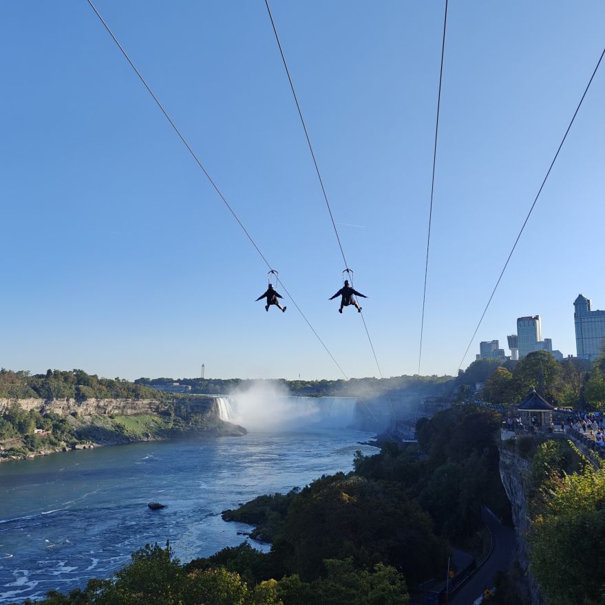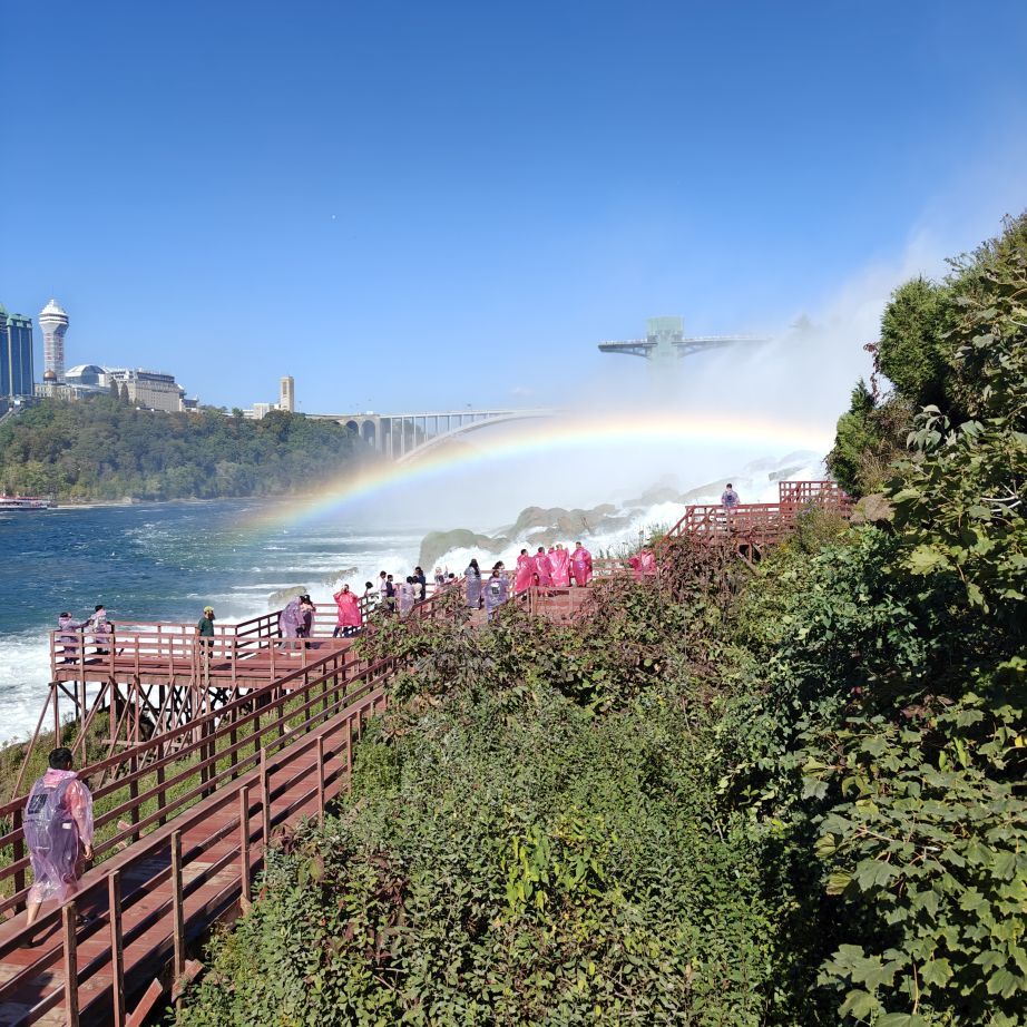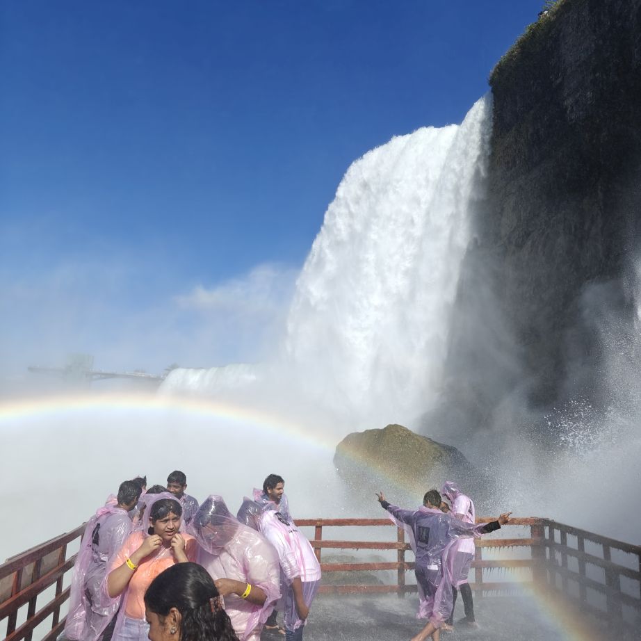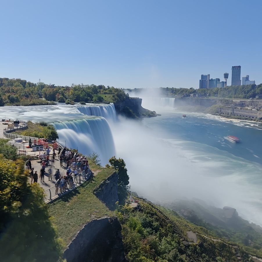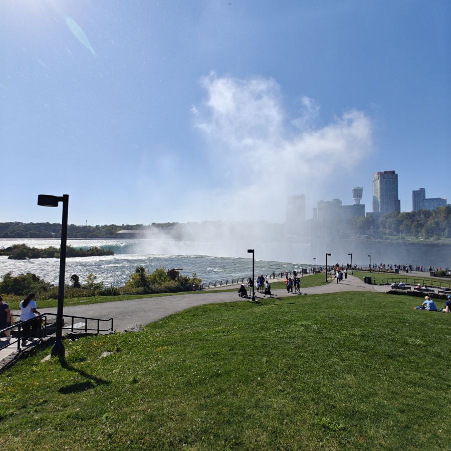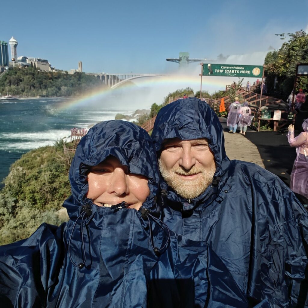 Um 11:30 Uhr haben wir eine Verabredung beim Hard Rock Cafe. Wir haben eine Tour zu den wesentlichen Attraktionen des Niagara Falls State Park gebucht. Wir treffen Mike, unseren Tourguide. Der einstige Journalist erzählt uns und den anderen Tourteilnehmern aus England, Indien und Mexiko Wissenswertes über den Park und führt uns zu unserem ersten Abenteuer: Maid of the Mist. Wir bekommen Regenpelerinen und werden auf ein Boot geschickt, das in den nächsten 15 Minuten sehr nahe an die Wasserfälle fahren wird. Für das allerbeste aber auch allernasseste Erlebnis stellen wir uns ganz vorne auf das Lower Deck. Das Boot legt ab und führt uns direkt unter den American Fall. Es ist atemberaubend und nass zugleich. Der Wasserfall hebt sich weiß leuchtend vor dem ungetrübt blauen Himmel ab. Der Sprühnebel ist dicht und vor allem nass. Es geht weiter zum Horseshoe Fall. Der hufeisenförmige Wasserfall verursacht durch seine Form eine gigantische Gischtsäule, auf die wir zielsicher zusteuern. Wir fühlen uns wie in einem Hurricane und haben Mühe, unsere Augen offenzuhalten. Es ist ein fantastisches und unvergleichliches Erlebnis. Tropfnass kommen wir zurück, die Pelerine hat das Wasser zumindest zwischen Schultern und Knien abgehalten.