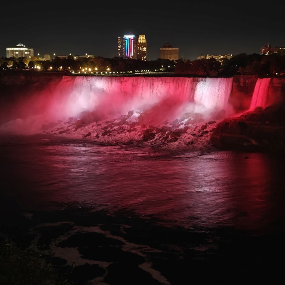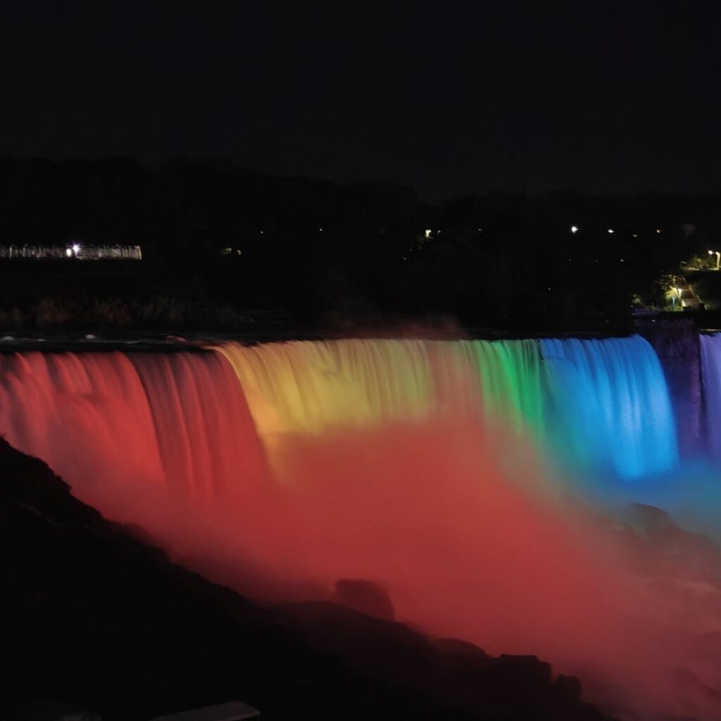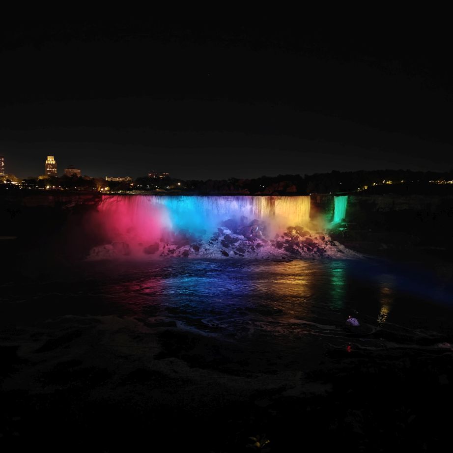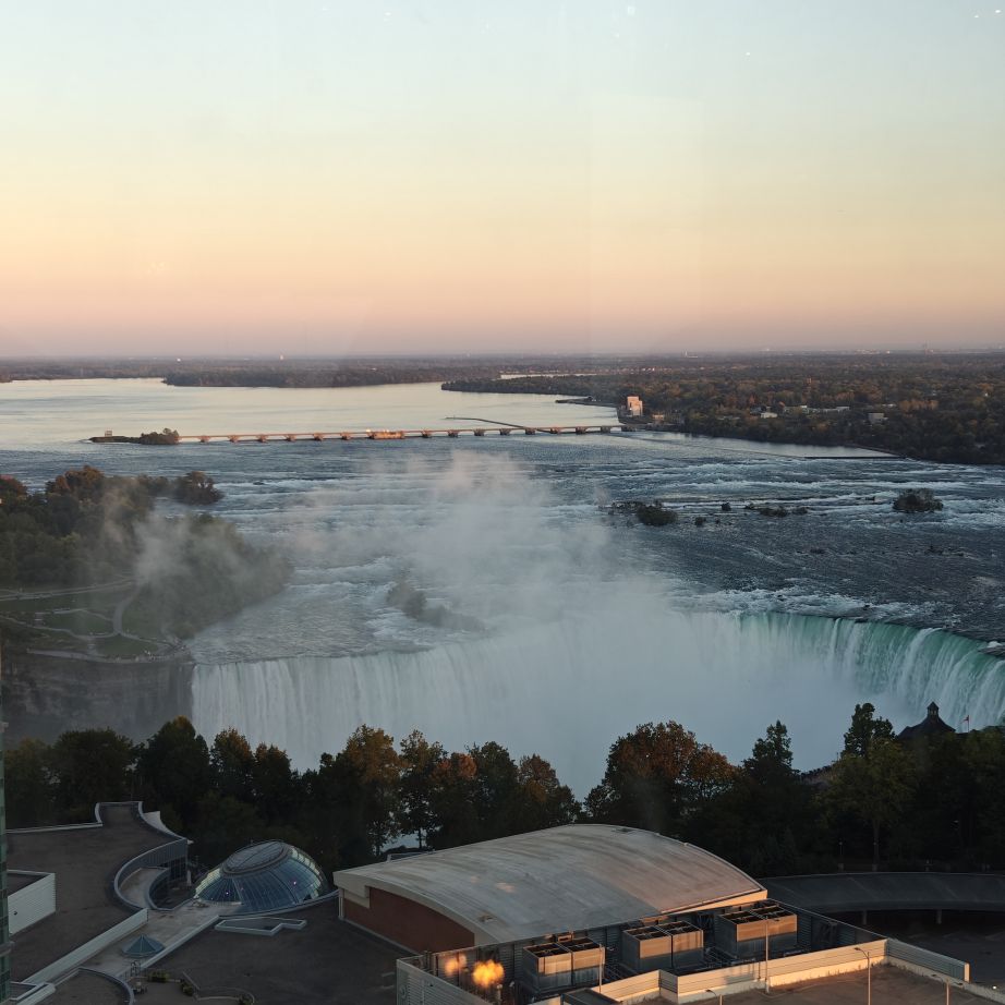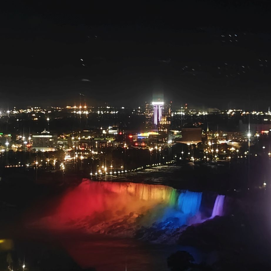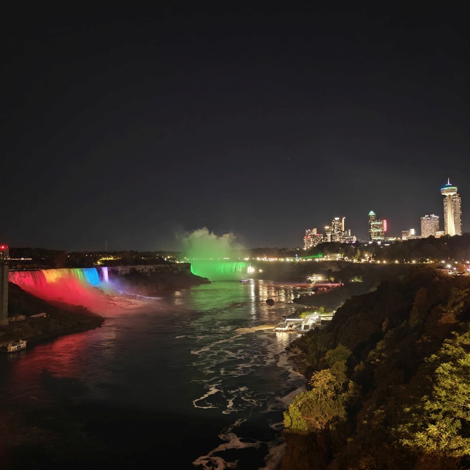 Den heutigen Abend werden wir auf der kanadischen Seite von Niagara Falls verbringen. Dazu gehen wir zu Fuß über die Rainbow-Bridge, die gleichzeitig die Grenze zwischen den USA und Kanada ist. Bei der Einreise müssen wir uns gegenüber einer Zollbeamtin erklären und Reisepässe vorweisen. Wir gehen direkt zum Fallsview Trail und haben einen völlig neuen Blick auf die Wasserfälle. Um 18 Uhr haben wir einen Tisch im Watermark Restaurant im 33. Stock des Hilton reserviert. Wir bekommen einen Tisch direkt am Fenster mit Blick auf die Niagarafälle. Während wir unser exzellentes dreigängiges Menü essen, wird es dunkel und die Wasserfälle wechseln alle 15 Minuten die Farbe. Nach drei Stunden sind wir fertig mit Dinner und gehen noch einmal retour zum Fallsview Trail. Die Wasserfälle ändern mittlerweile im Minutentakt ihre Farbe, am schönsten ist die Regebogenbeleuchtung. Eine kleine Spitze Kanadas Richtung USA?