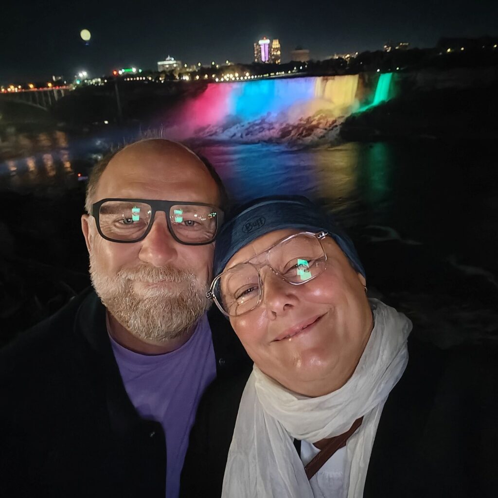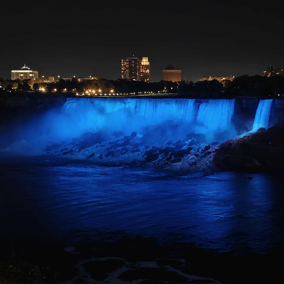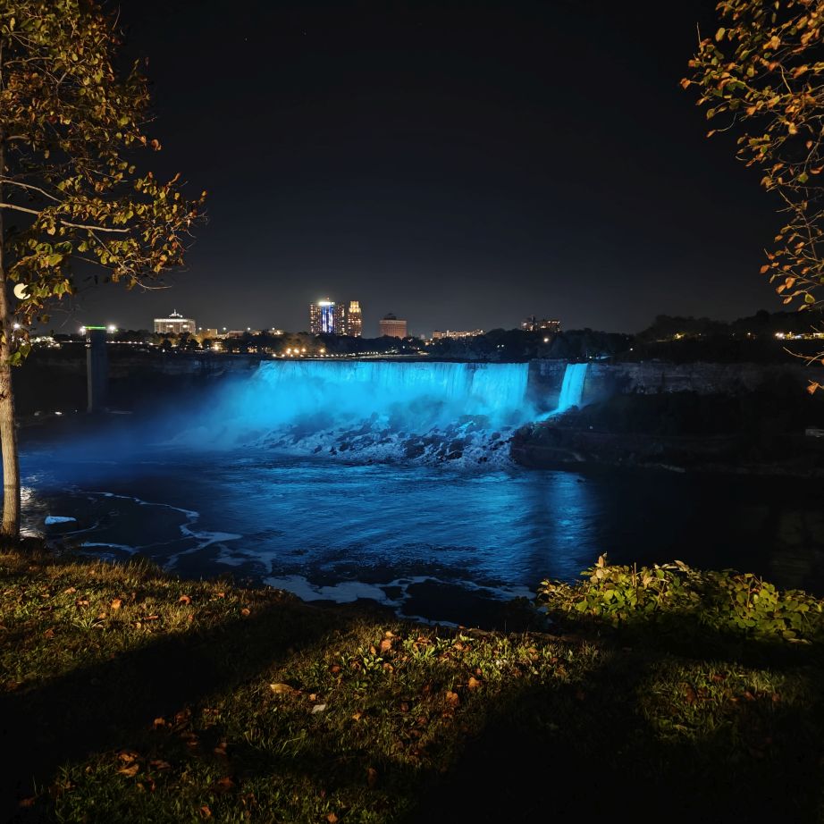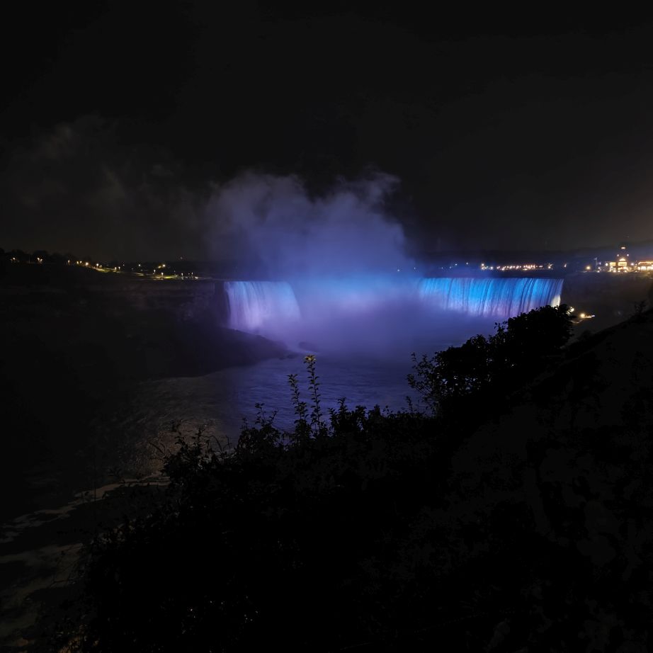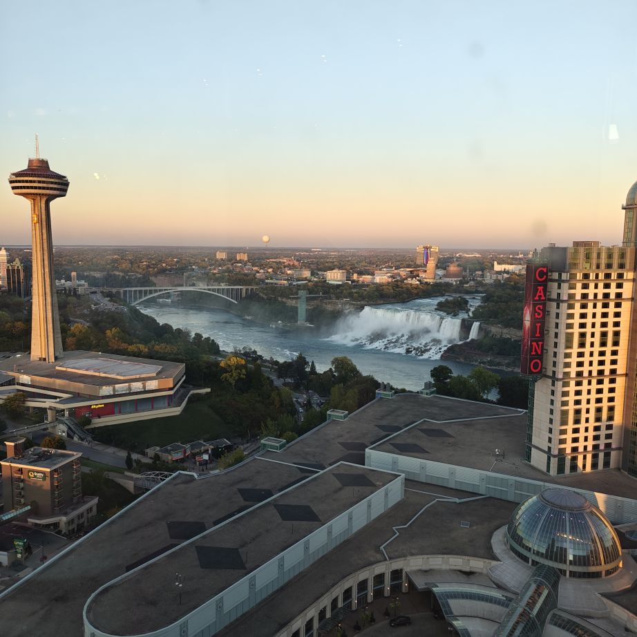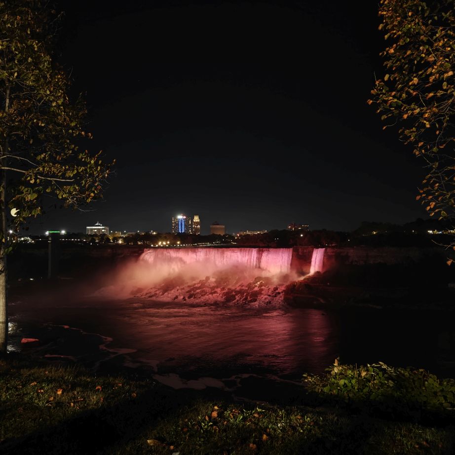 Den heutigen Abend werden wir auf der kanadischen Seite von Niagara Falls verbringen. Dazu gehen wir zu Fuß über die Rainbow-Bridge, die gleichzeitig die Grenze zwischen den USA und Kanada ist. Bei der Einreise müssen wir uns gegenüber einer Zollbeamtin erklären und Reisepässe vorweisen. Wir gehen direkt zum Fallsview Trail und haben einen völlig neuen Blick auf die Wasserfälle. Um 18 Uhr haben wir einen Tisch im Watermark Restaurant im 33. Stock des Hilton reserviert. Wir bekommen einen Tisch direkt am Fenster mit Blick auf die Niagarafälle. Während wir unser exzellentes dreigängiges Menü essen, wird es dunkel und die Wasserfälle wechseln alle 15 Minuten die Farbe. Nach drei Stunden sind wir fertig mit Dinner und gehen noch einmal retour zum Fallsview Trail. Die Wasserfälle ändern mittlerweile im Minutentakt ihre Farbe, am schönsten ist die Regebogenbeleuchtung. Eine kleine Spitze Kanadas Richtung USA?