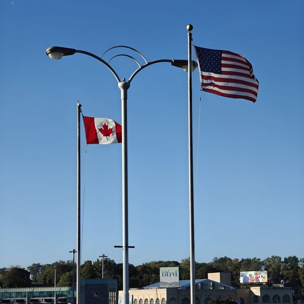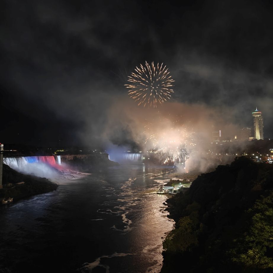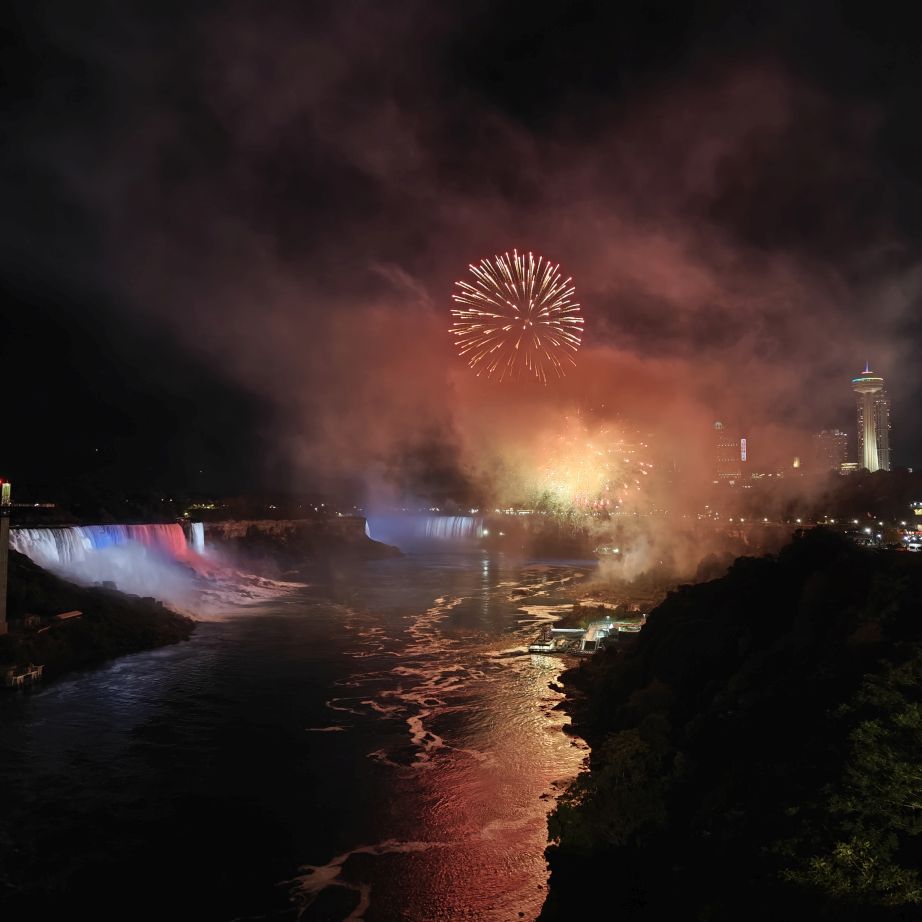 Kurz vor 22 Uhr erreichen wir die Regenbogenbrücke, genau rechtzeitig, um das Feuerwerk von der Staatsgrenze aus zu sehen. Es ist genau die gleiche Show wie tags zuvor, allerdings ist unser Blickwinkel darauf viel besser. Nach dem Spektakel passieren wir mittels Gesichtserkennung die US-Grenze. Nach ein paar Fragen und dem Bezahlen einer Brückenmaut von 1,25 USD pro Person dürfen wir einreisen.