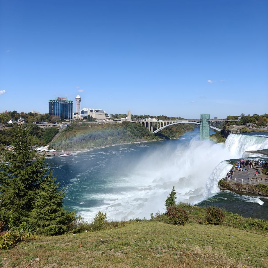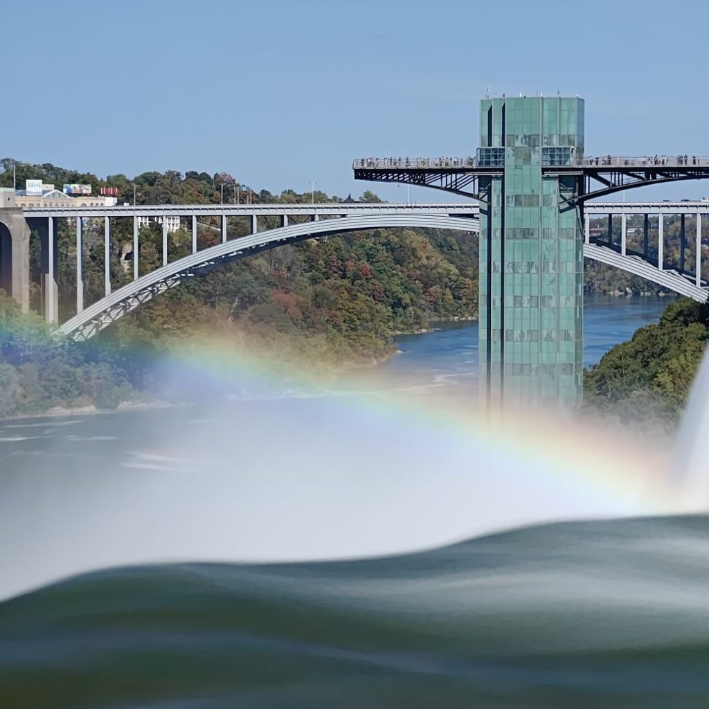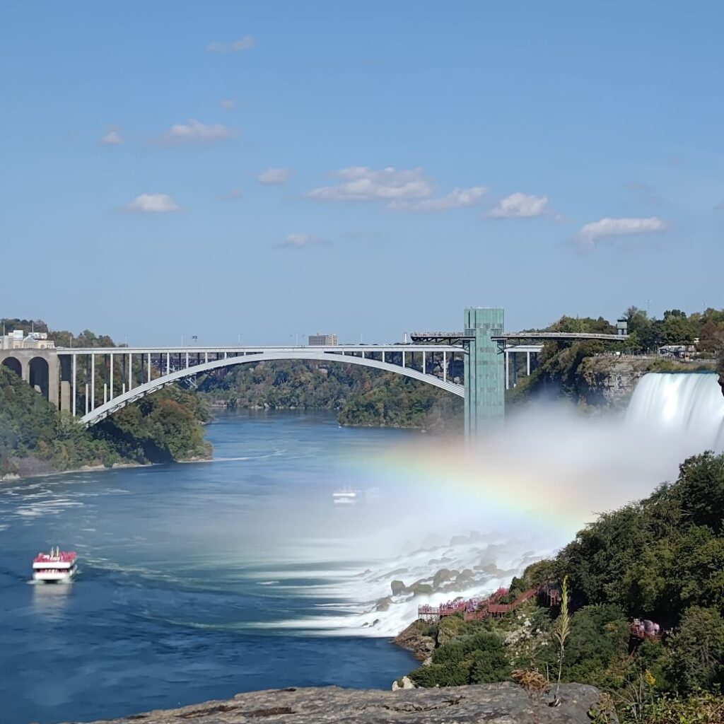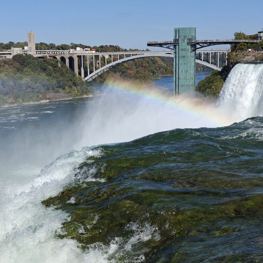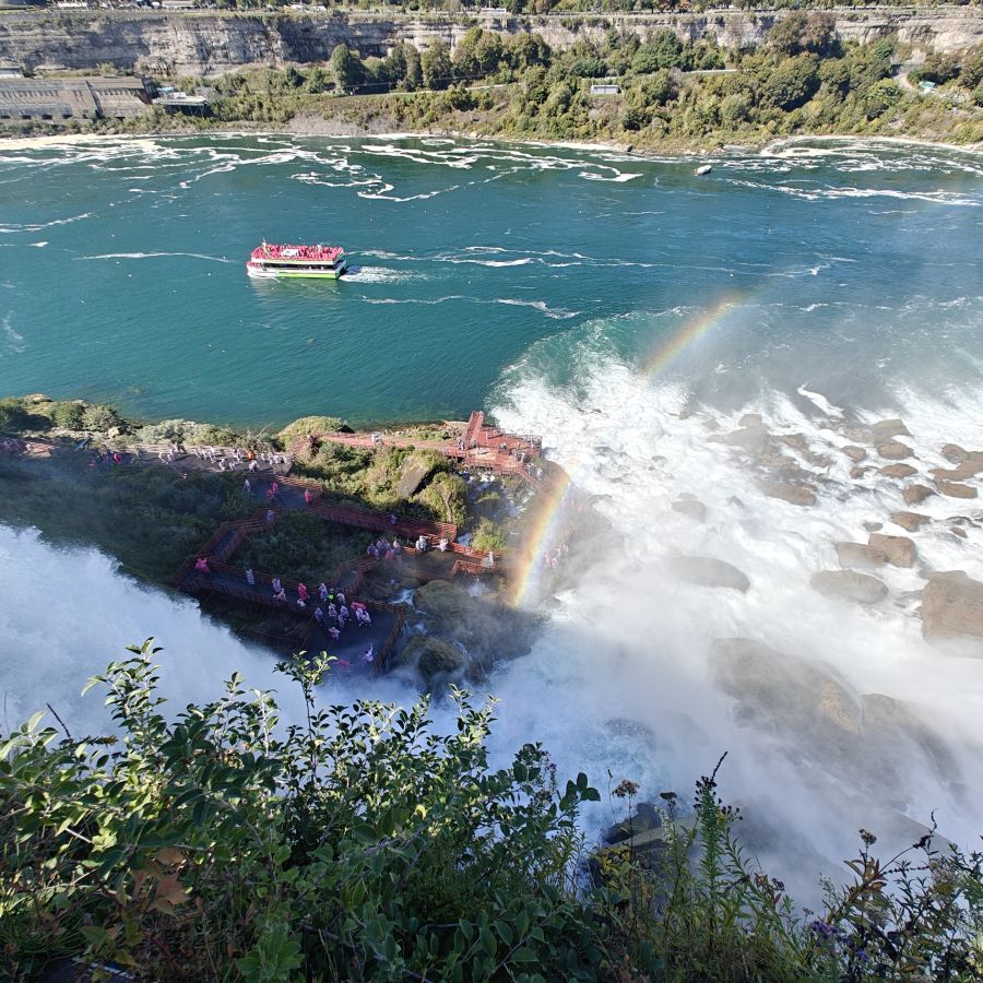 Mike führt uns weiter nach Goat Island zum Aussichtspunkt Richtung American Falls. Dort leuchtet ein Regenbogen mit der strahlend weißen Gischt um die Wette. Dann gehen wir weiter zu den Horseshoe Falls, bei denen wir gestern Abend schon waren. Tagsüber sieht der gebogene Wasserfall ganz anders aus.