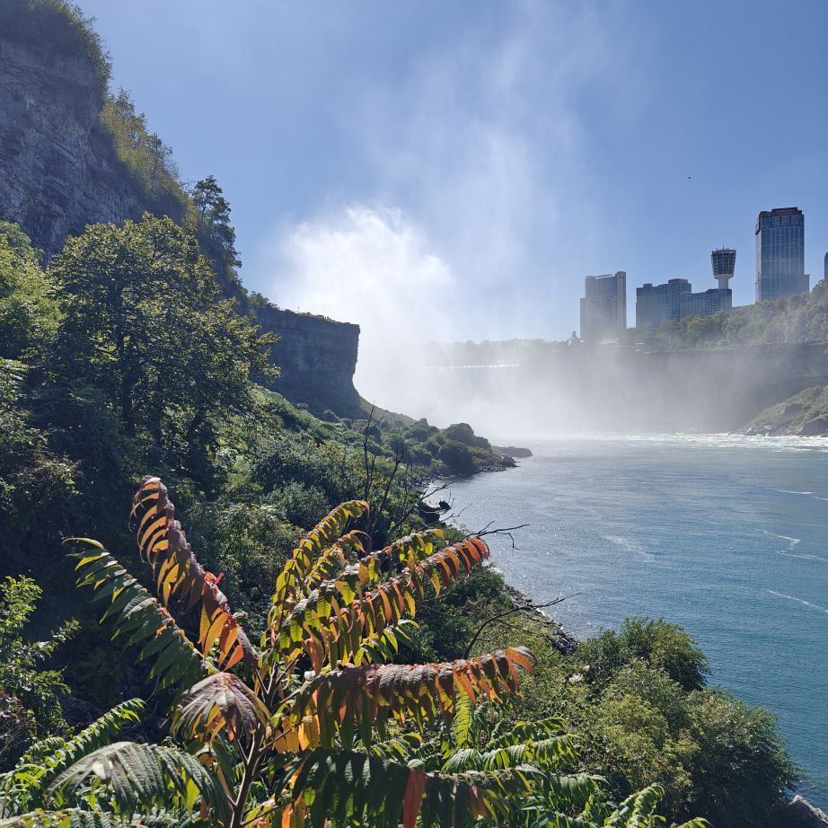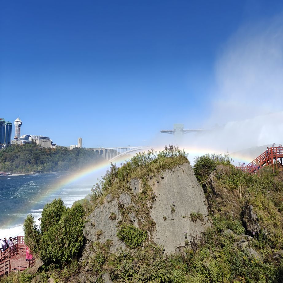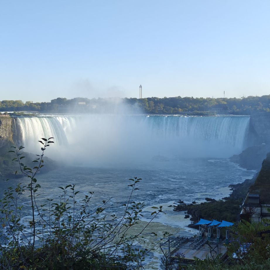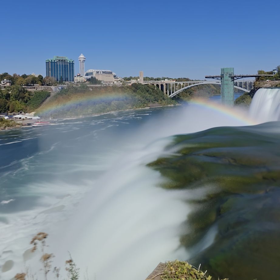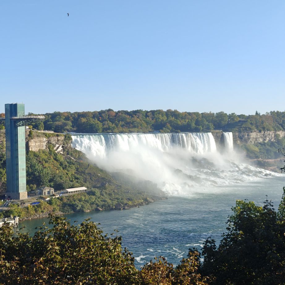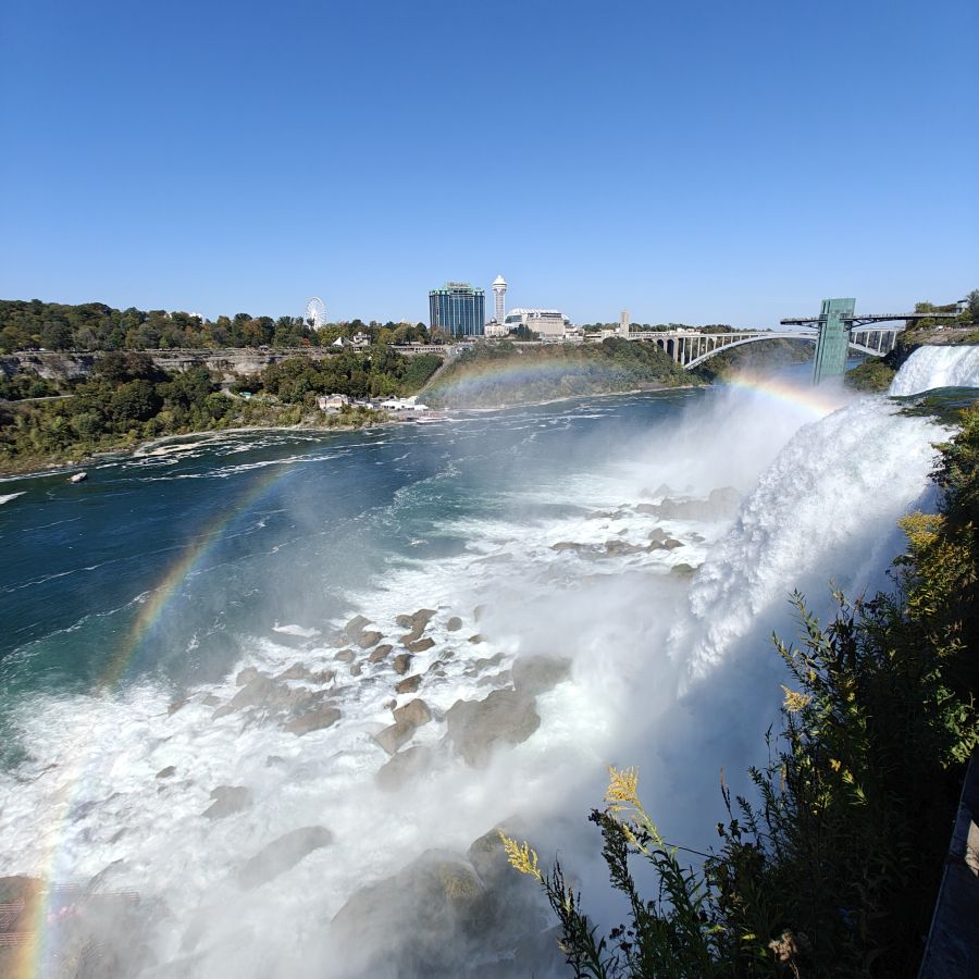 Mike führt uns weiter nach Goat Island zum Aussichtspunkt Richtung American Falls. Dort leuchtet ein Regenbogen mit der strahlend weißen Gischt um die Wette. Dann gehen wir weiter zu den Horseshoe Falls, bei denen wir gestern Abend schon waren. Tagsüber sieht der gebogene Wasserfall ganz anders aus.