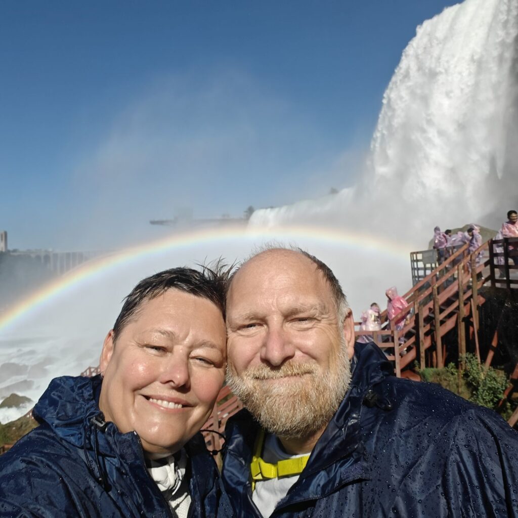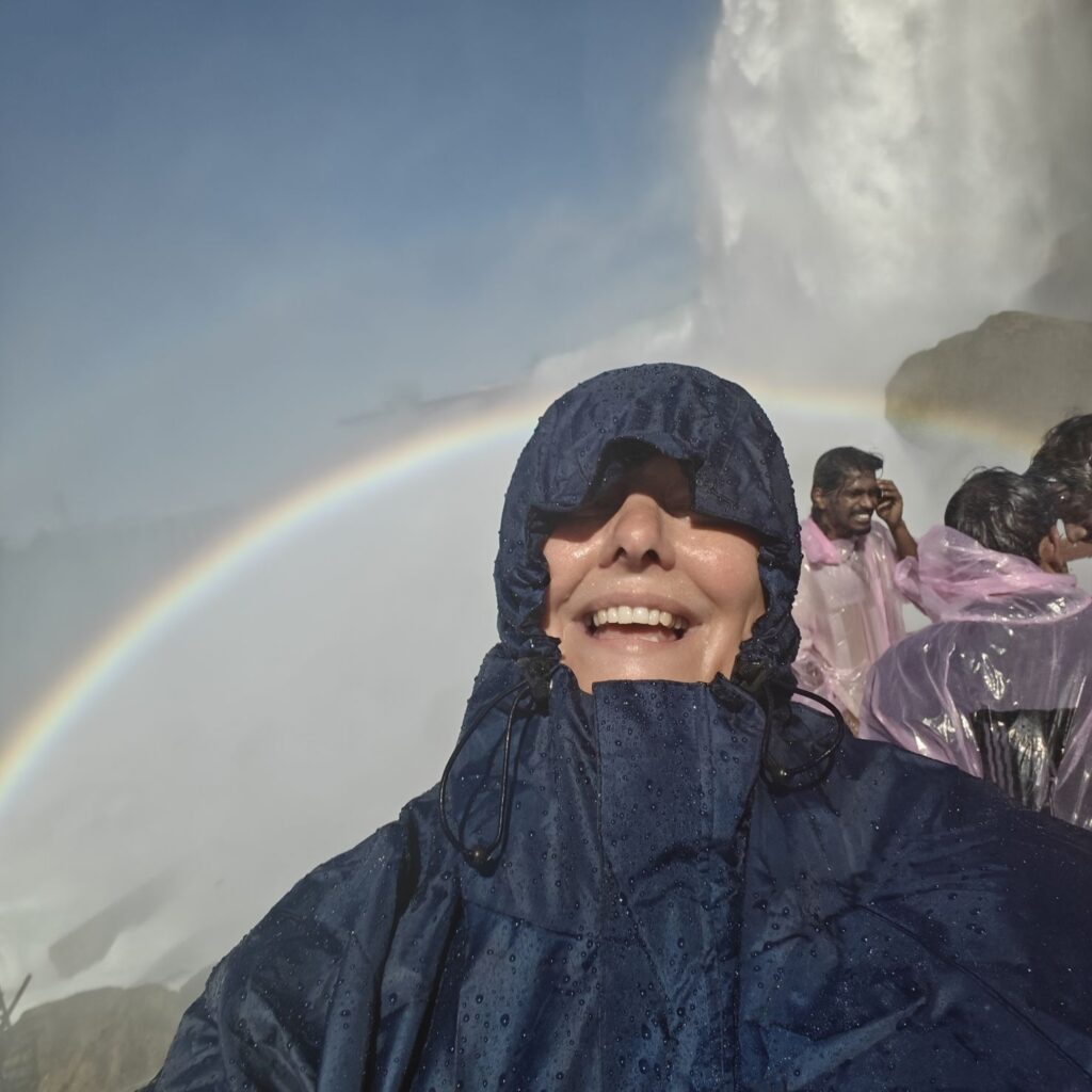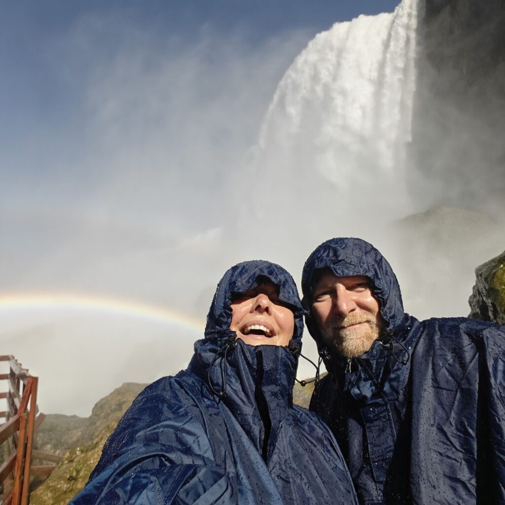 Nach dem Film fahren wir mit dem Aufzug nach unten, bis wir am Fuße der Bridal Veil Falls angekommen sind. Dort warten Holzstege auf uns, die direkt zum Wasserfall führen. Wir ziehen unsere eigenen Regenpelerinen an, denn wir wissen, dass wir hier sonst richtig nass werden. Christoph ist mit Wanderschuhen ausgestattet, Claudia mit Gummistiefeln. Wir wagen uns bis zum Hurricane Deck vor. Hier steht man direkt unter dem Wasserfall und bekommt eine ordentliche Dusche – es macht so richtig Spaß!