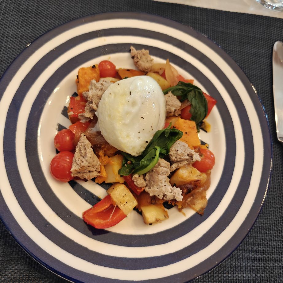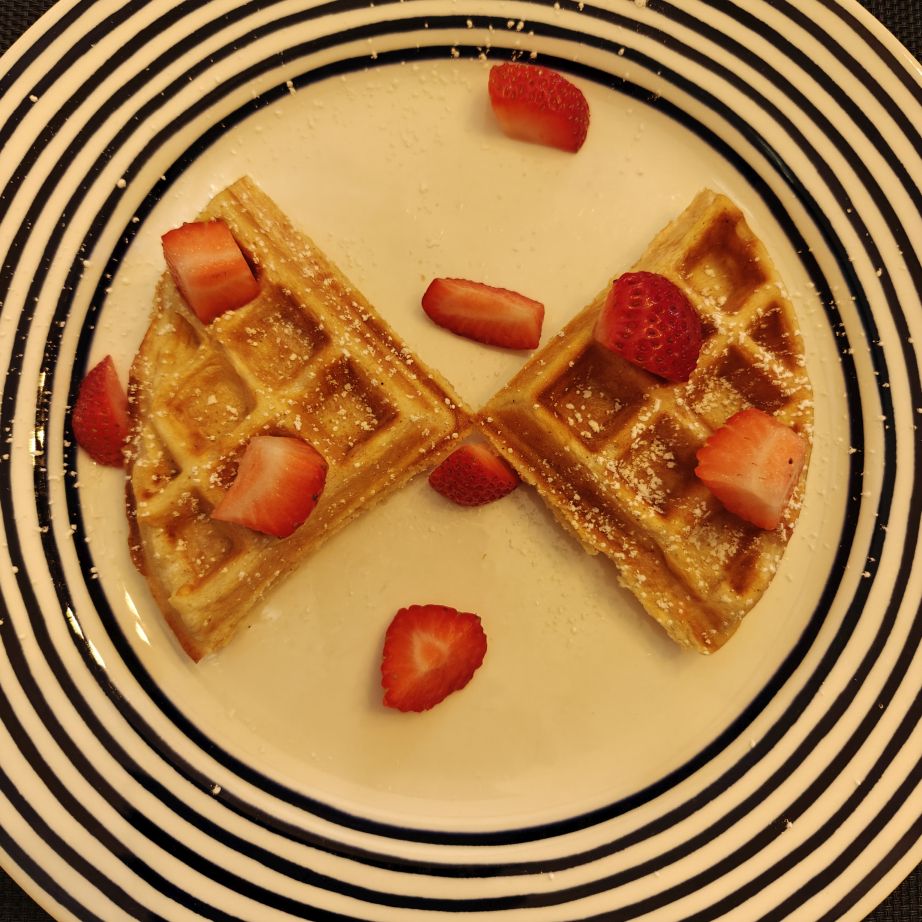 Pünktlich um 8:30 Uhr treffen wir wieder zum gemeinsamen Frühstück zusammen. Heute gibt es Pochierte Eier mit Gemüse und Wurst, als zweiten Gang Waffeln mit Erdbeeren und Ahornsirup.