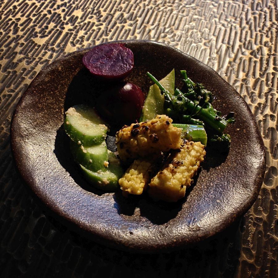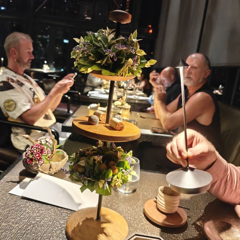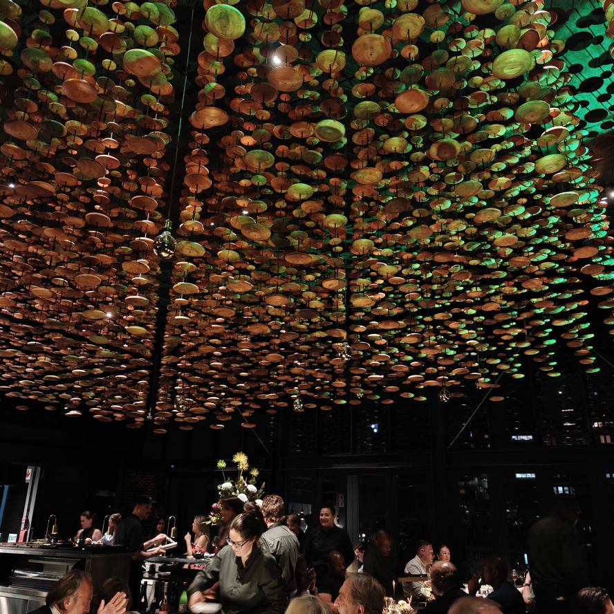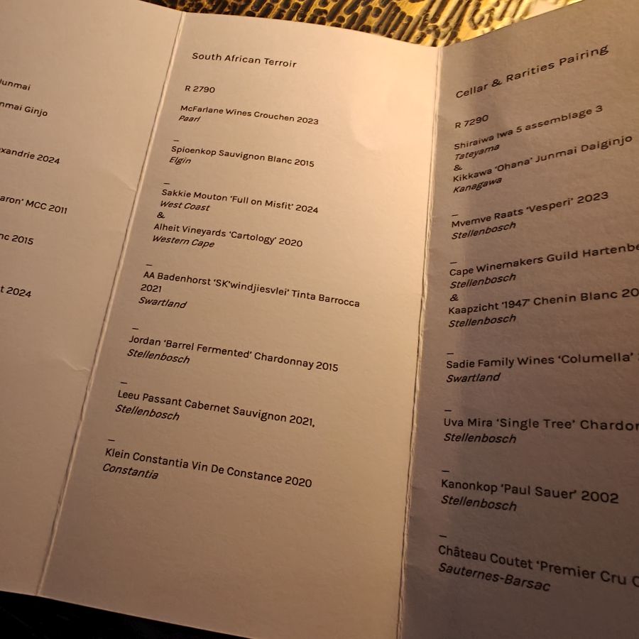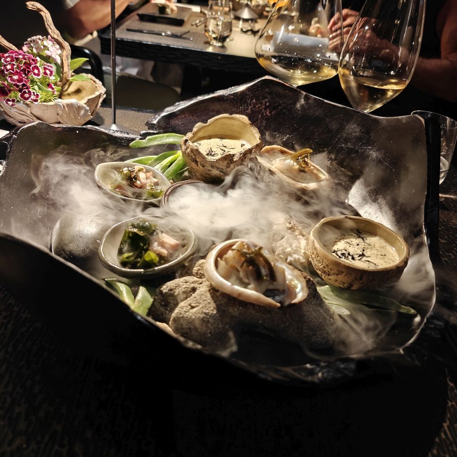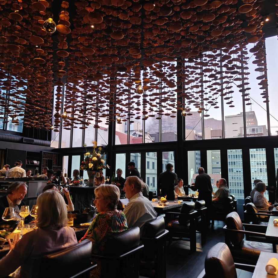 Im Cape Standard machen uns fertig für den Abend. Ein Uber bringt uns zum FYN Restaurant, vor kurzer Zeit noch die Nummer 37 der Welt. Und heuer von World Culinary Awards als Africa’s Best Restaurant ausgezeichnet. Den Tisch haben wir reserviert, als das Datum online gegangen ist, sonst hätten wir keinen Platz bekommen. Der quadratische Raum mit einer originellen Holz-Akustikdecke ist schon gut gefüllt. Wir haben einen großartigen Blick auf den wolkenverhangenen Tafelberg in Abendstimmung. Wir genießen das Experience Menu mit South African Terroir Wine Pairing – ontsagwekkende!