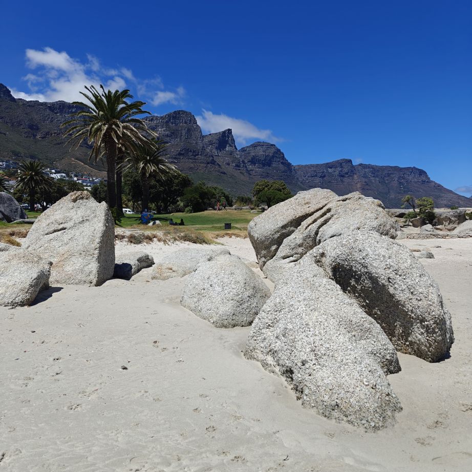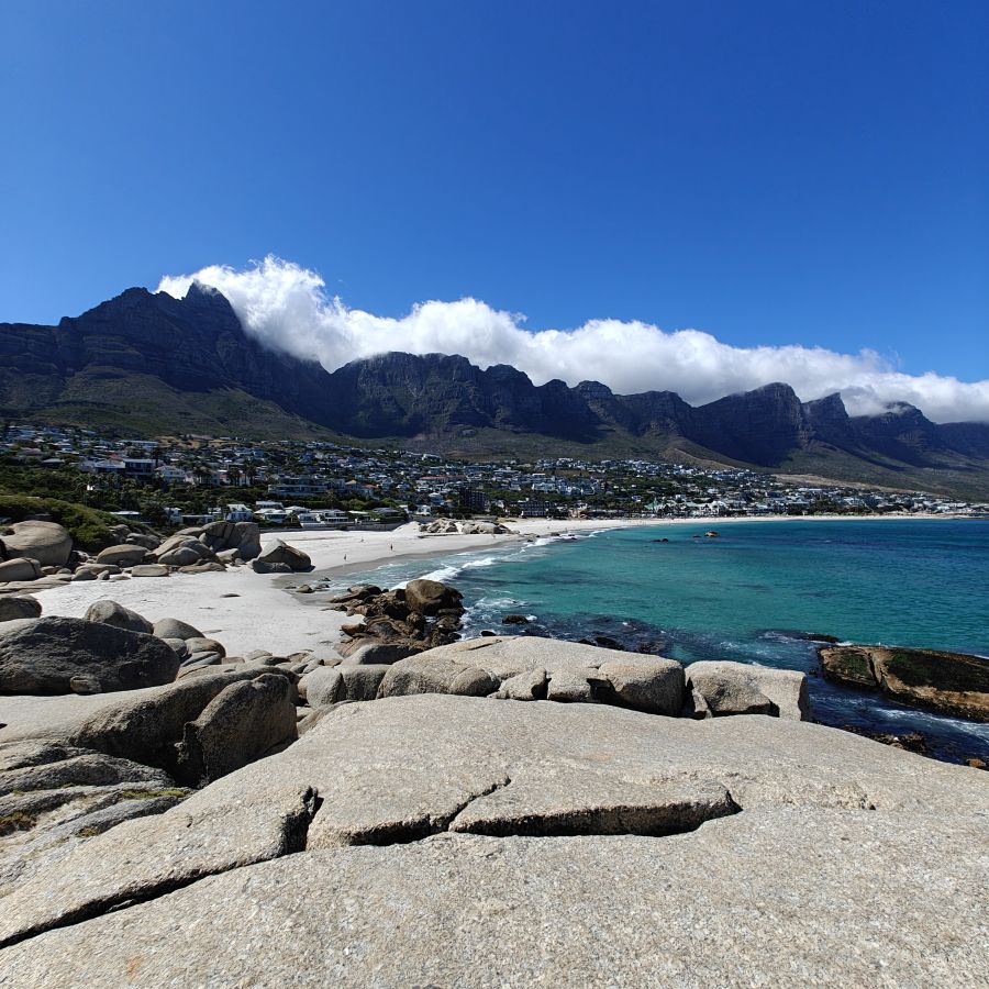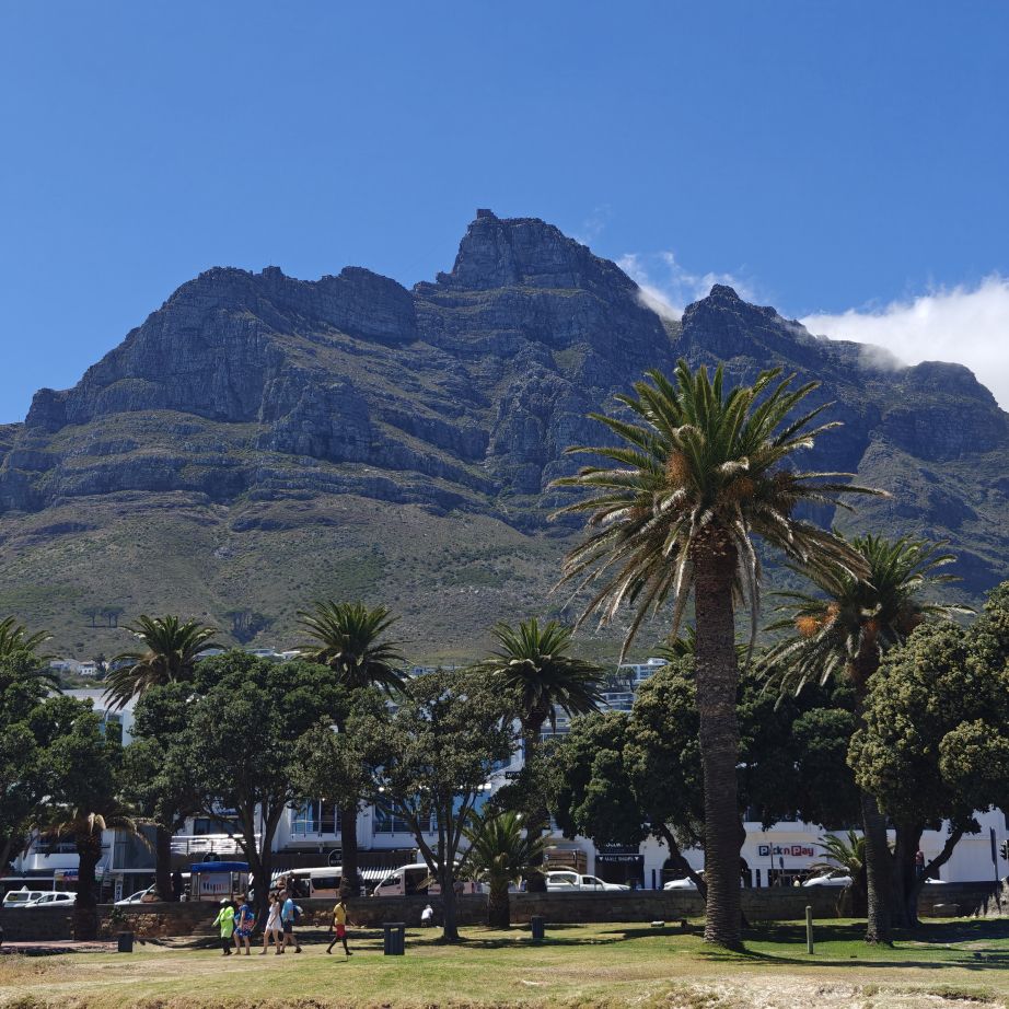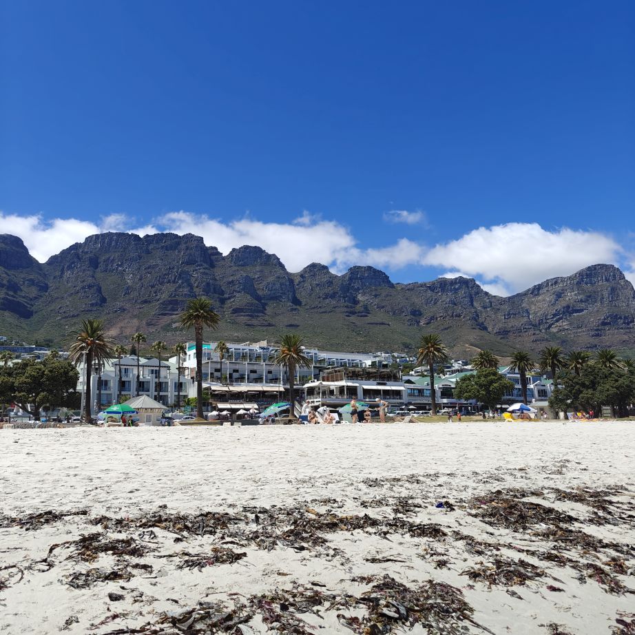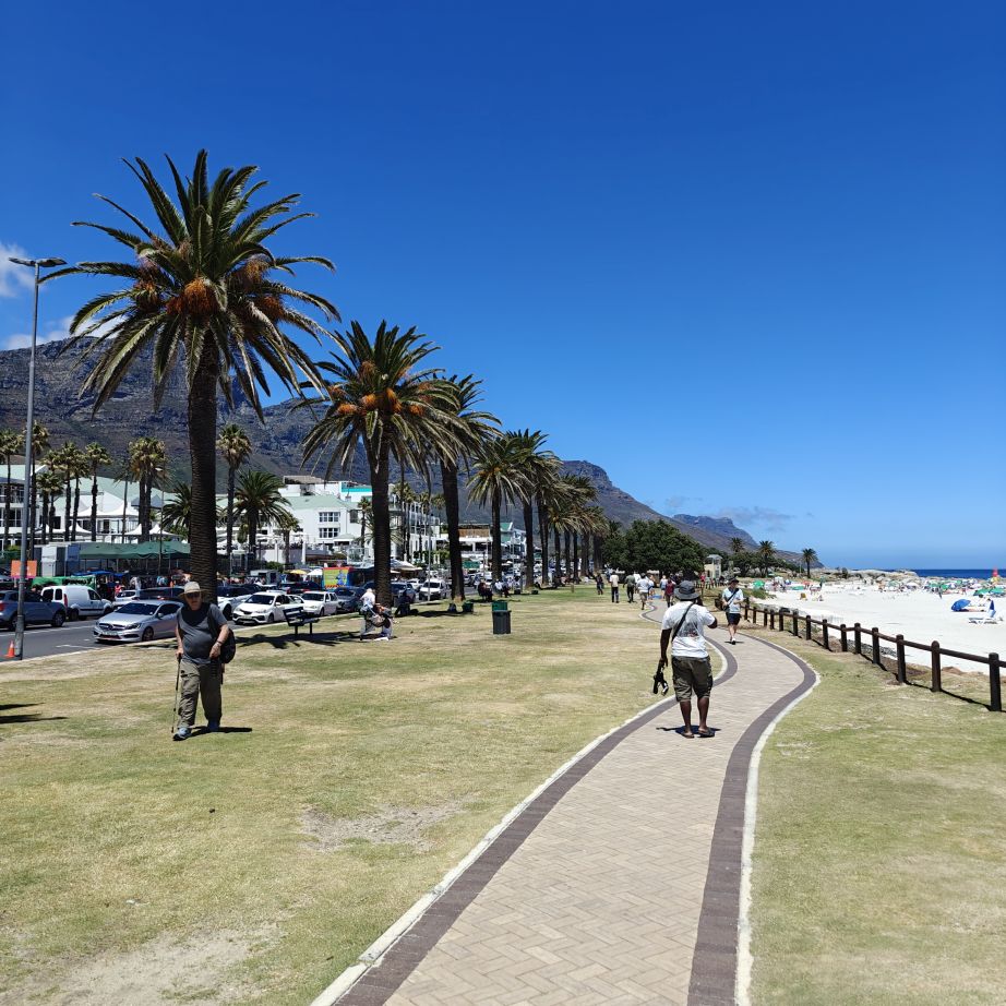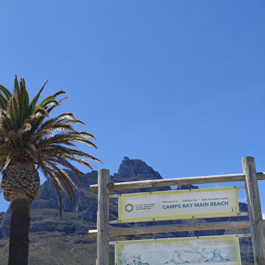 Unsere Koffer sind mitgeflogen, wir werden von einem Shuttle abgeholt, den die Unterkunft organisiert hat. Der Taxifahrer ist gesprächig und erzählt uns Wissenswertes über Kapstadt und zeigt sich sehr an Österreich interessiert. Nach etwa einer Dreiviertelstunde werden wir in der Romney Street abgeliefert. Wir werden die nächsten vier Nächte im Cape Standard Guest House verbringen. es befindet sich im Green Point Viertel und ist eine kleine Oase inmitten der Stadt – mit Pool und vielen Pflanzen. Wir werden freundlich von Tino empfangen und stellen unsere Koffer ab – das Zimmer können wir noch nicht beziehen. Die Sonne scheint und es ist sehr warm – was für eine Wohltat. Wir ziehen uns um und rufen ein Uber, das uns in den noblen Vorort Camps Bay bringt.