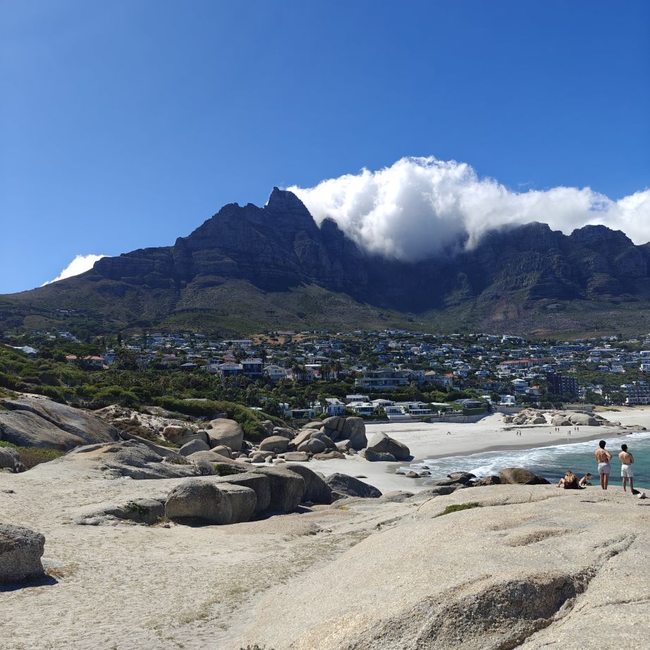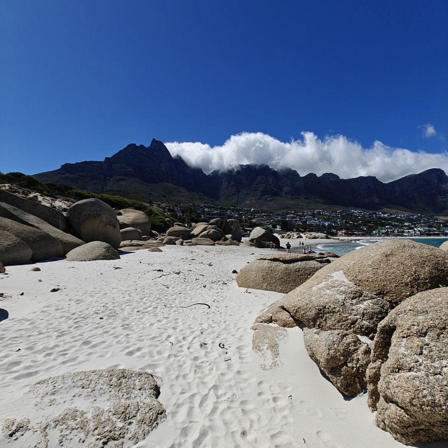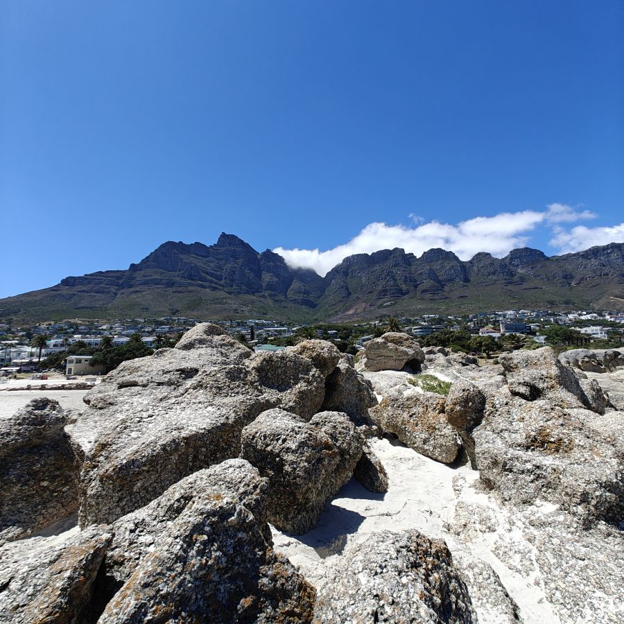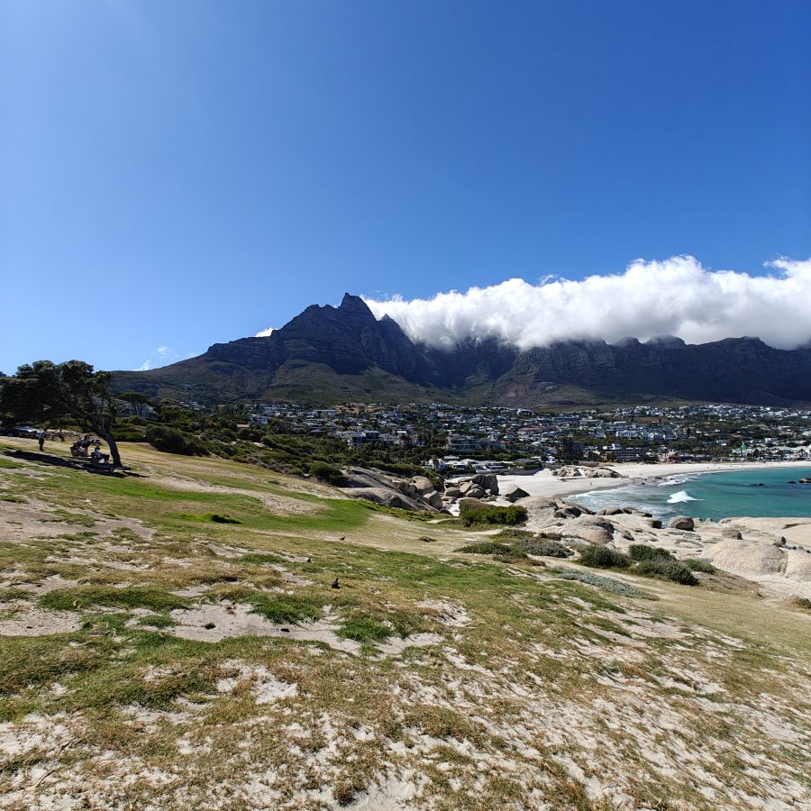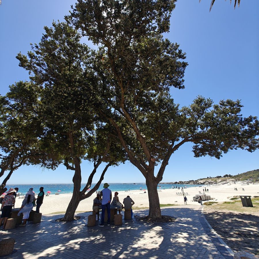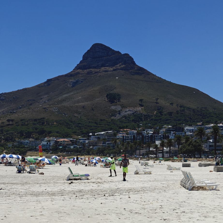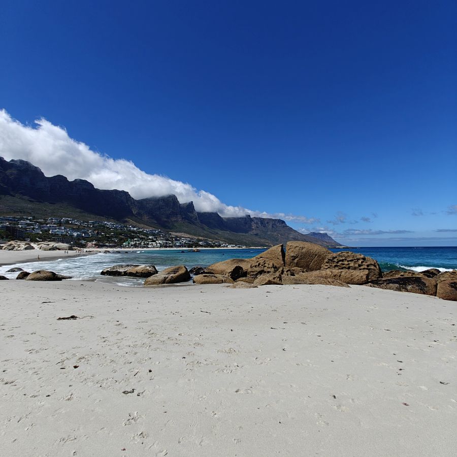 Unsere Koffer sind mitgeflogen, wir werden von einem Shuttle abgeholt, den die Unterkunft organisiert hat. Der Taxifahrer ist gesprächig und erzählt uns Wissenswertes über Kapstadt und zeigt sich sehr an Österreich interessiert. Nach etwa einer Dreiviertelstunde werden wir in der Romney Street abgeliefert. Wir werden die nächsten vier Nächte im Cape Standard Guest House verbringen. es befindet sich im Green Point Viertel und ist eine kleine Oase inmitten der Stadt – mit Pool und vielen Pflanzen. Wir werden freundlich von Tino empfangen und stellen unsere Koffer ab – das Zimmer können wir noch nicht beziehen. Die Sonne scheint und es ist sehr warm – was für eine Wohltat. Wir ziehen uns um und rufen ein Uber, das uns in den noblen Vorort Camps Bay bringt.