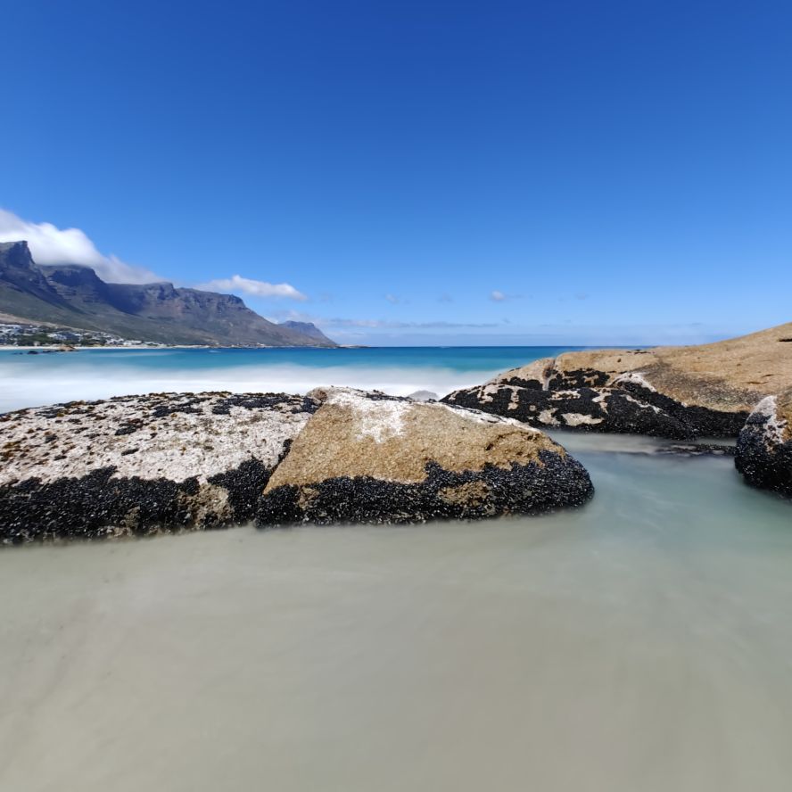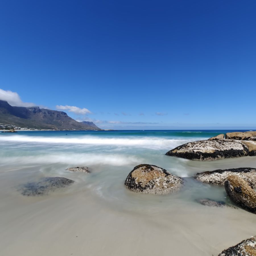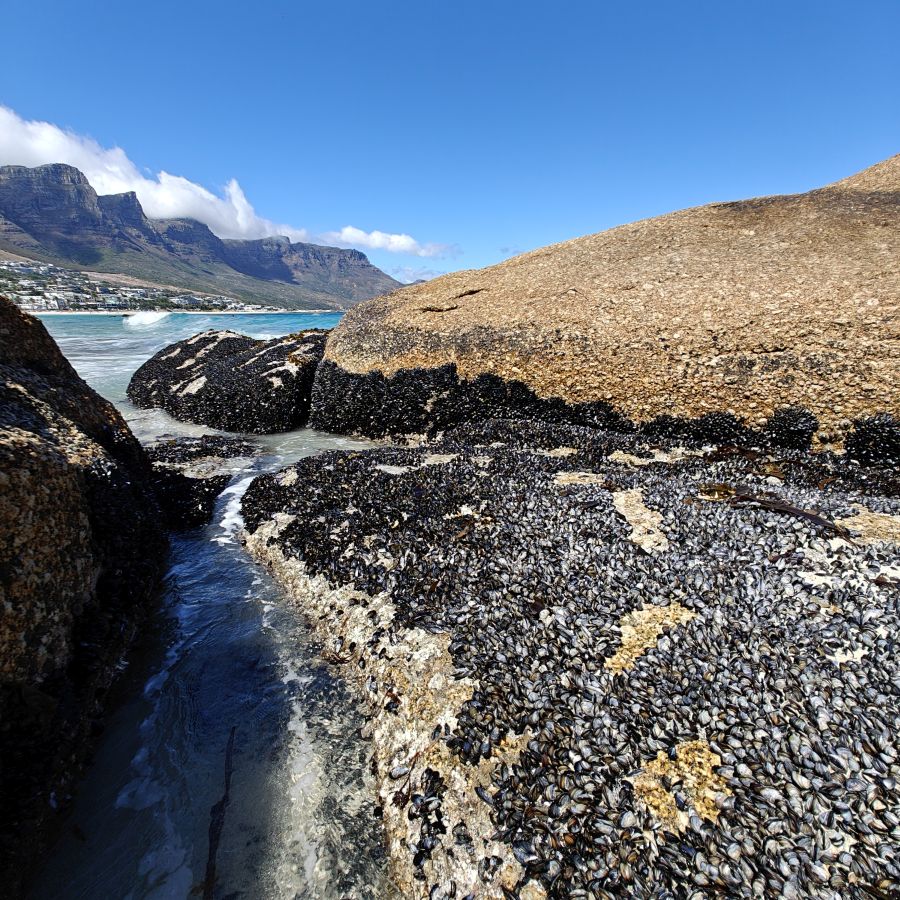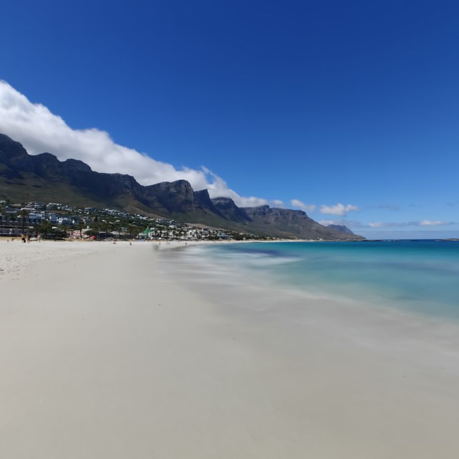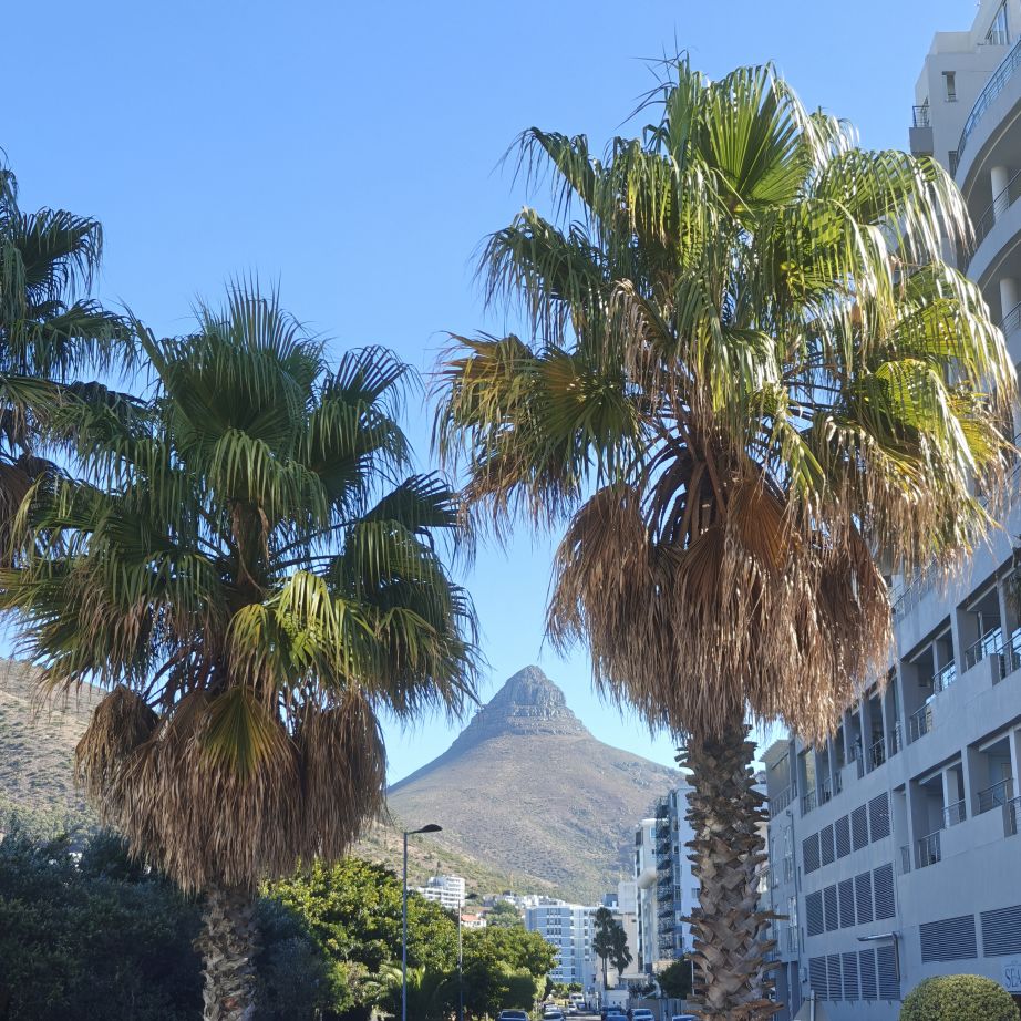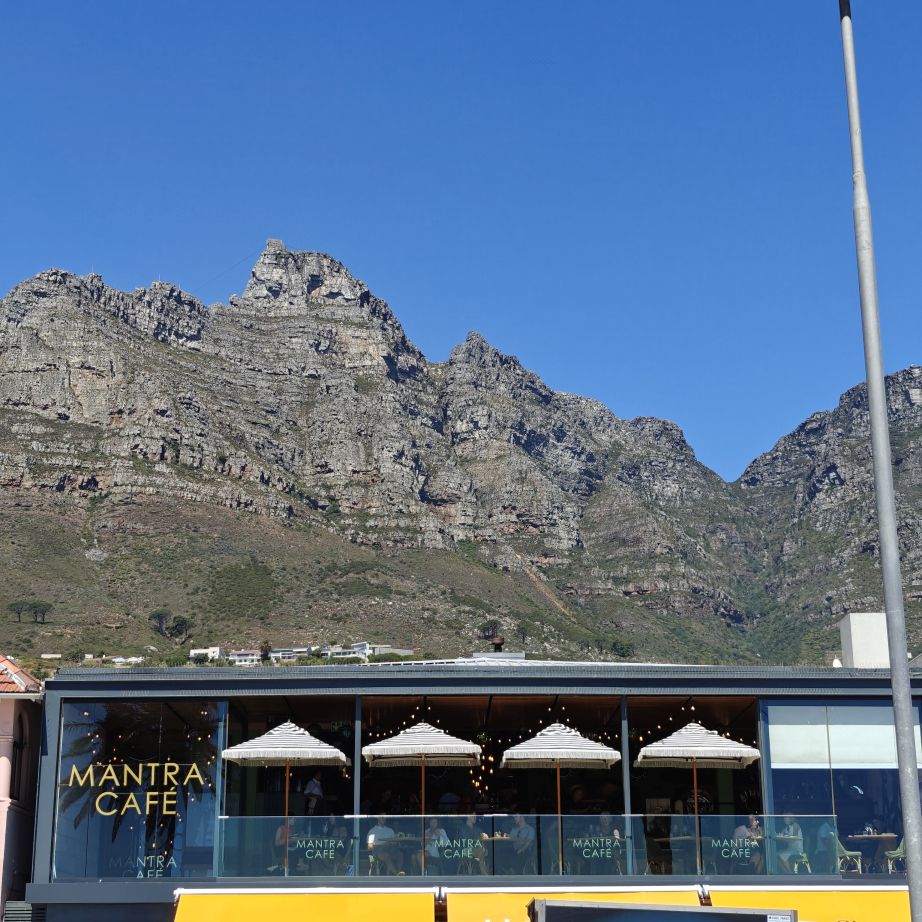Unsere Koffer sind mitgeflogen, wir werden von einem Shuttle abgeholt, den die Unterkunft organisiert hat. Der Taxifahrer ist gesprächig und erzählt uns Wissenswertes über Kapstadt und zeigt sich sehr an Österreich interessiert. Nach etwa einer Dreiviertelstunde werden wir in der Romney Street abgeliefert. Wir werden die nächsten vier Nächte im Cape Standard Guest House verbringen. es befindet sich im Green Point Viertel und ist eine kleine Oase inmitten der Stadt – mit Pool und vielen Pflanzen. Wir werden freundlich von Tino empfangen und stellen unsere Koffer ab – das Zimmer können wir noch nicht beziehen. Die Sonne scheint und es ist sehr warm – was für eine Wohltat. Wir ziehen uns um und rufen ein Uber, das uns in den noblen Vorort Camps Bay bringt.