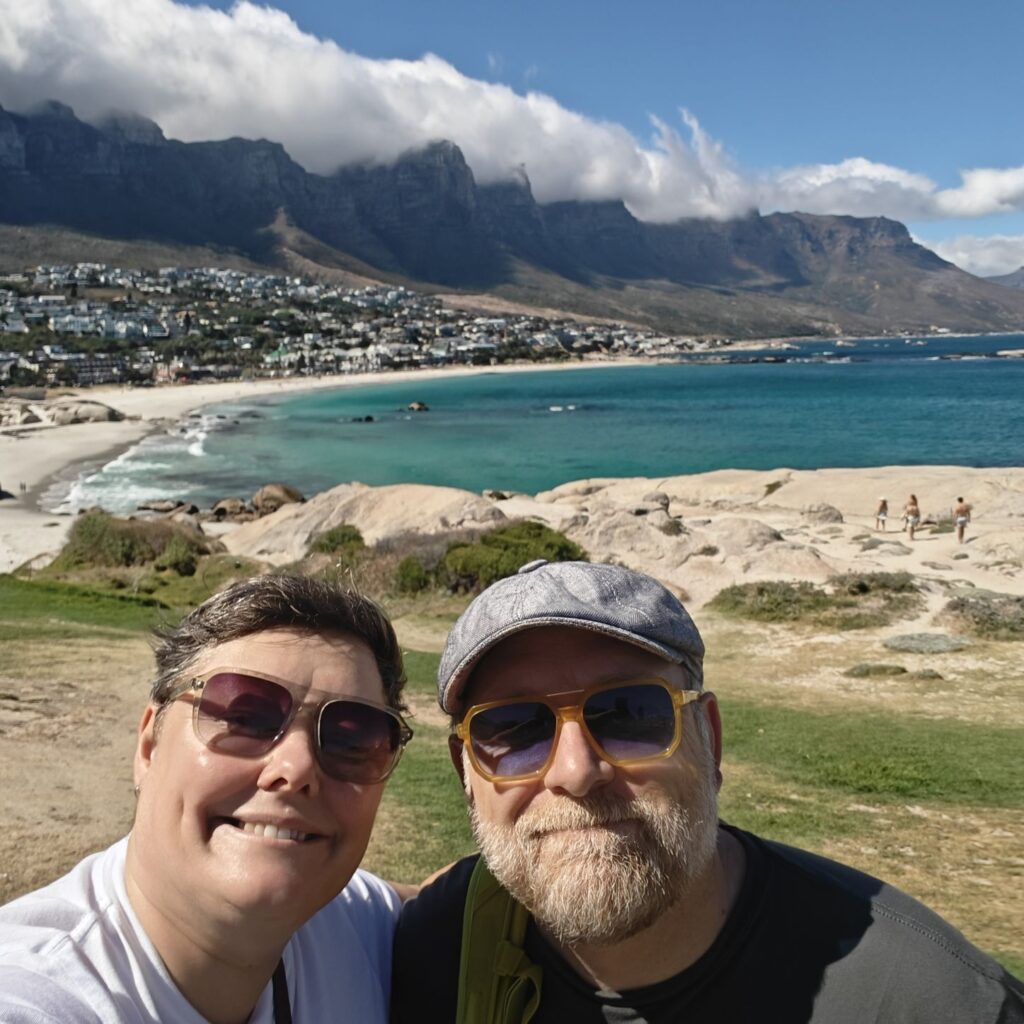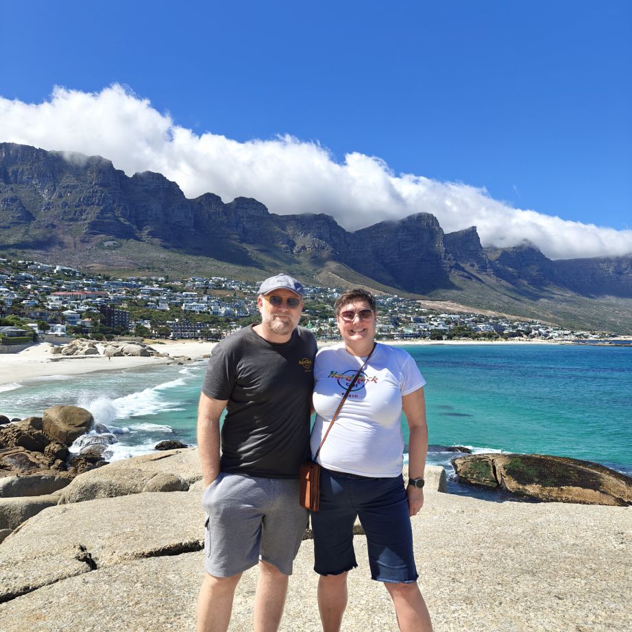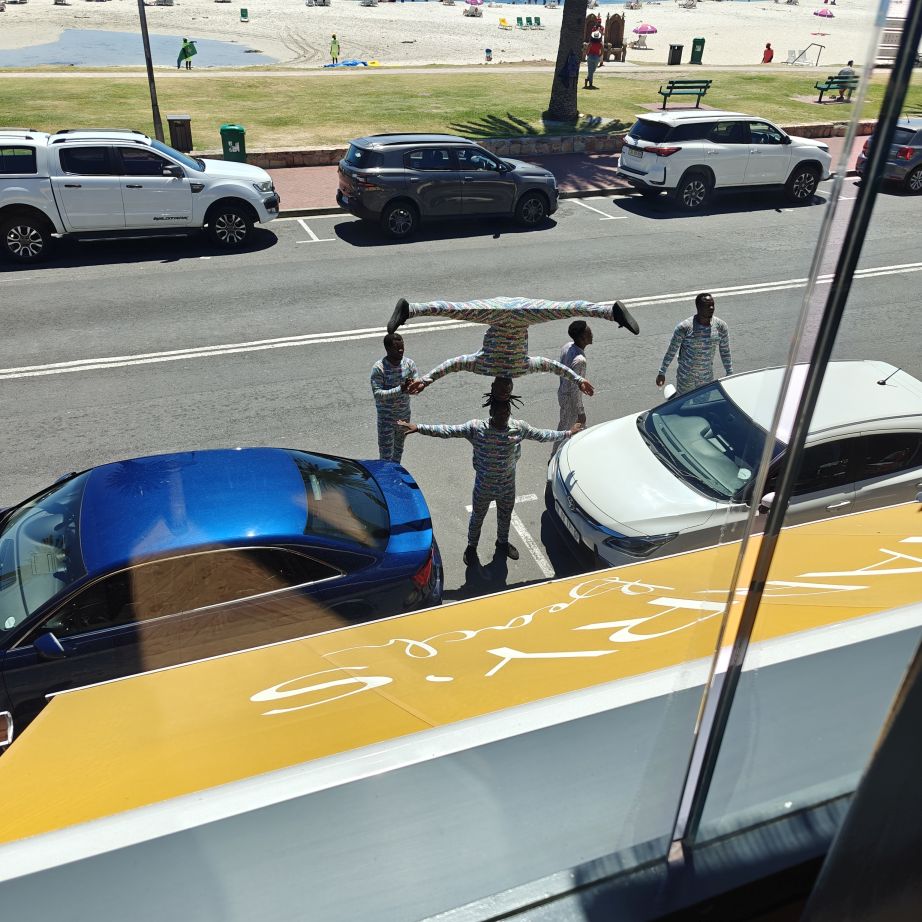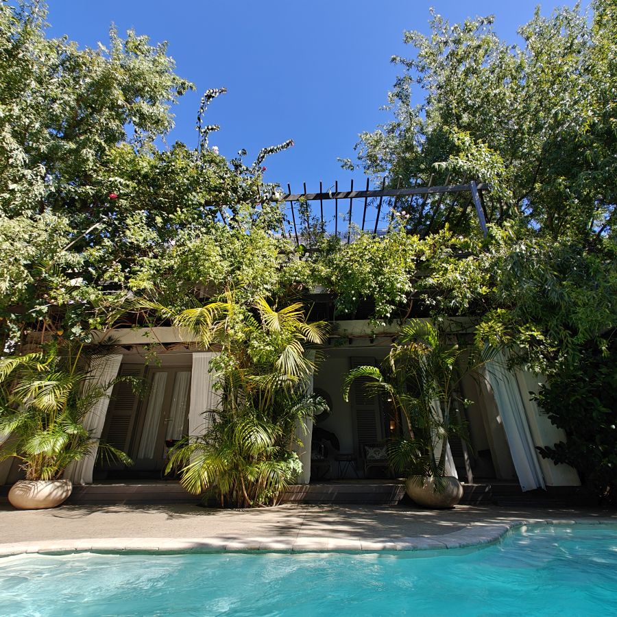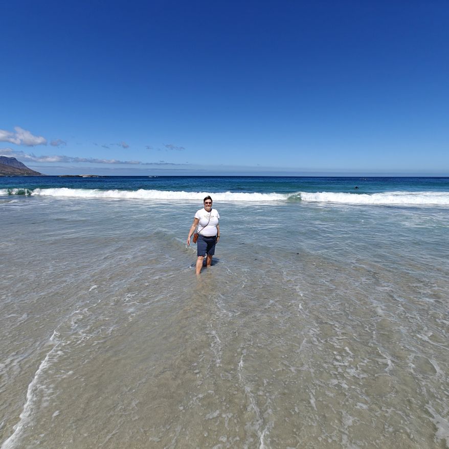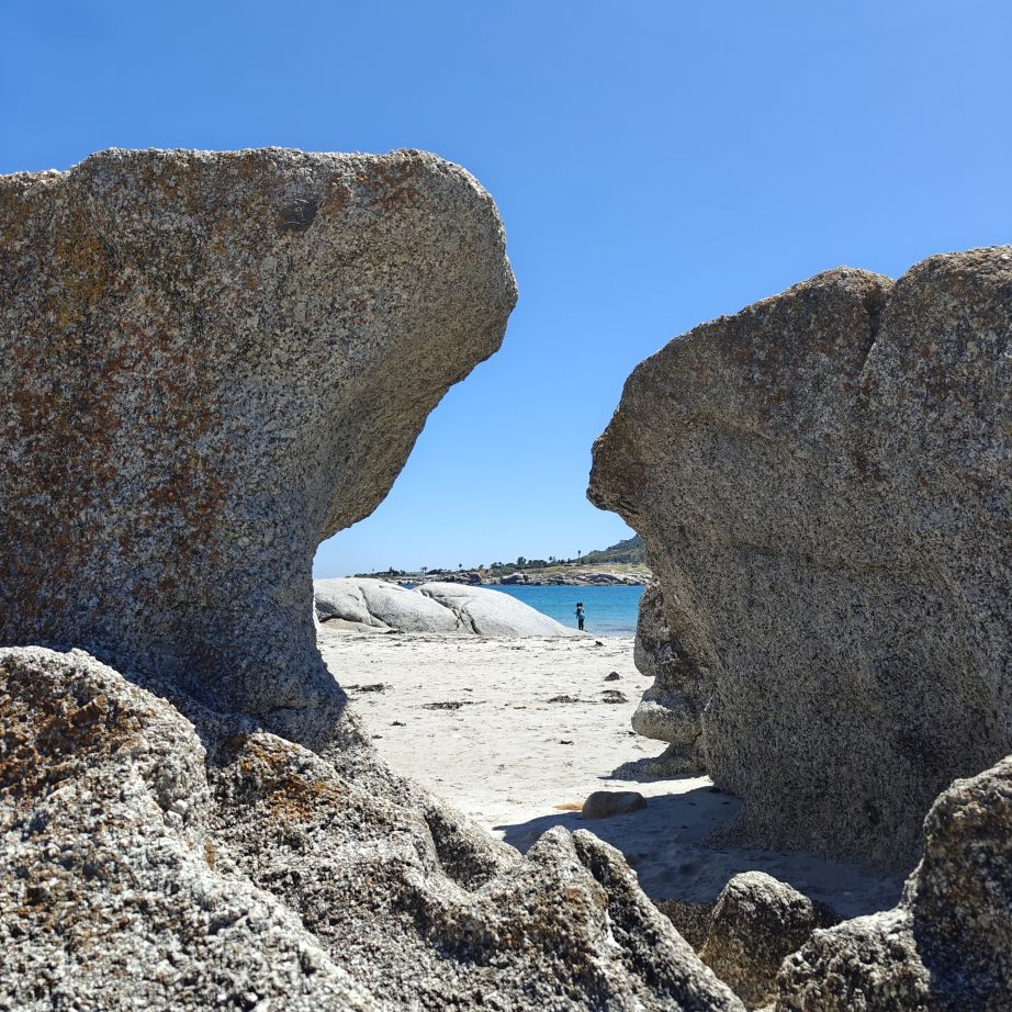 Unsere Koffer sind mitgeflogen, wir werden von einem Shuttle abgeholt, den die Unterkunft organisiert hat. Der Taxifahrer ist gesprächig und erzählt uns Wissenswertes über Kapstadt und zeigt sich sehr an Österreich interessiert. Nach etwa einer Dreiviertelstunde werden wir in der Romney Street abgeliefert. Wir werden die nächsten vier Nächte im Cape Standard Guest House verbringen. es befindet sich im Green Point Viertel und ist eine kleine Oase inmitten der Stadt – mit Pool und vielen Pflanzen. Wir werden freundlich von Tino empfangen und stellen unsere Koffer ab – das Zimmer können wir noch nicht beziehen. Die Sonne scheint und es ist sehr warm – was für eine Wohltat. Wir ziehen uns um und rufen ein Uber, das uns in den noblen Vorort Camps Bay bringt.