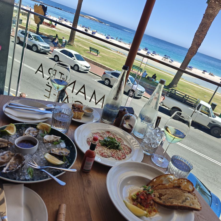 Wir essen Austern, Kudu Capaccio, Thunfischtartar, Haifischsteak und Line Fish mit Zitronensauce im Mantra Cafe und trinken dazu südafrikanischen Chardonnay – die lewe is mooi! Zum Abschluss probieren wir noch die südafrikanische Nationaldessert Malva Pudding.