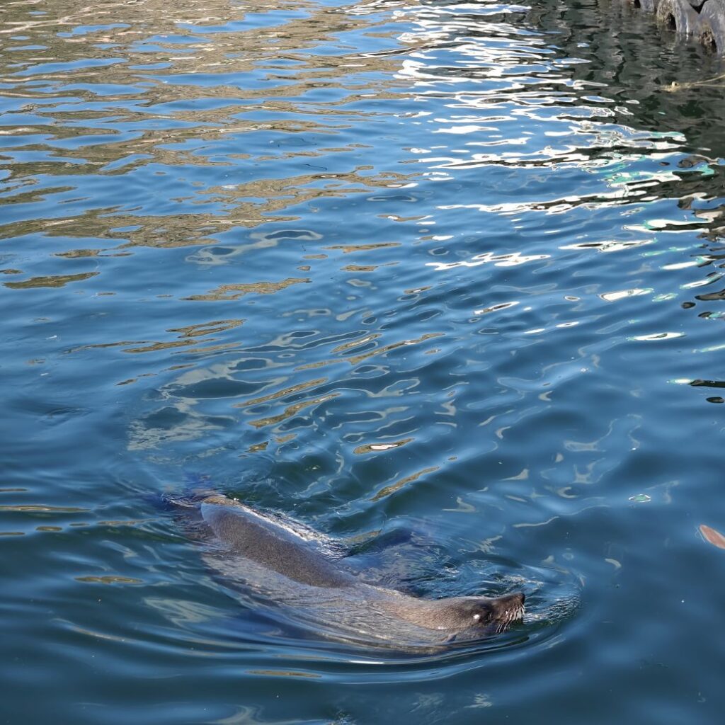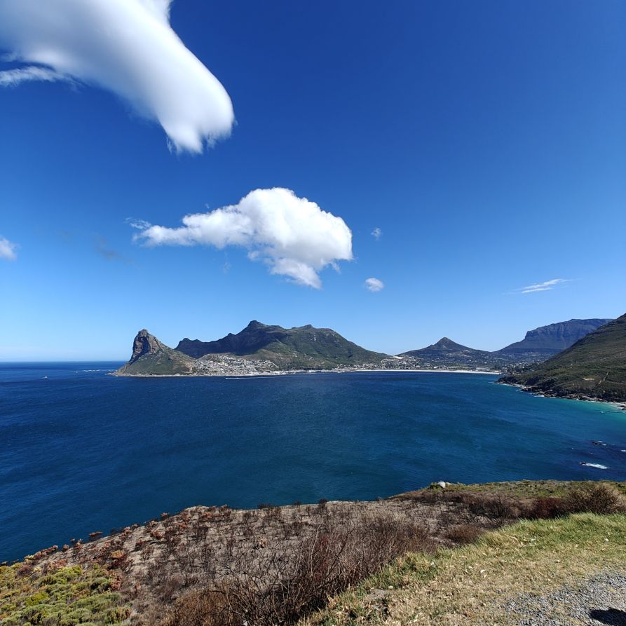 Wir fahren über Camps Bay nach Hout Bay, unser Guide Pamela macht gleich einmal eine Vorstellrunde im Bus, wir sind mit einem deutschen Pärchen, einem etwas schrägen Typen aus San Francisco, einer Japanerin und einem Japaner unterwegs. In Camps Bay steigen wir am Aussichtspunkt aus, den wir schon am Freitag besucht haben. Die Sicht ist phänomenal, uns verbläst aber fast der Wind, der heute mehr als lebhaft weht.
