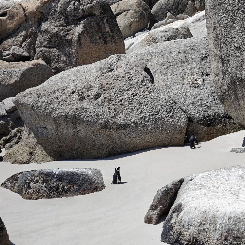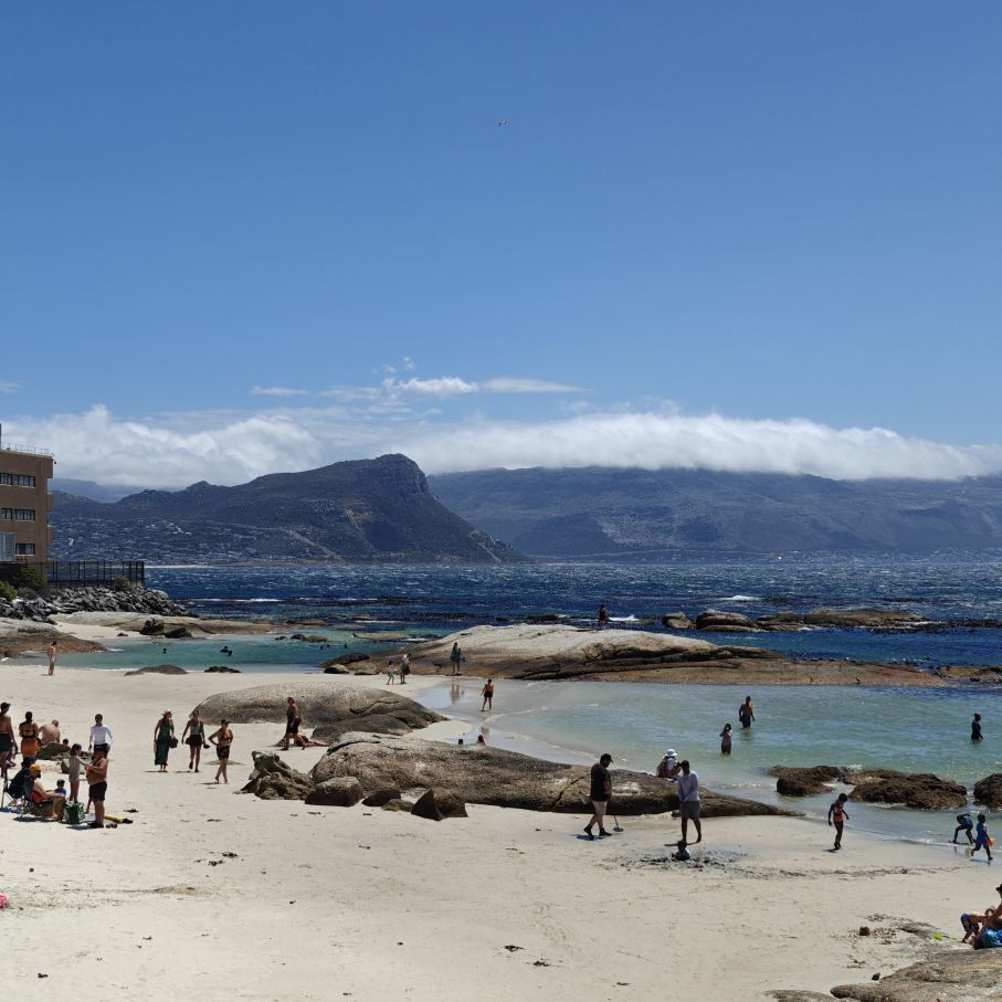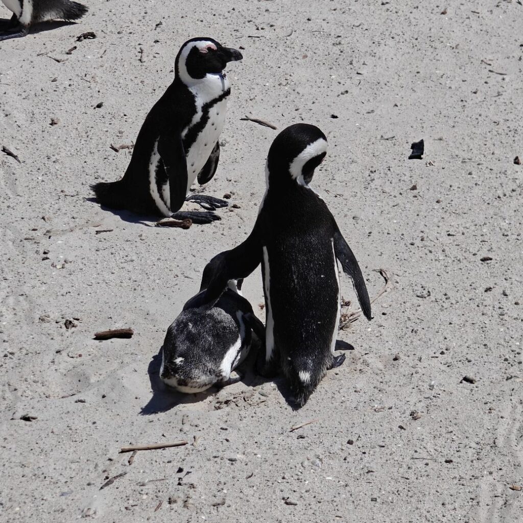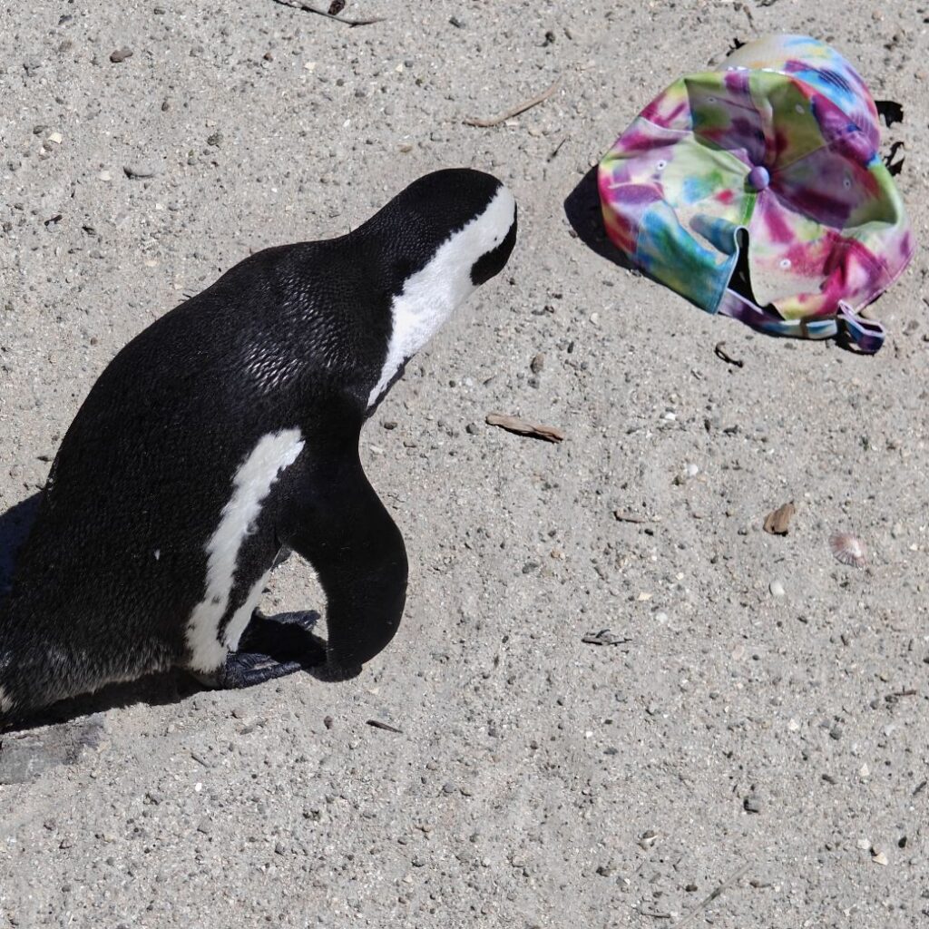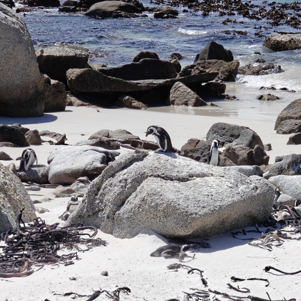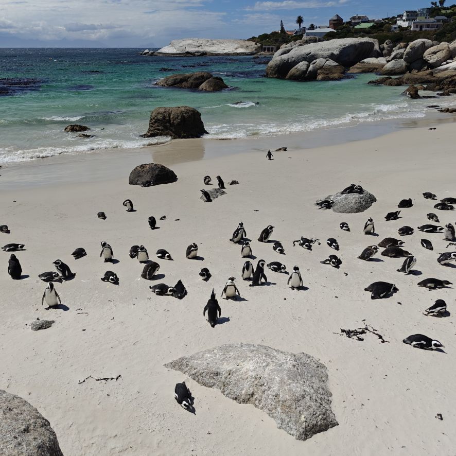 Die nächste Station ist der Boulders Beach in Simon’s Town auf der Kap-Halbinsel. Dort gehen wir auf Tuchfühlung mit afrikanischen Pinguinen. Nebenbei wird Claudias in New York erstandenes Baseballcap vom Wind erfasst und mitten in die Vogelkolonie geblasen. Ganz in der Nähe gehen wir im Saveur Restaurant Simonstown Mittagessen. Wir essen Catch of the Day, heute Thunfisch, mit viel Gemüse und Babyspinat. Dazu trinken wir herrlichen Chenin Blanc und lernen dabei den Rest der Reisgruppe etwas besser kennen.