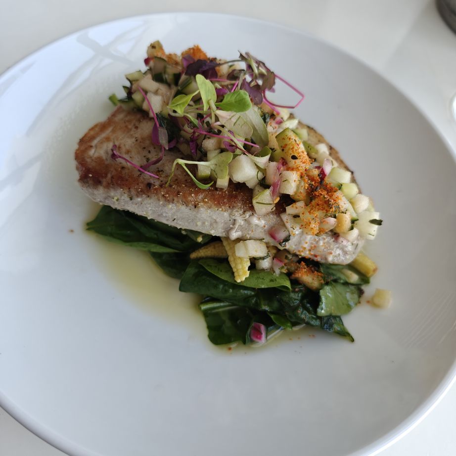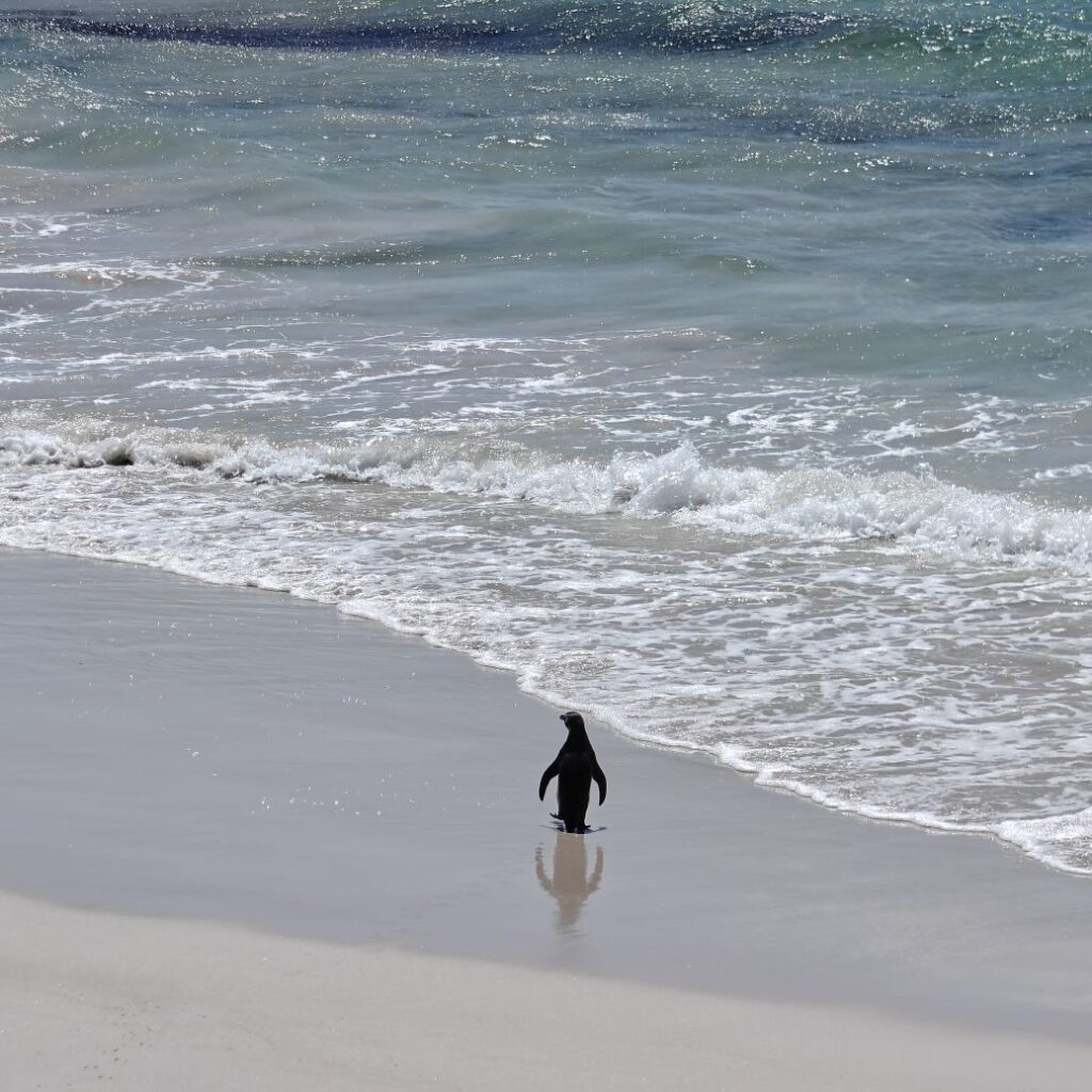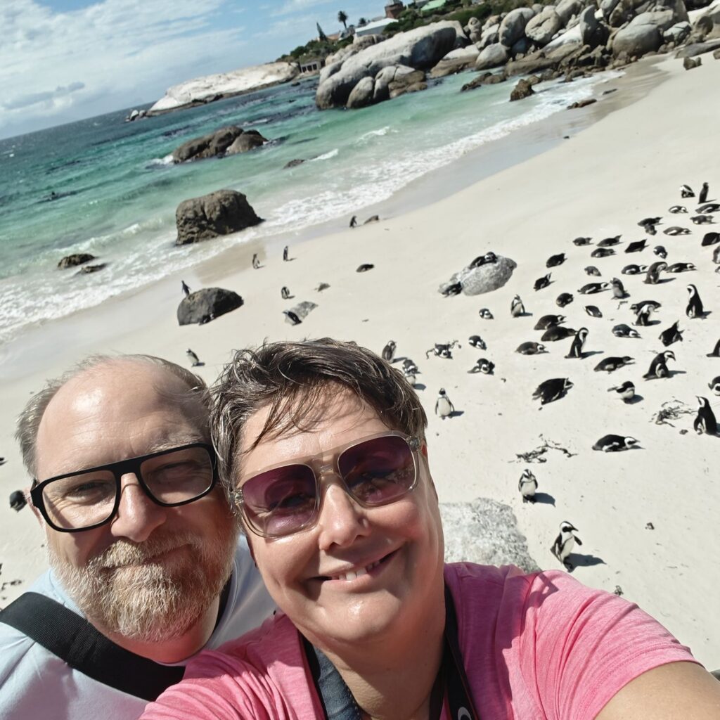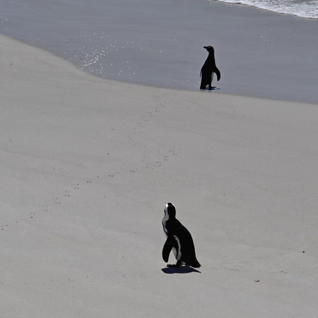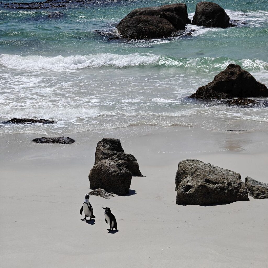 Die nächste Station ist der Boulders Beach in Simon’s Town auf der Kap-Halbinsel. Dort gehen wir auf Tuchfühlung mit afrikanischen Pinguinen. Nebenbei wird Claudias in New York erstandenes Baseballcap vom Wind erfasst und mitten in die Vogelkolonie geblasen. Ganz in der Nähe gehen wir im Saveur Restaurant Simonstown Mittagessen. Wir essen Catch of the Day, heute Thunfisch, mit viel Gemüse und Babyspinat. Dazu trinken wir herrlichen Chenin Blanc und lernen dabei den Rest der Reisgruppe etwas besser kennen.