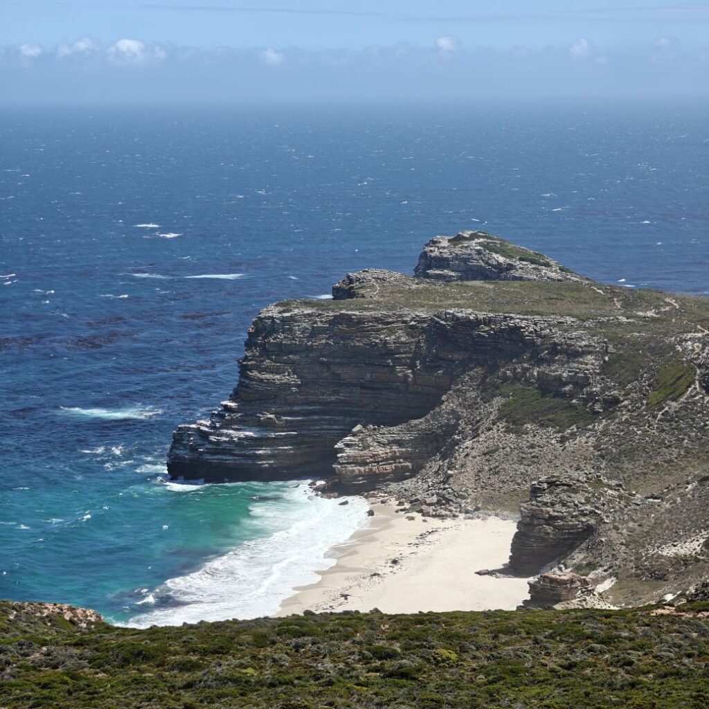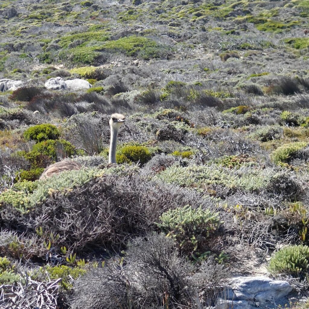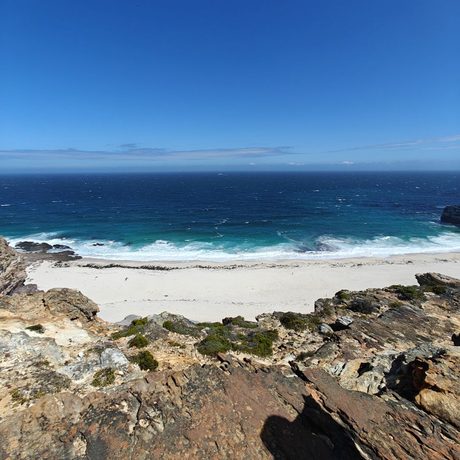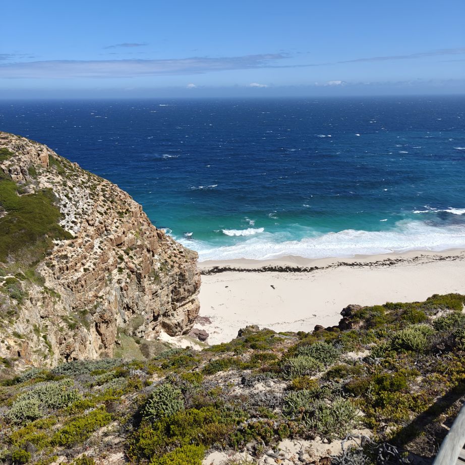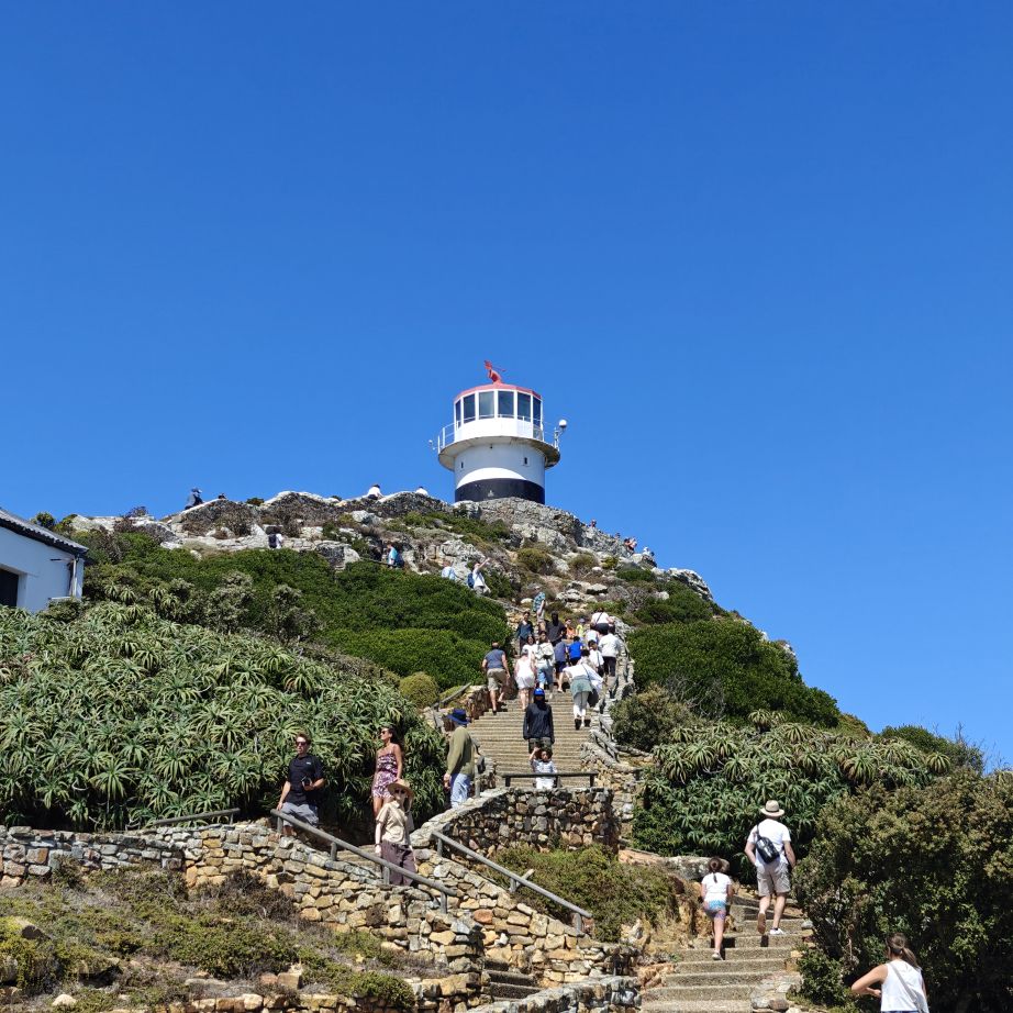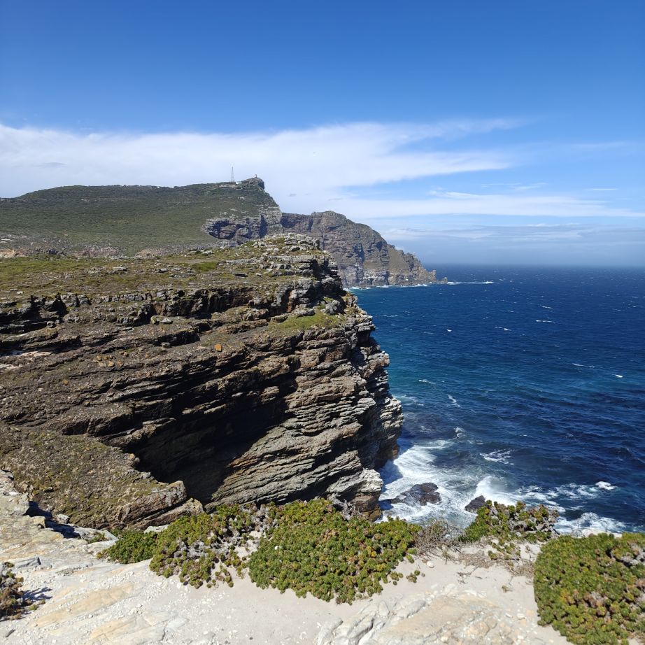 Gestärkt fahren wir weiter nach Süden zum Cape of Good Hope Nature Reserve. Dort besichtigen wir zuerst Cape Point Lighthouse und gehen dann zu Fuß oberhalb des Diaz Beach zum Cape of Good Hope. Der Wind weht streng, wir müssen doppelt aufpassen, wo wir hinsteigen, denn die Böen haben es in sich. Nach einer kleinen Klettereinlage befinden wir uns am südwestlichsten Punkt des Afrikanischen Kontinents und haben einen atemberaubenden Ausblick auf die Kap-Halbinsel. Auf dem Weg begegnen wir freilebenden Straußen und Antilopen.