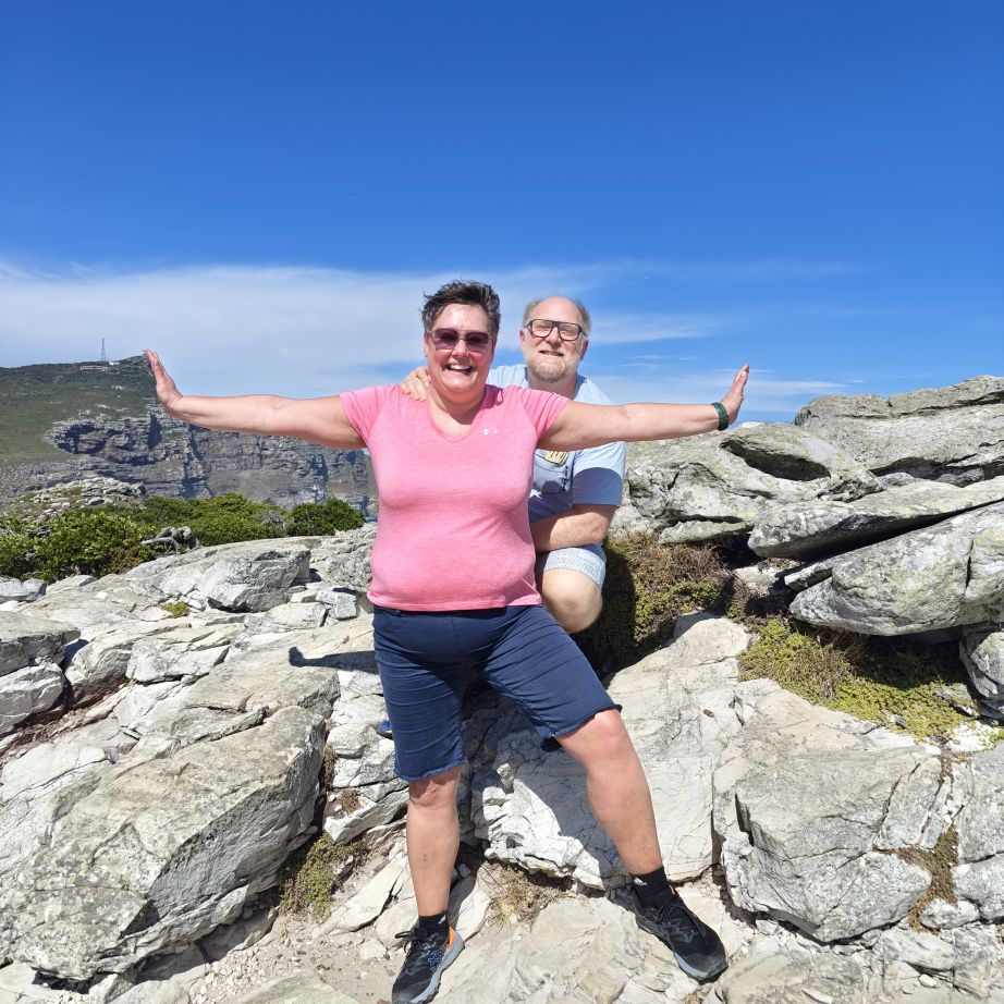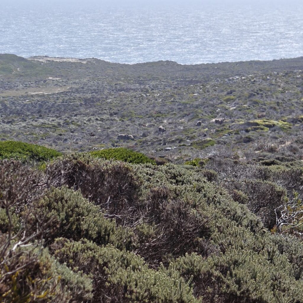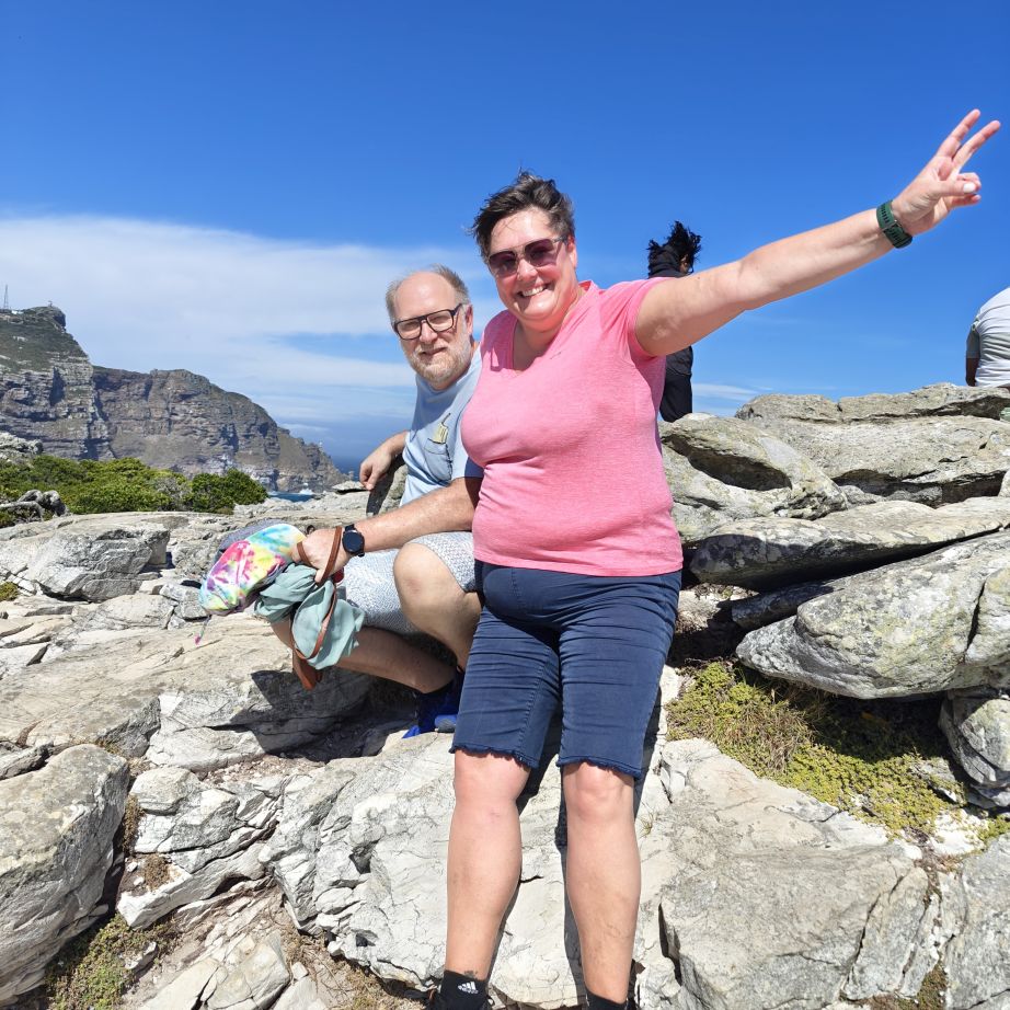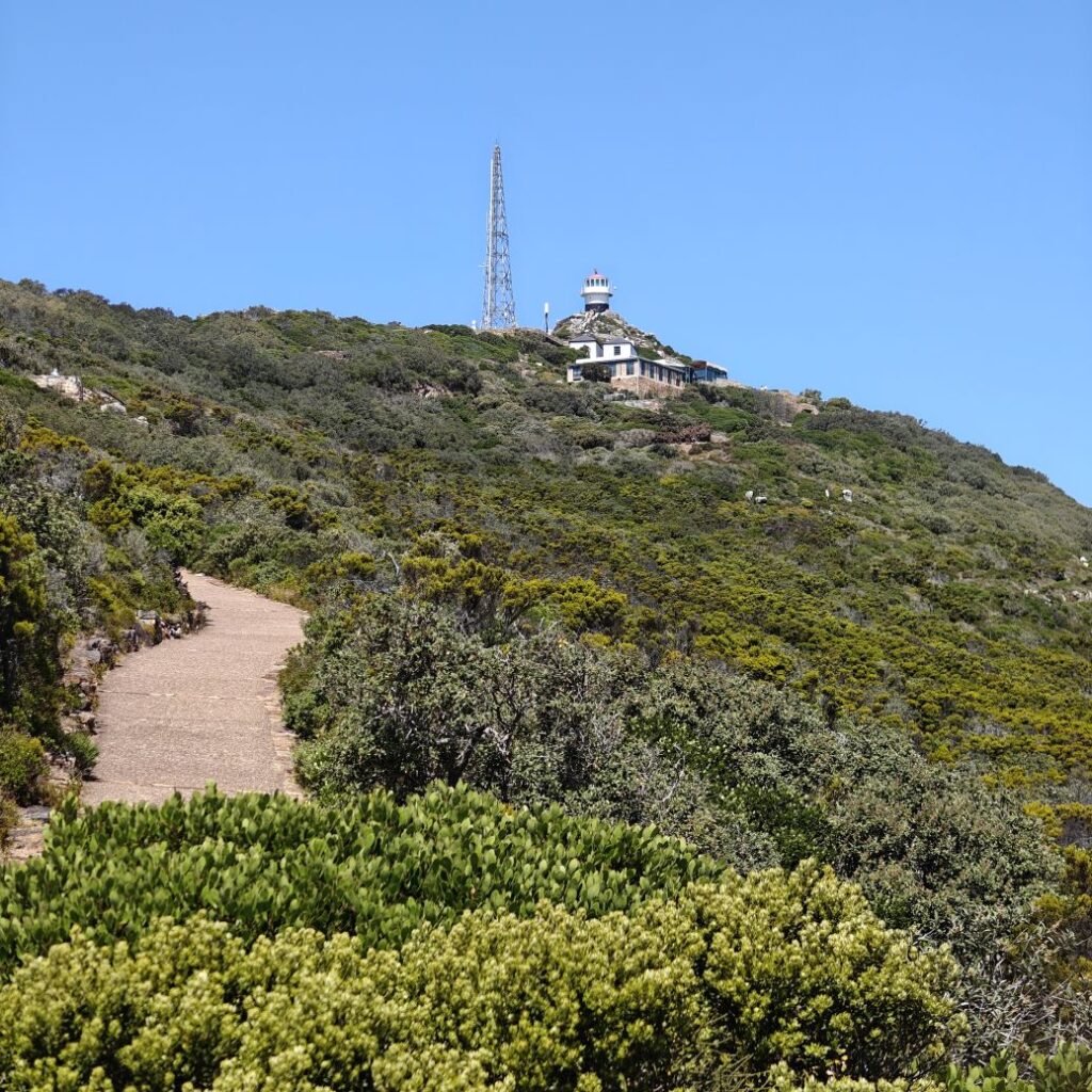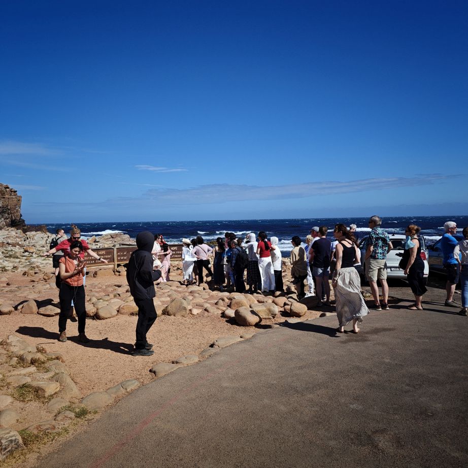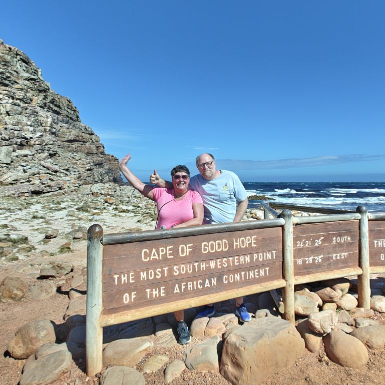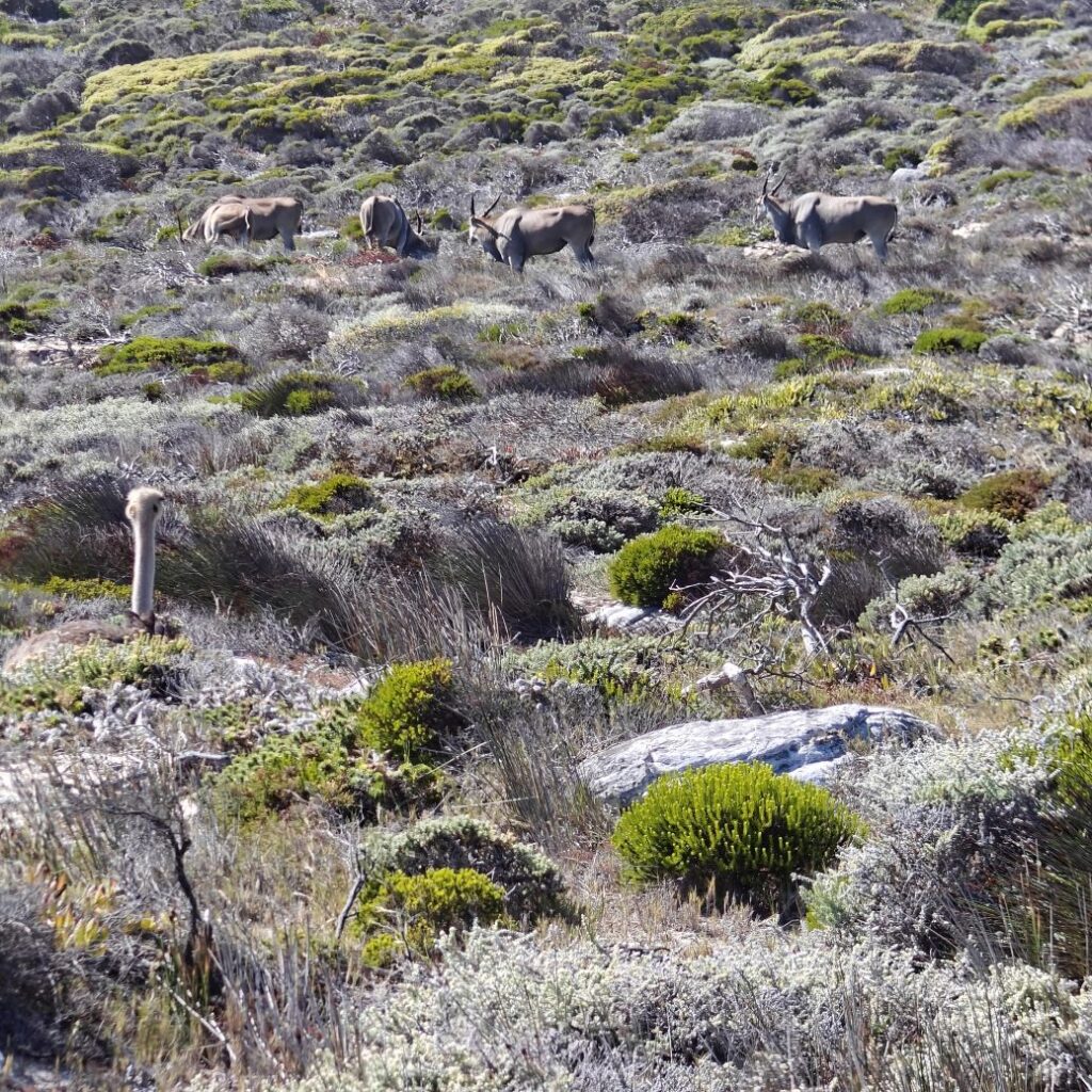 Gestärkt fahren wir weiter nach Süden zum Cape of Good Hope Nature Reserve. Dort besichtigen wir zuerst Cape Point Lighthouse und gehen dann zu Fuß oberhalb des Diaz Beach zum Cape of Good Hope. Der Wind weht streng, wir müssen doppelt aufpassen, wo wir hinsteigen, denn die Böen haben es in sich. Nach einer kleinen Klettereinlage befinden wir uns am südwestlichsten Punkt des Afrikanischen Kontinents und haben einen atemberaubenden Ausblick auf die Kap-Halbinsel. Auf dem Weg begegnen wir freilebenden Straußen und Antilopen.